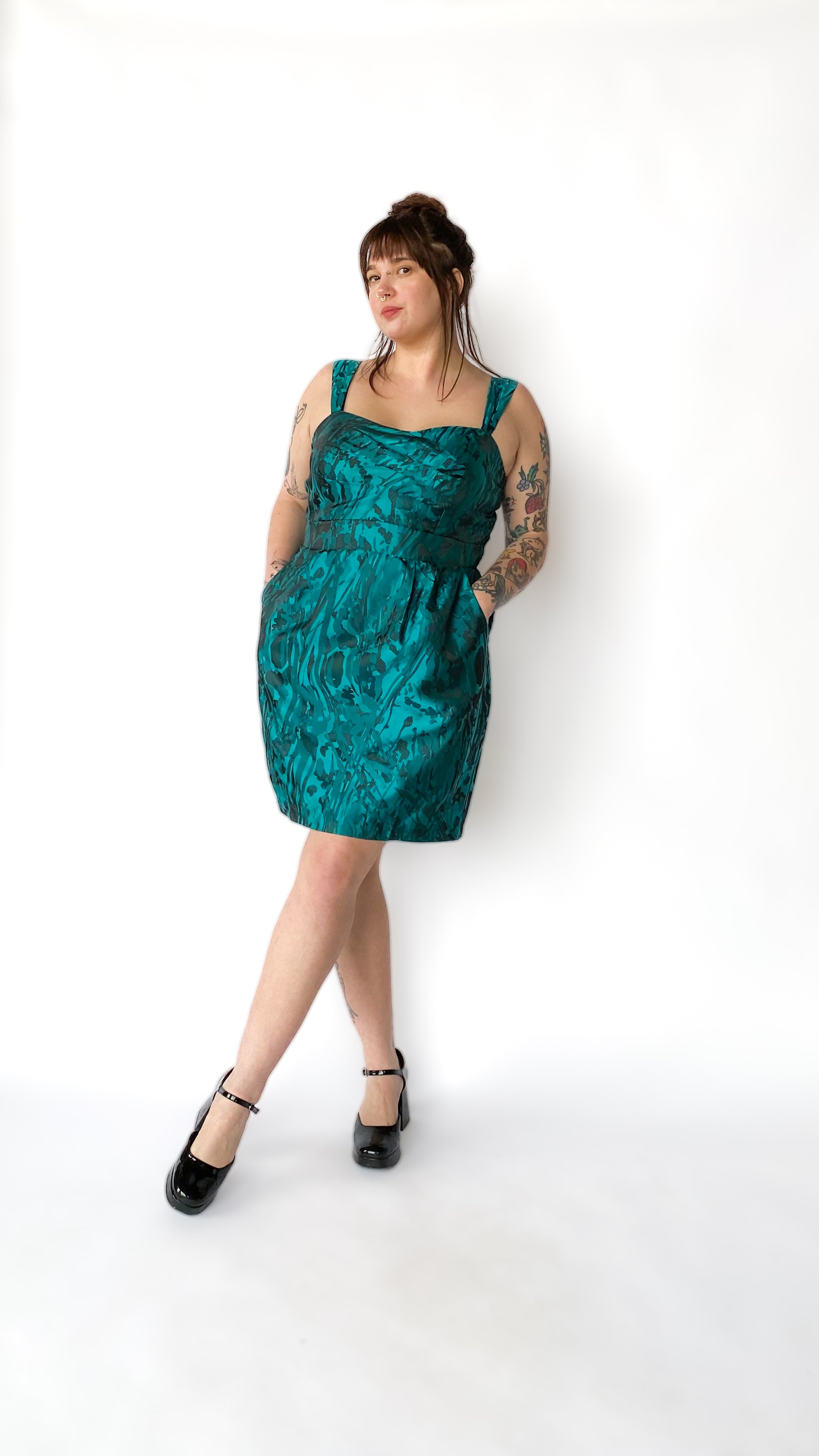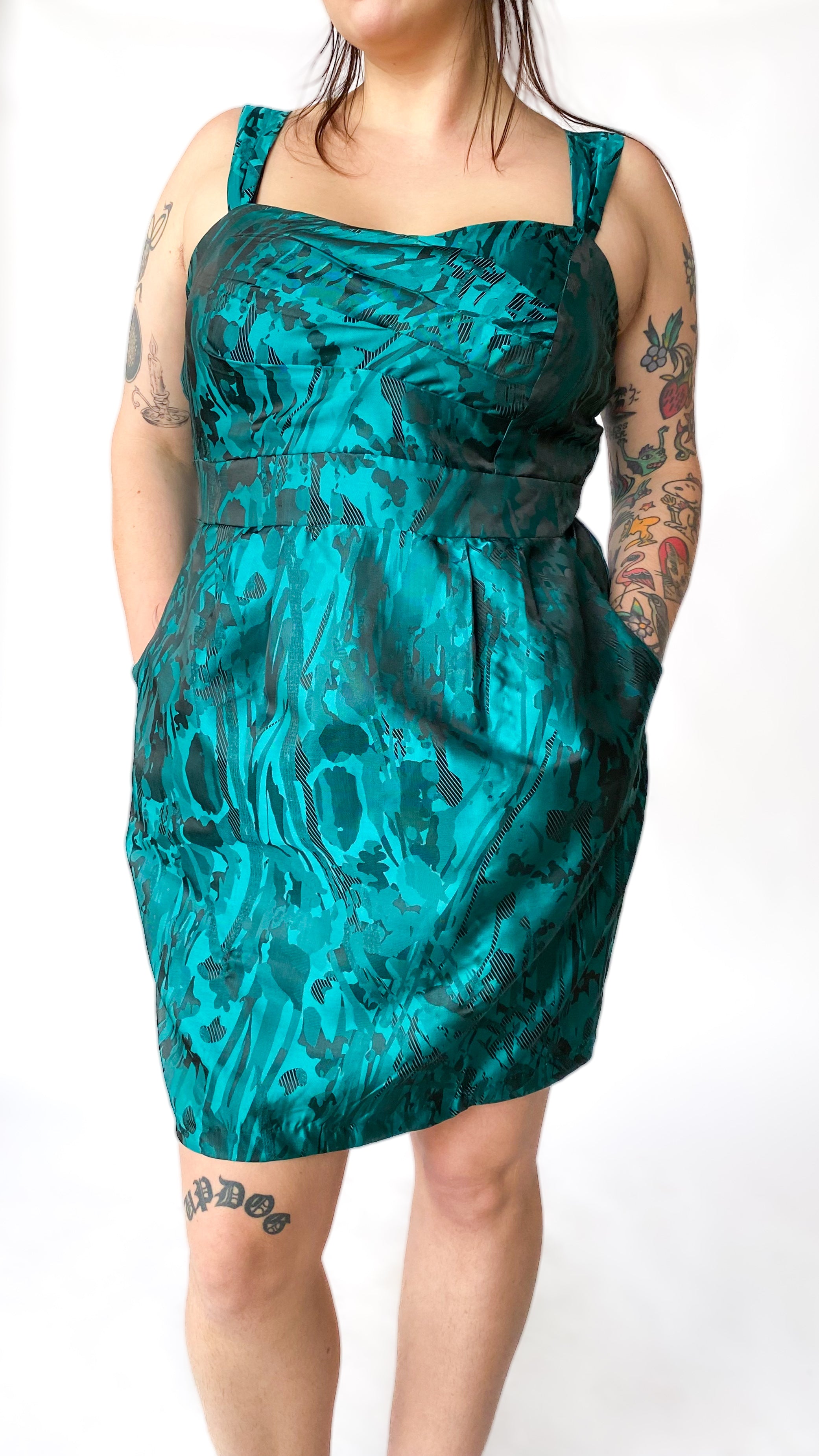 Teal cocktail dress with abstract black pattern. Pleated asymmetrical bodice. Zipper in center back, elastic band across the top of the back of the bodice. Inset pockets on either side.
