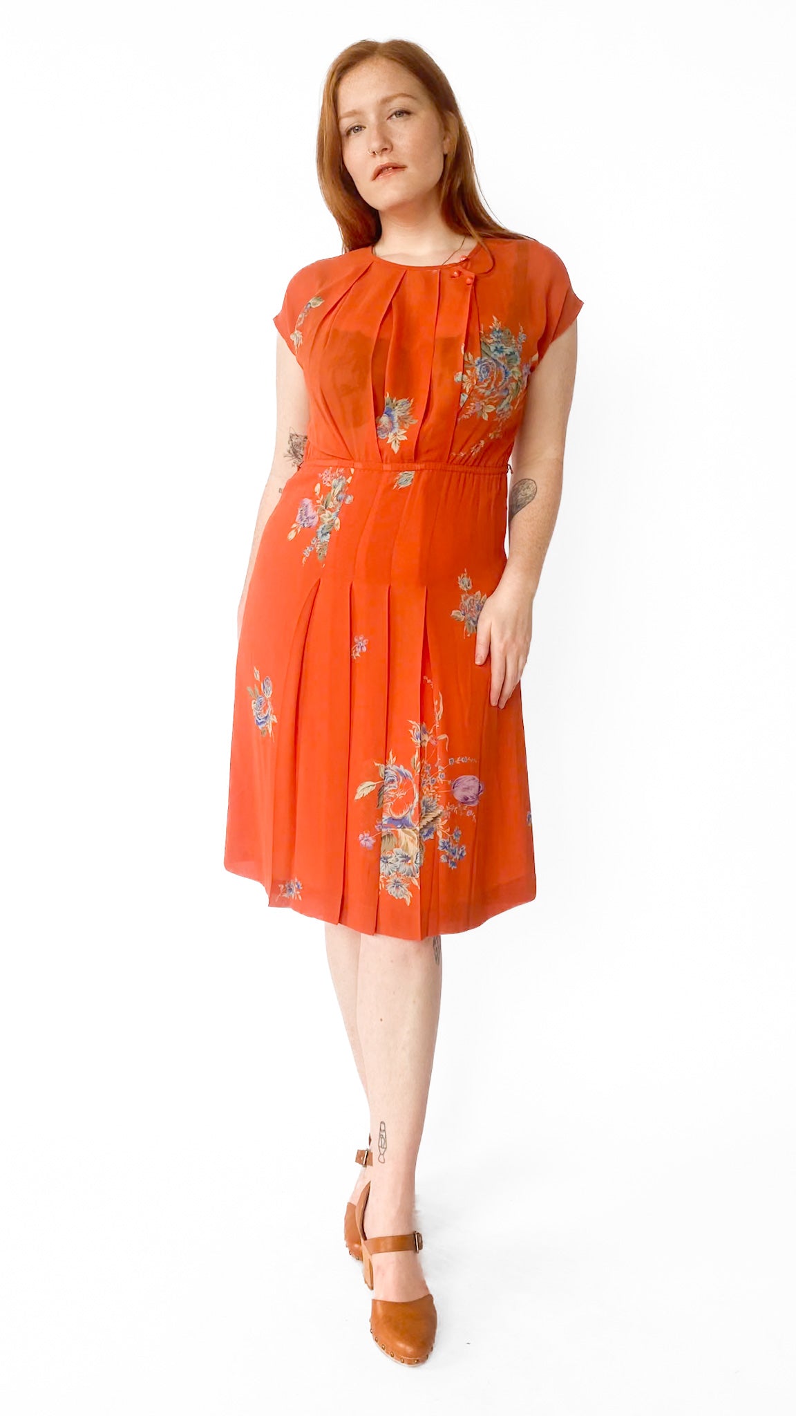 1970s Orange Floral Chiffon Dress, sz. XL