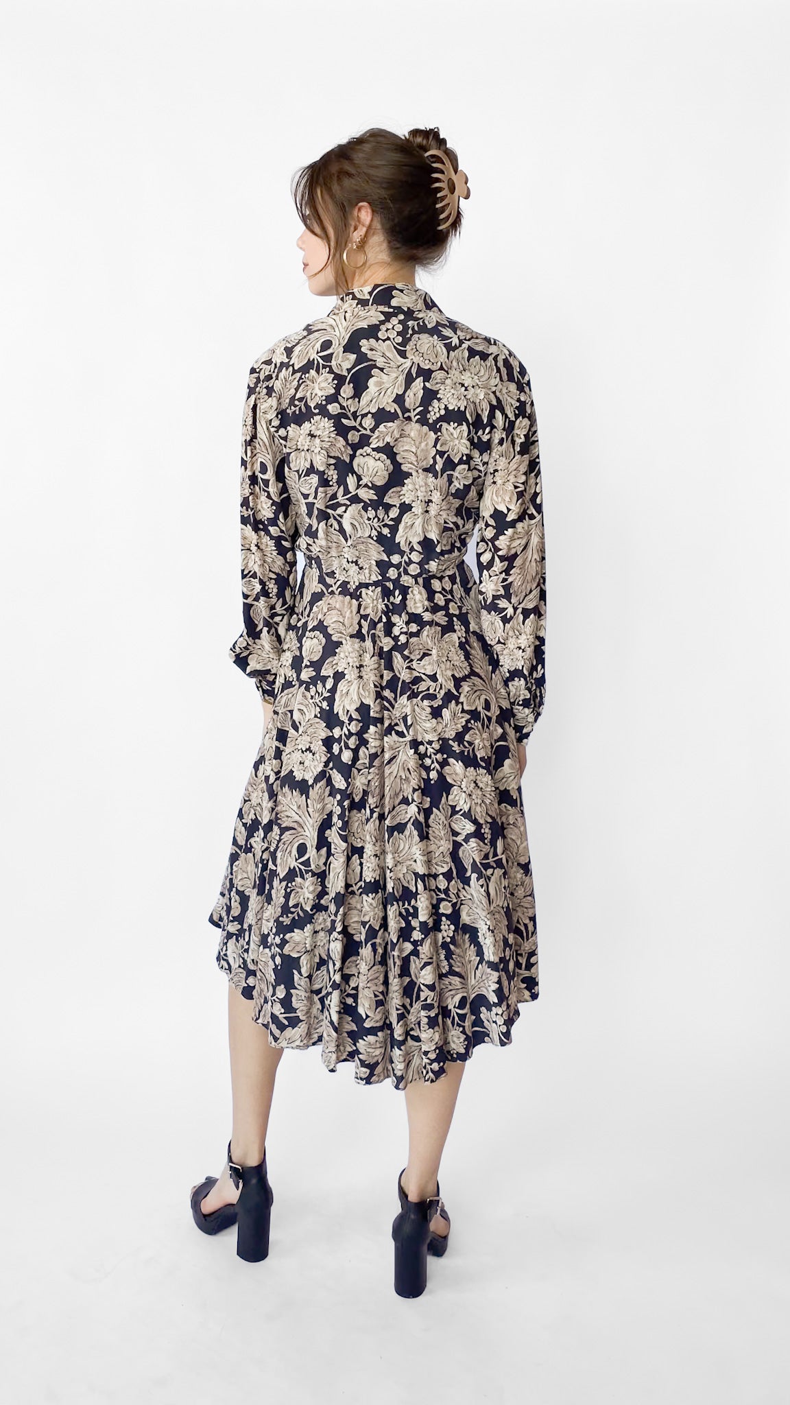1980s Navy & Tan Floral Midi Dress, sz. S