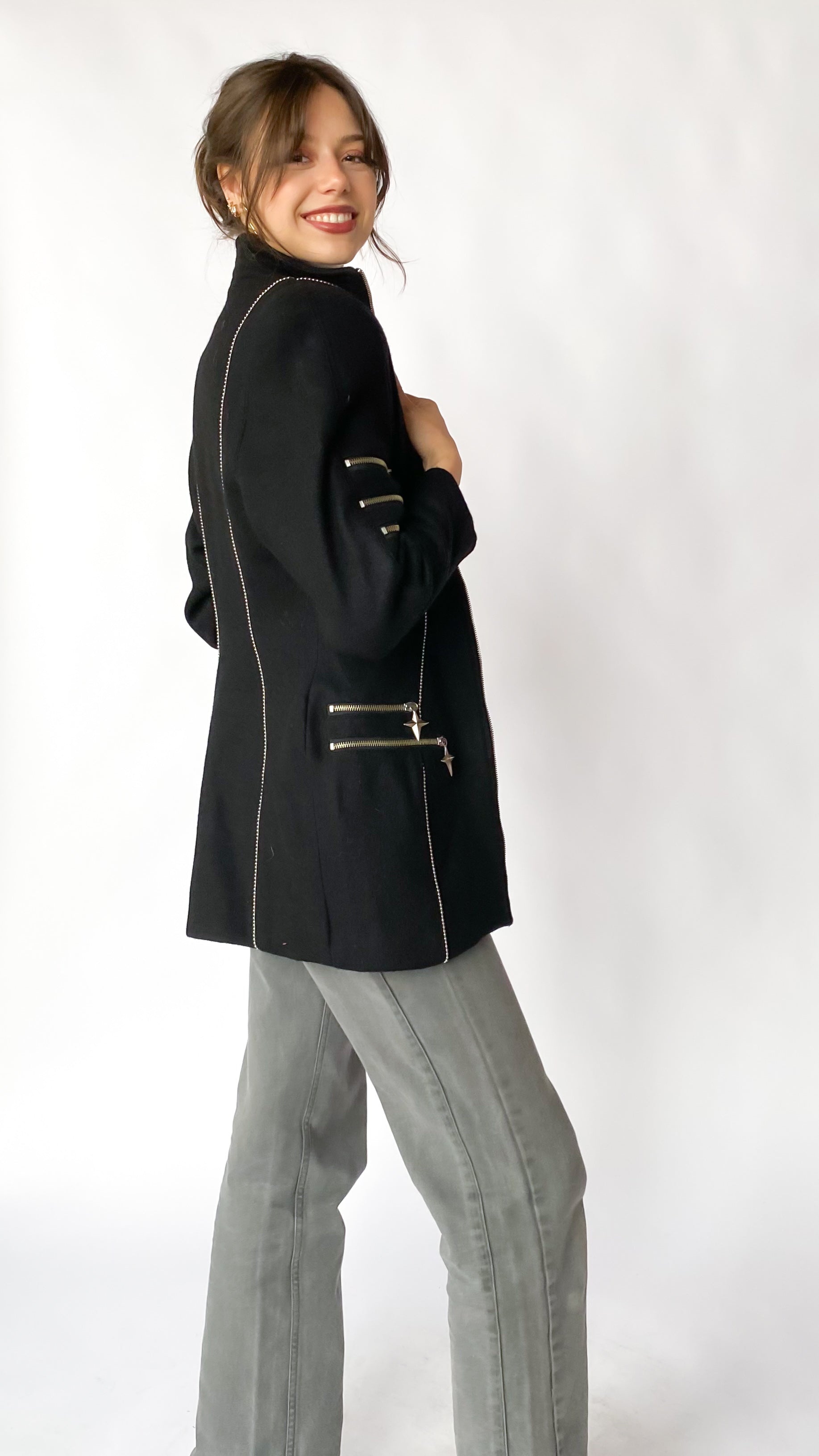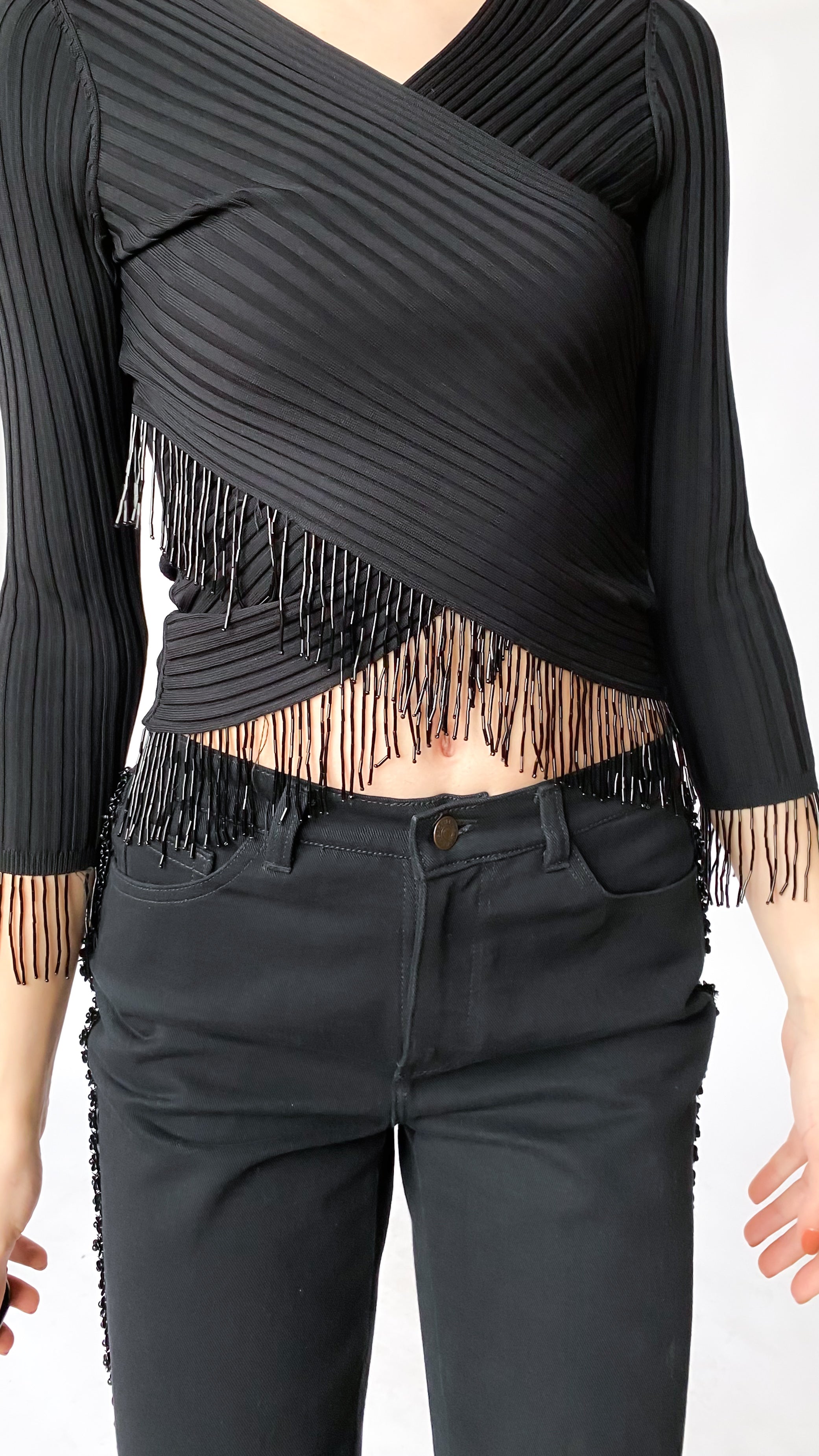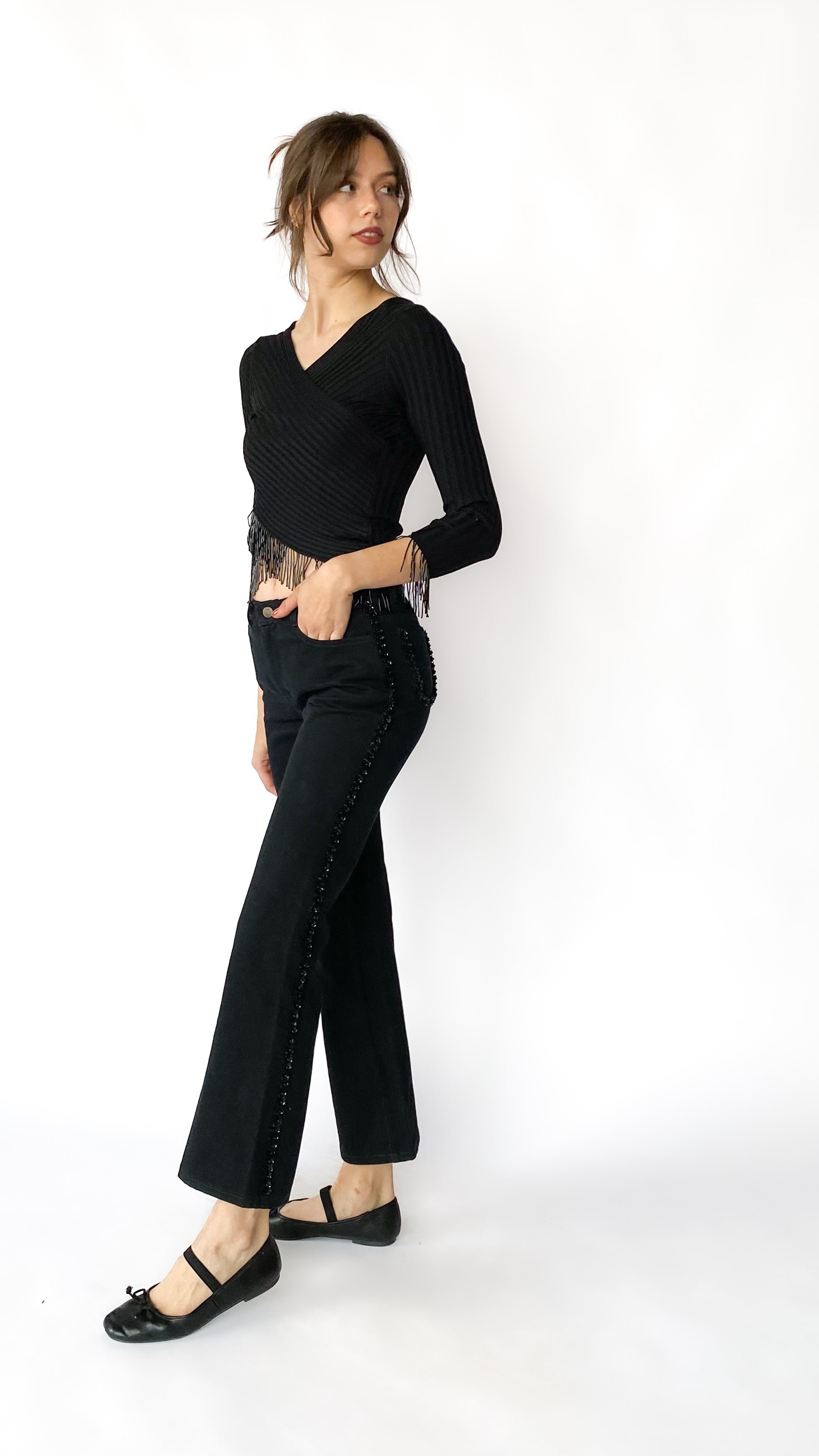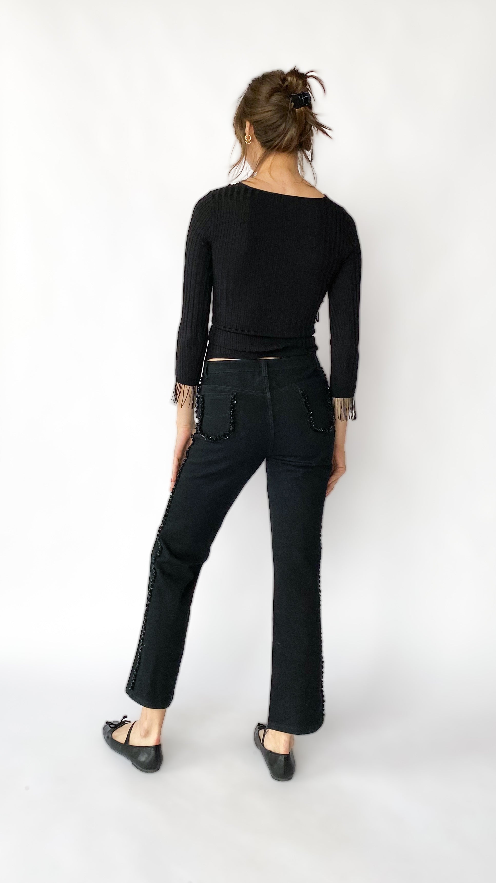 Y2K Black Sequin Flower Tuxedo Stripe Jeans, sz. M