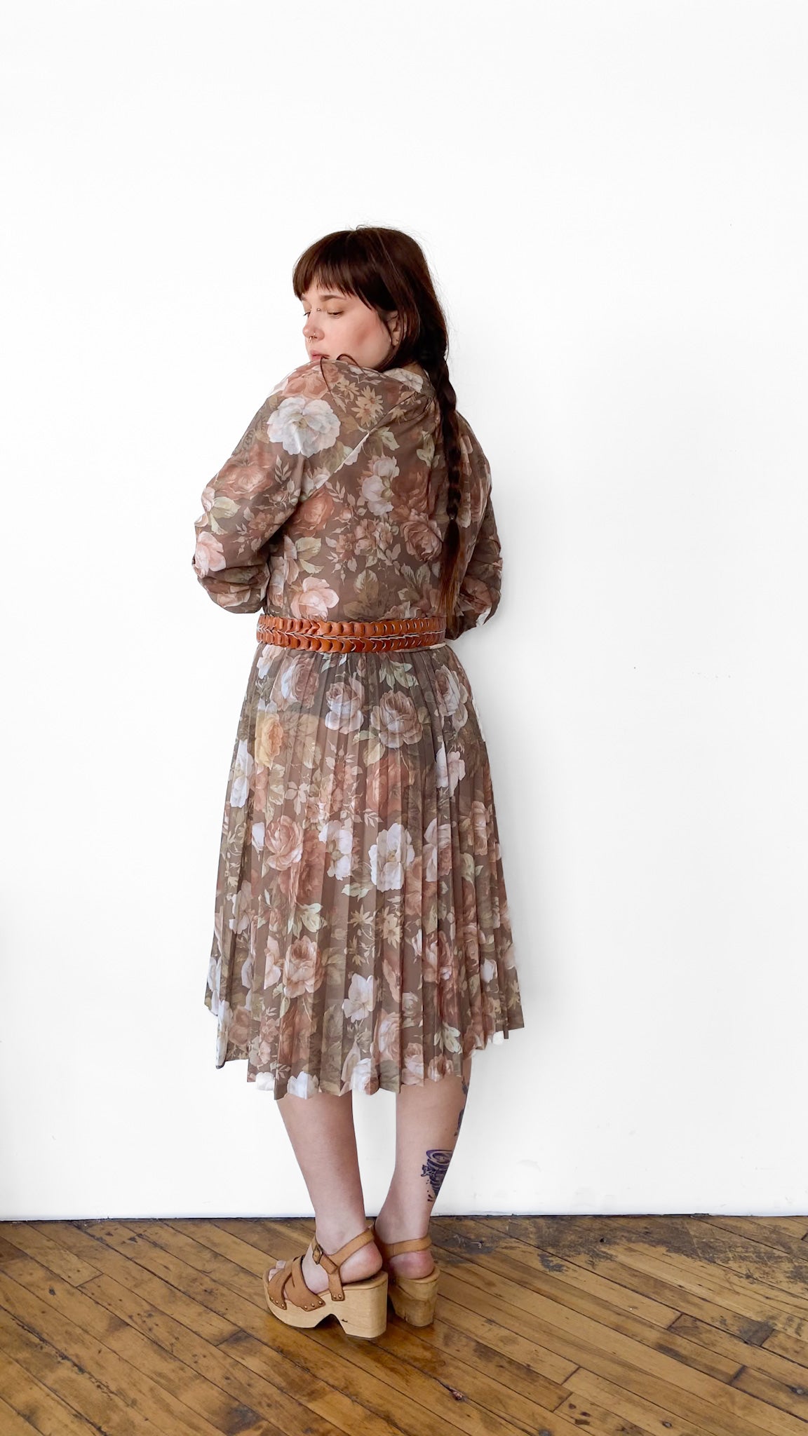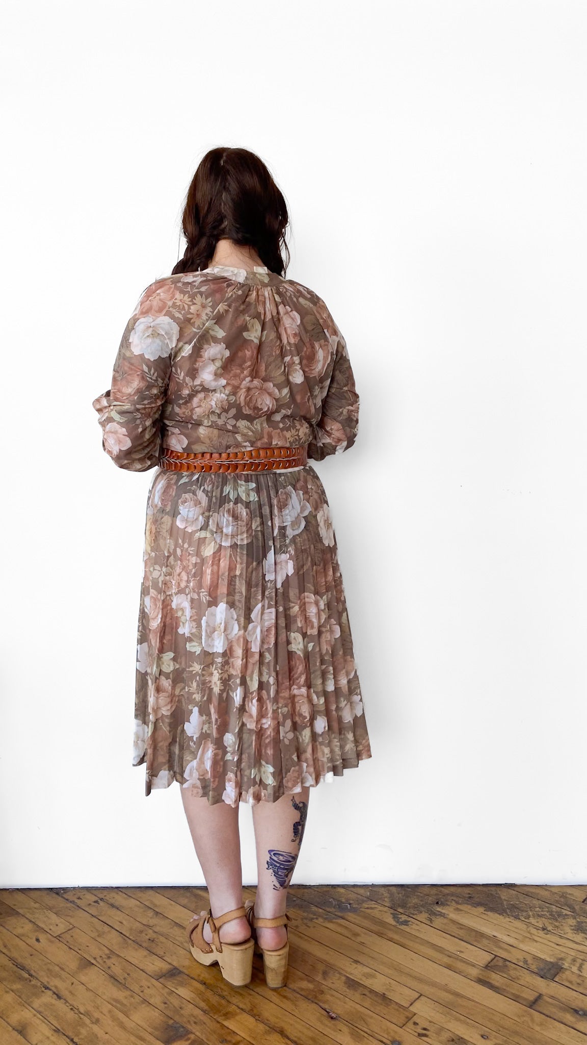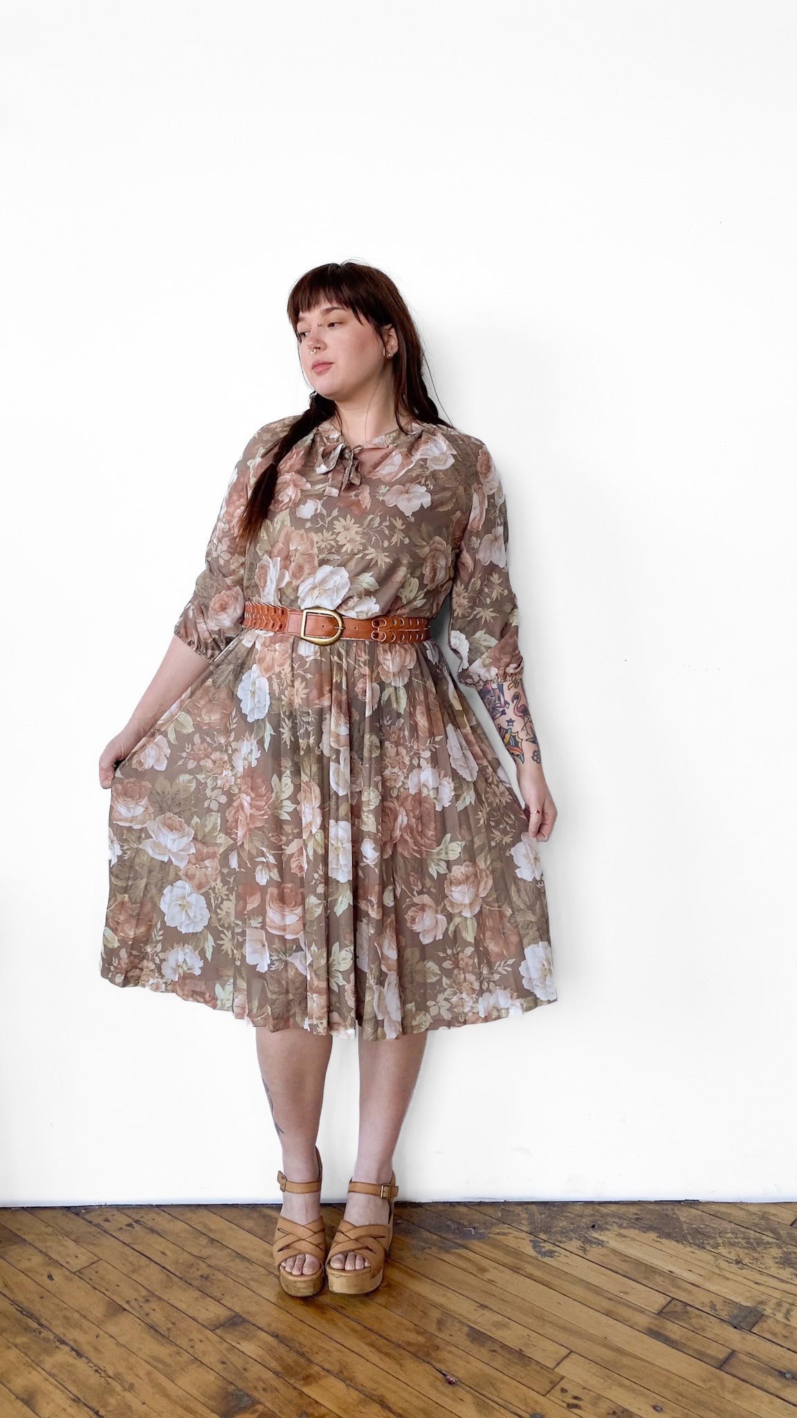 1970s Tan Floral Pleated Dress, sz. L/XL