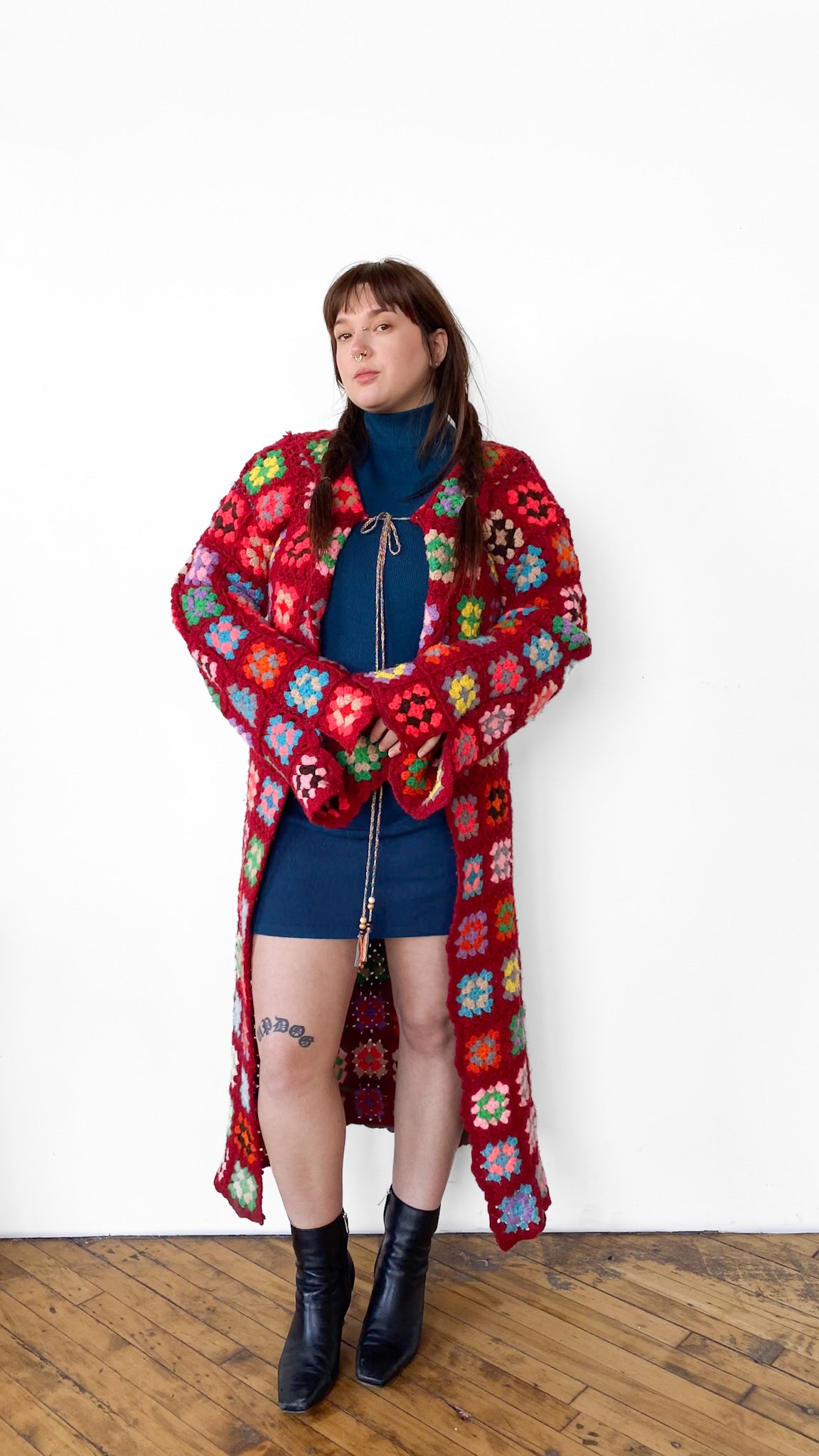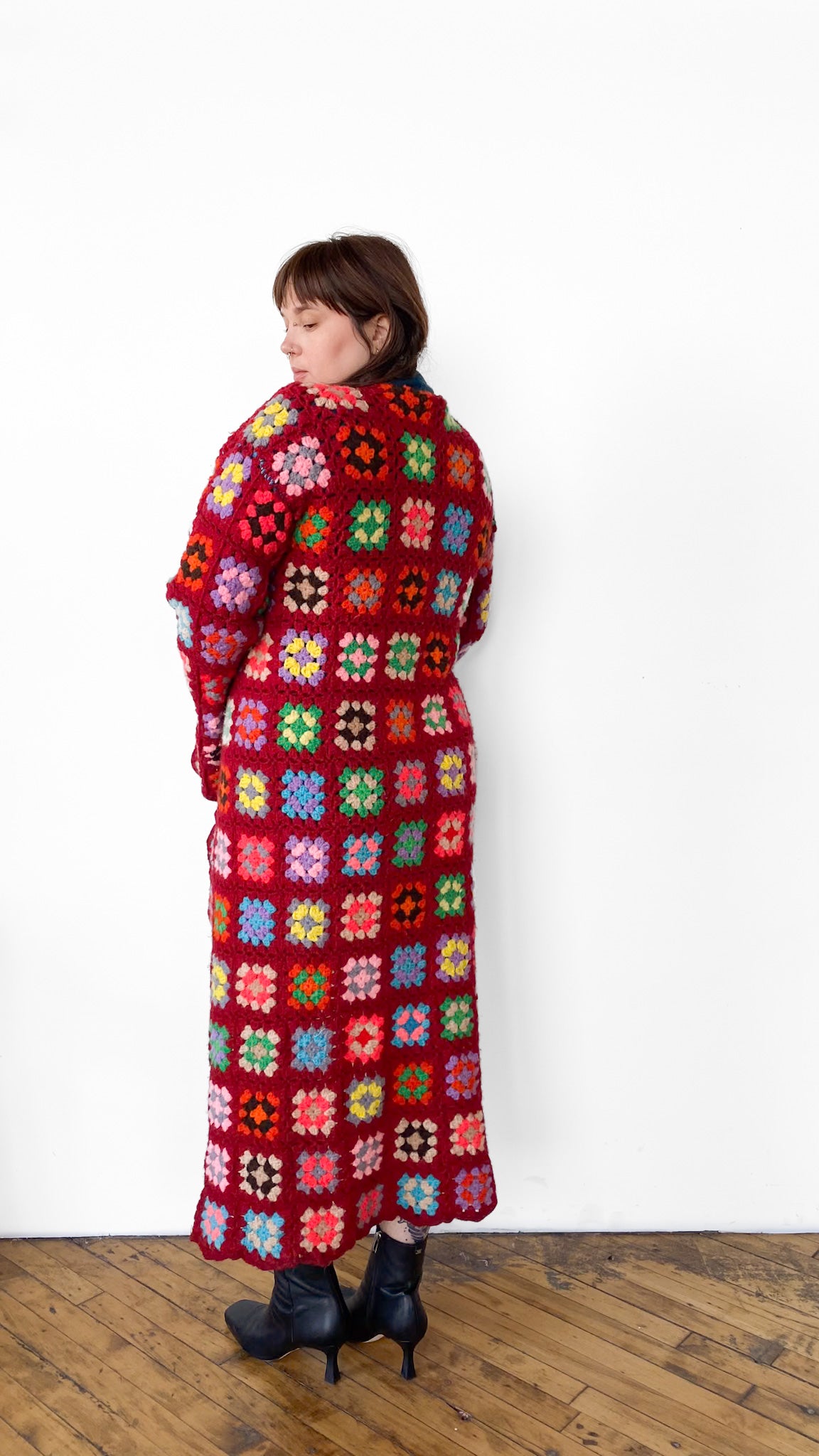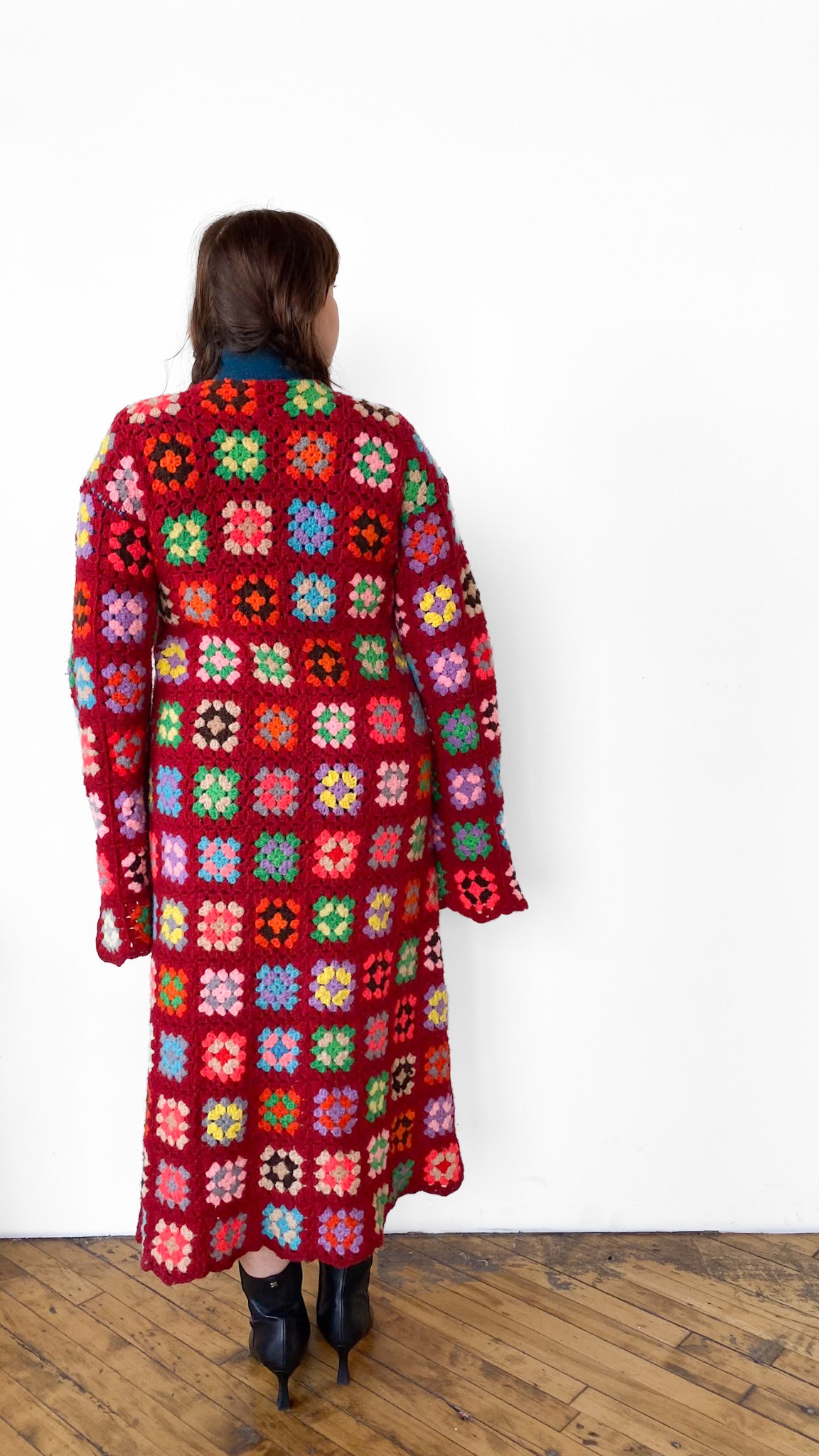 1970s Red Crochet Granny Square Cardigan, Open Size
