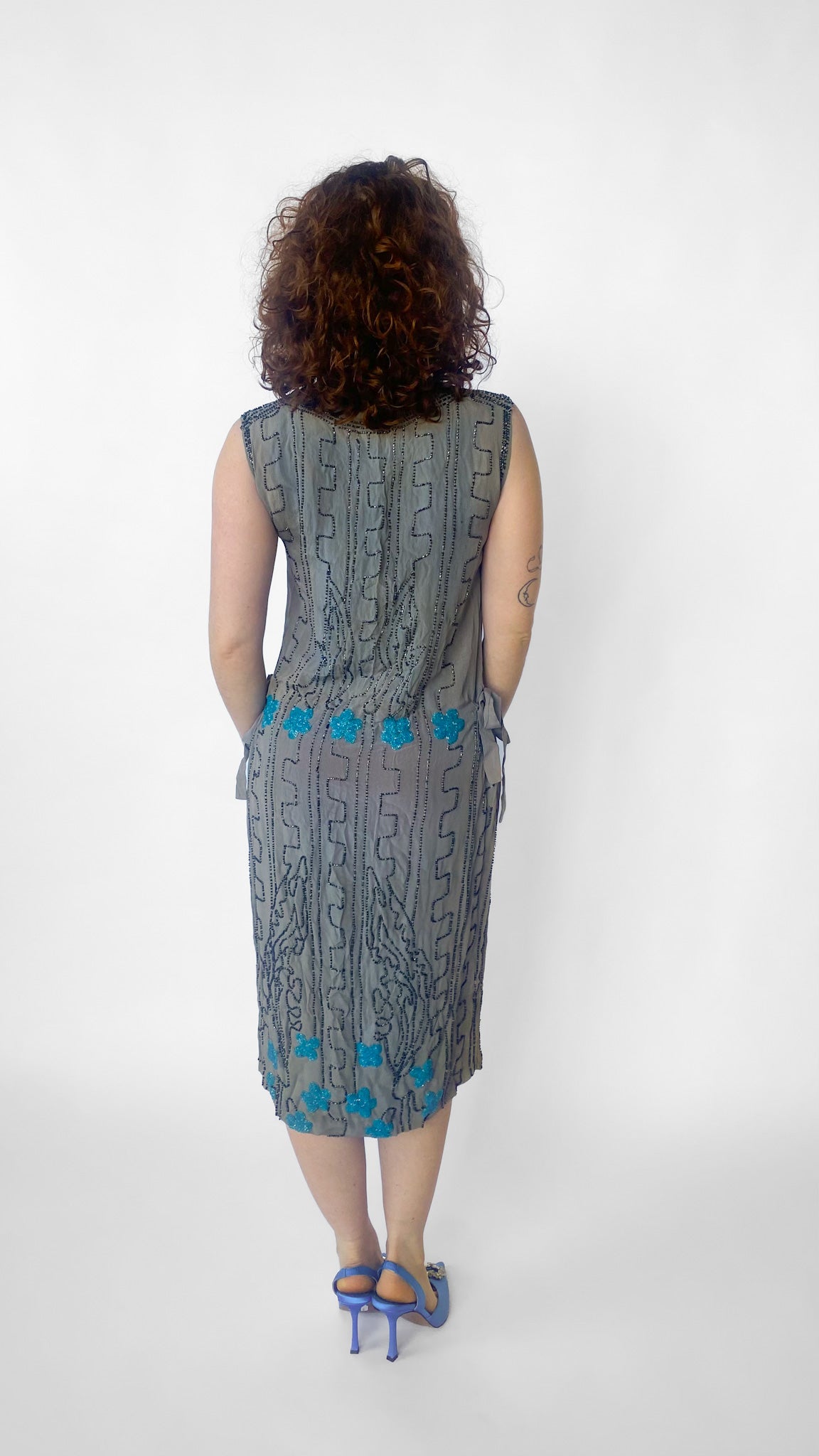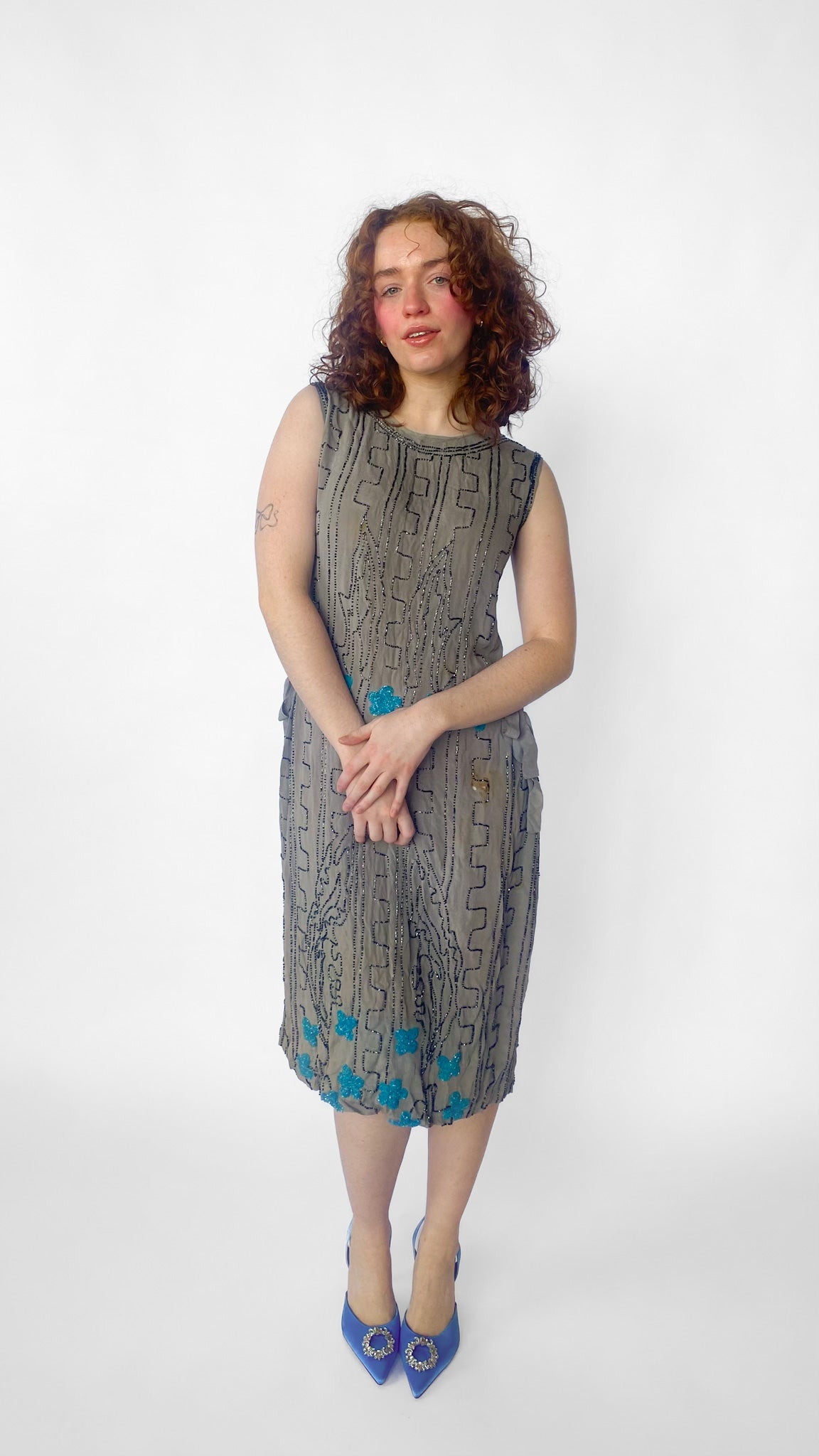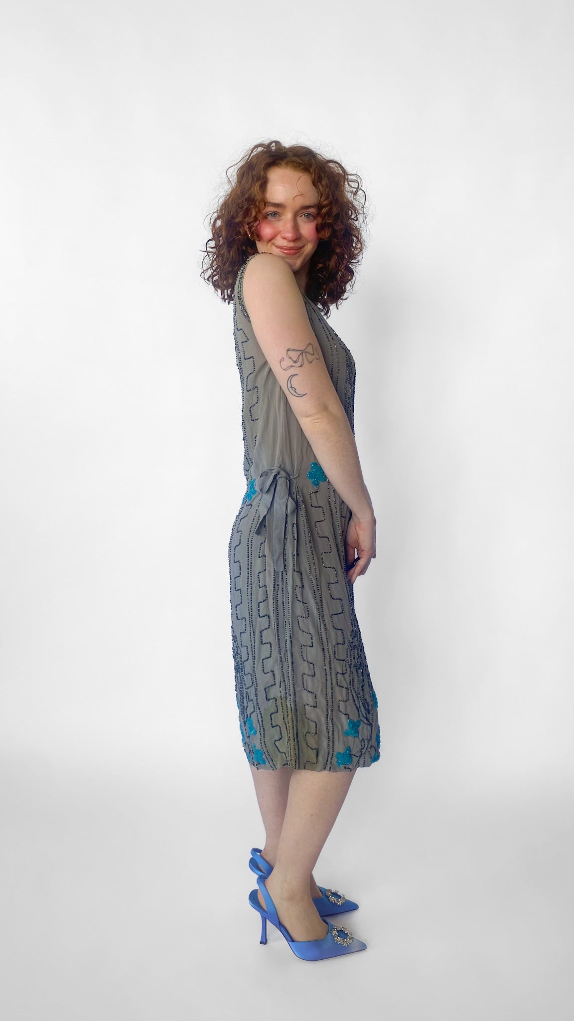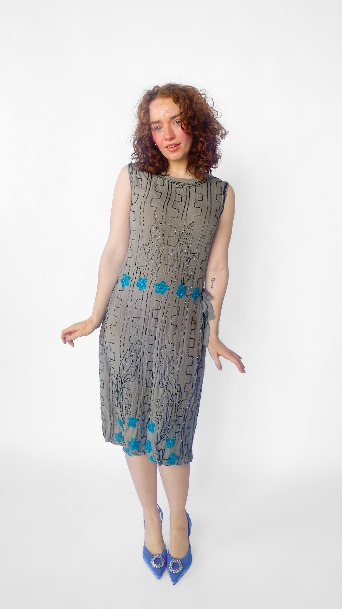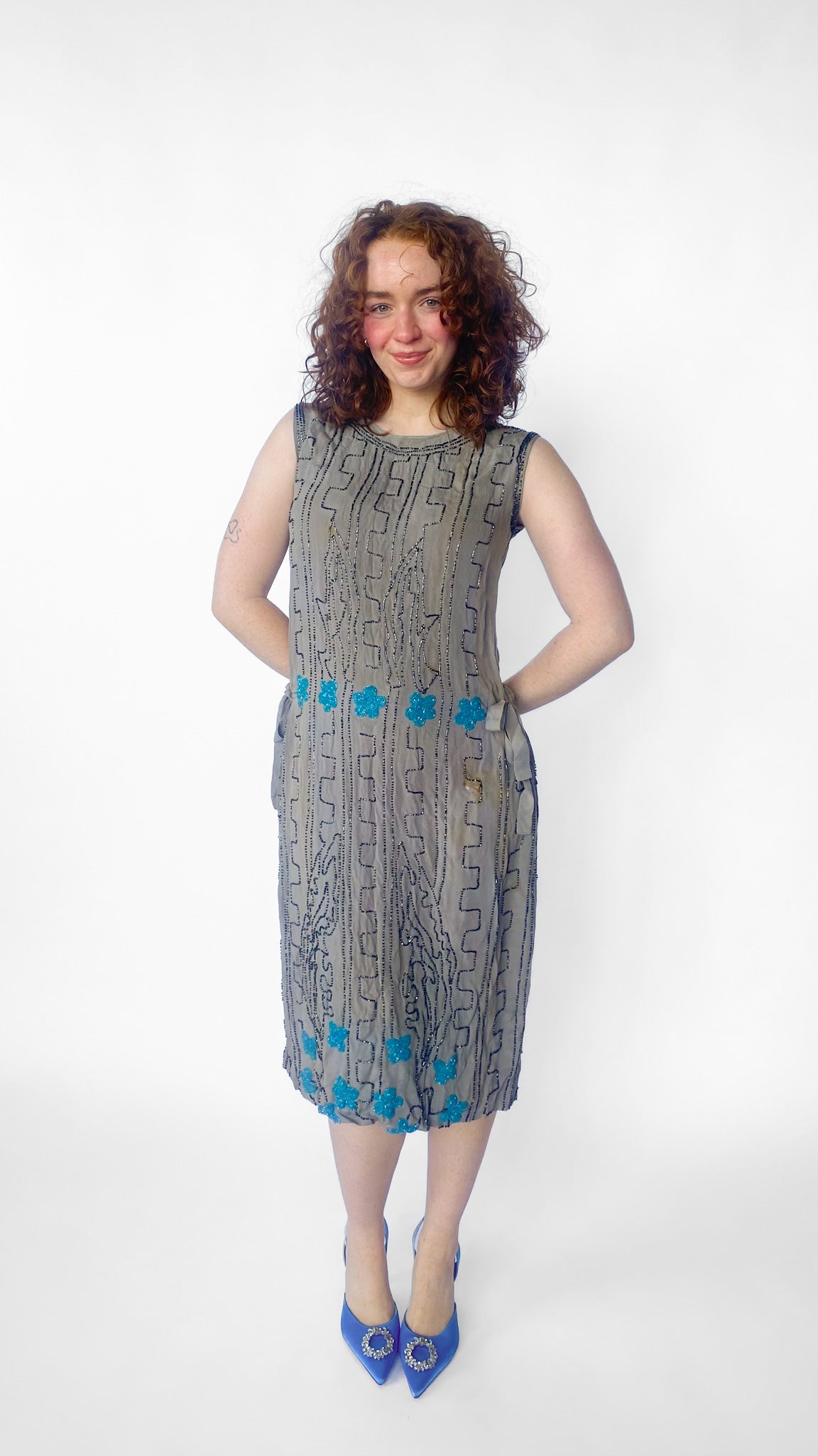 RARE 1920s Gray Beaded Flapper Dress, sz. S