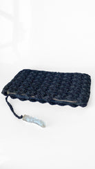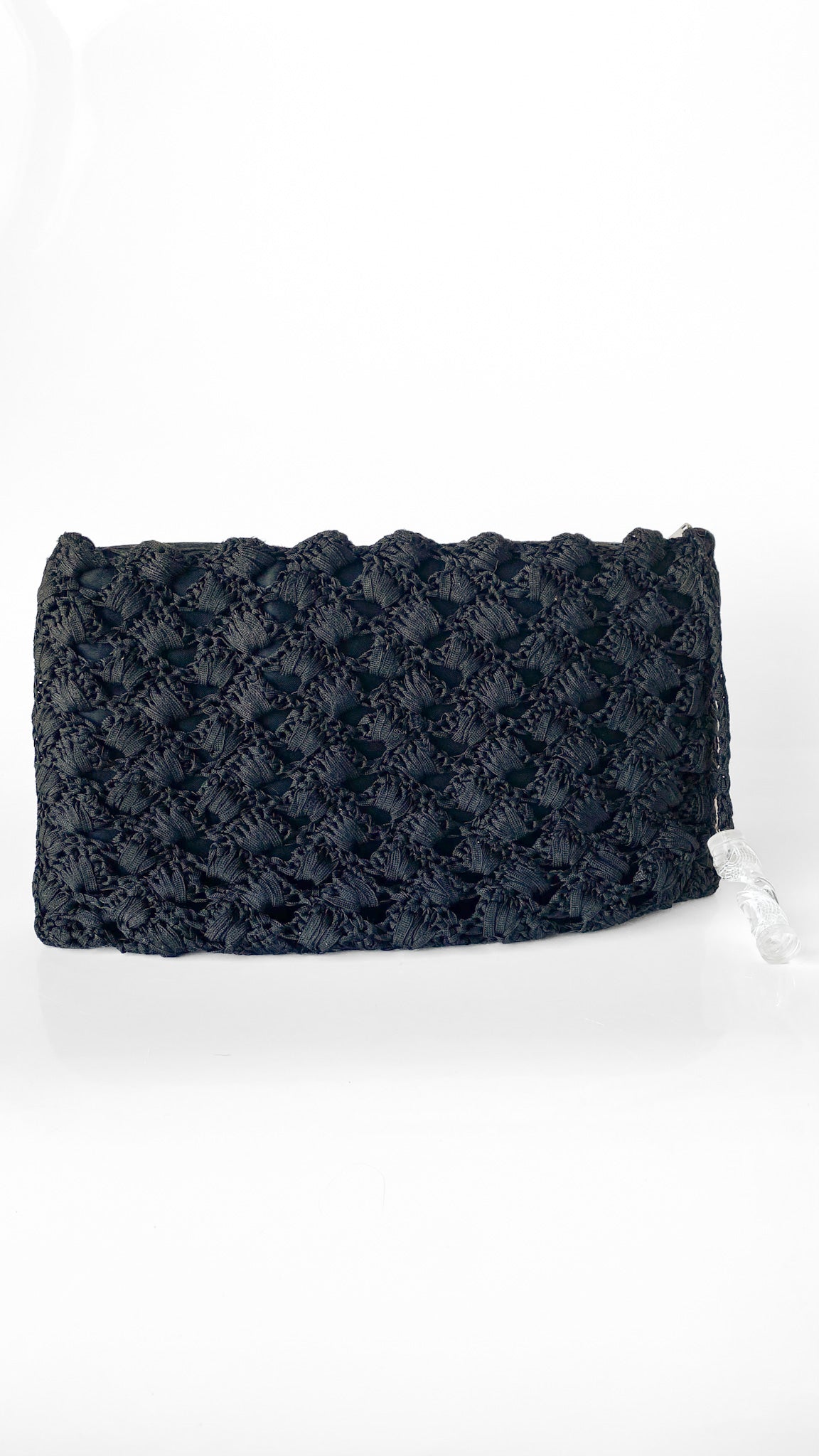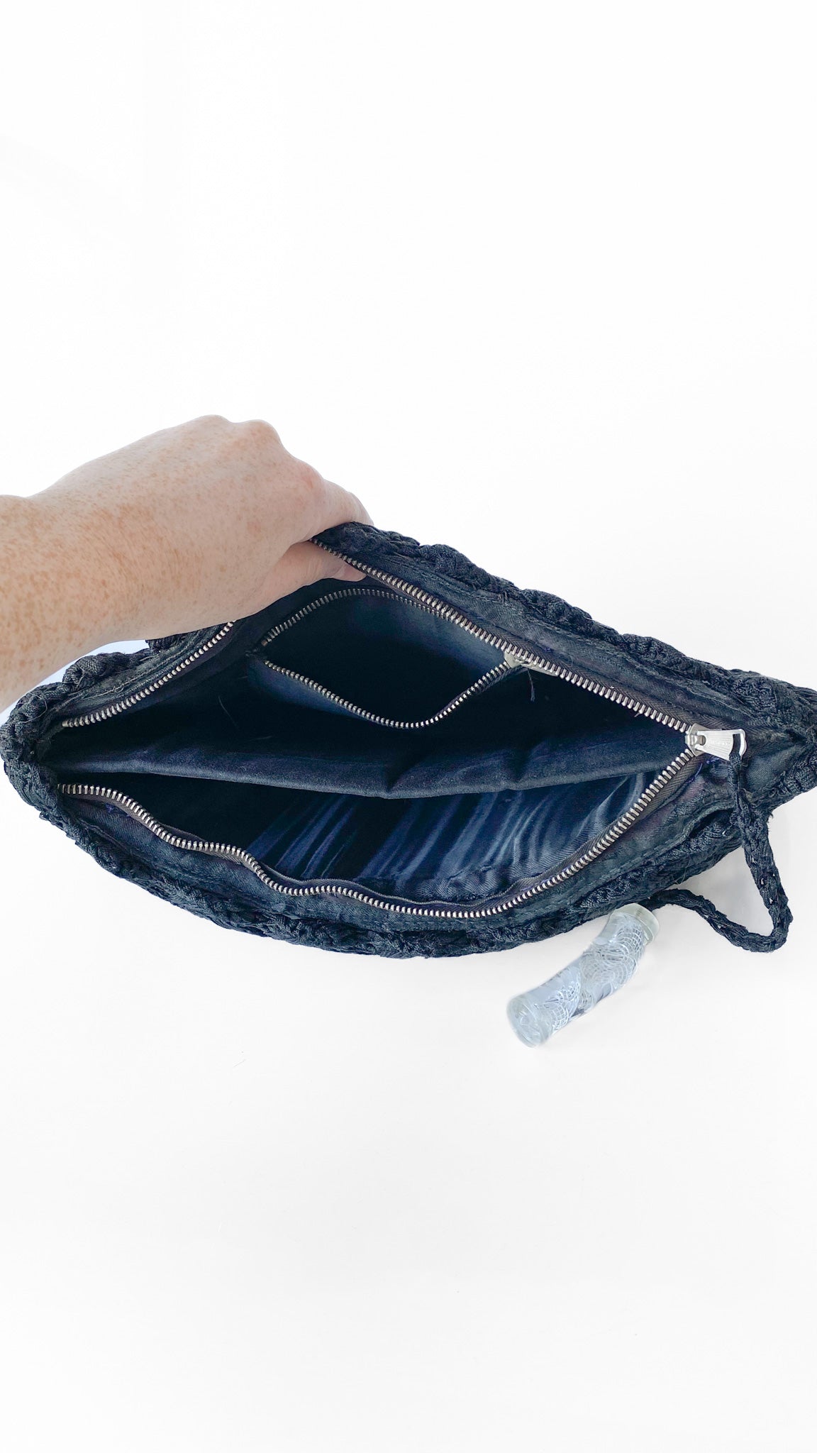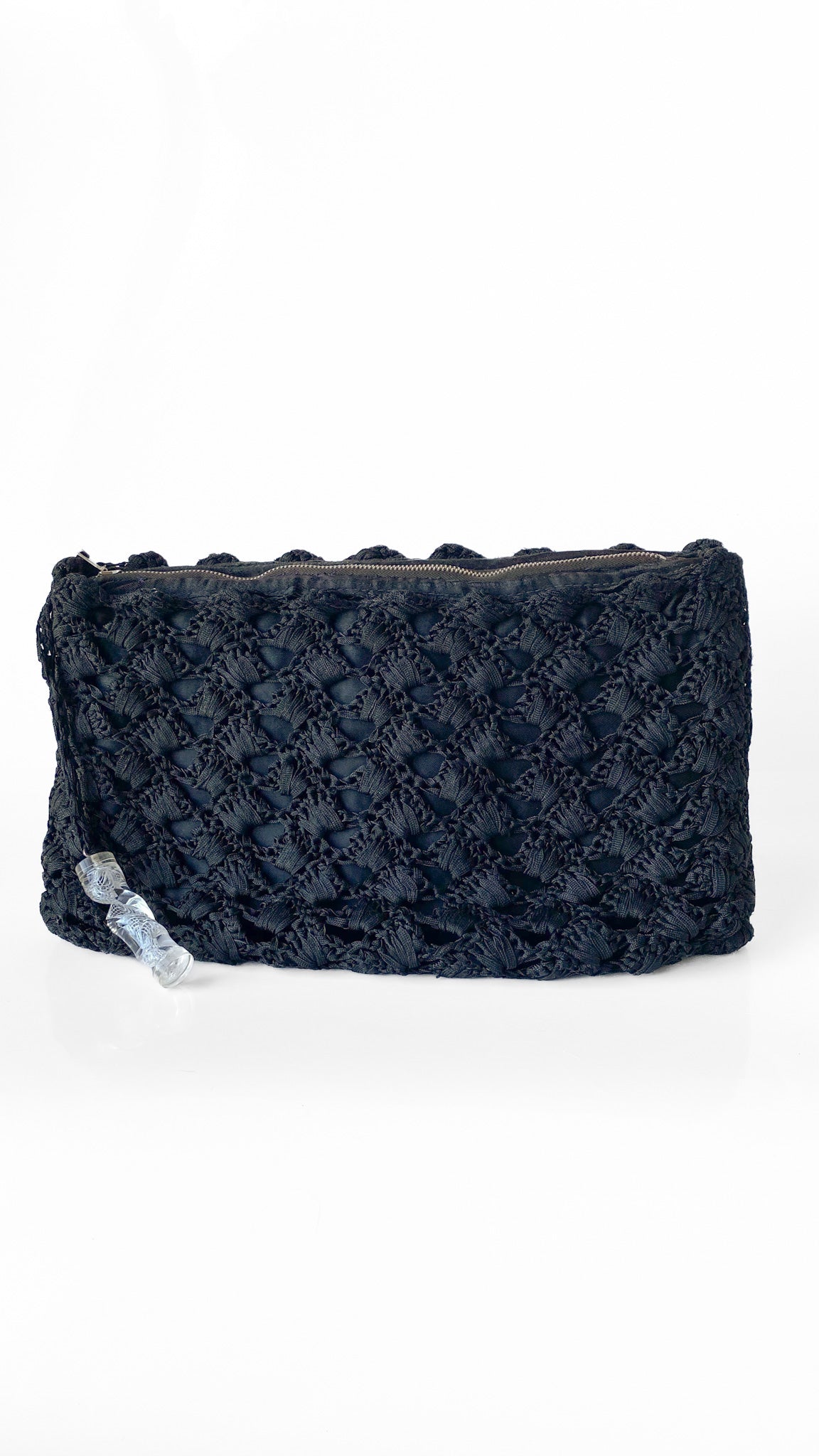 Black woven clutch with black lining and metal zipper with long matching zipper pull and clear lucite charm. Two pouches and one interior zipper pocket.