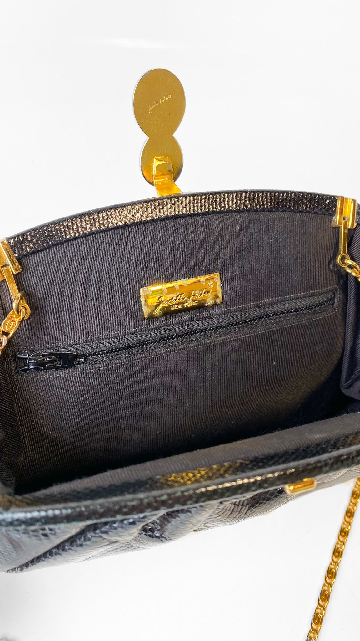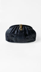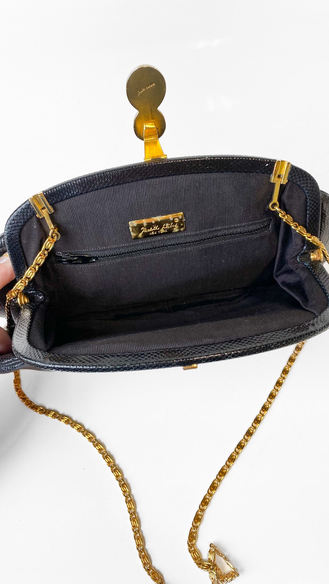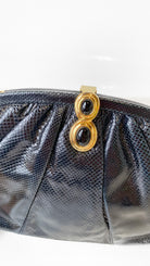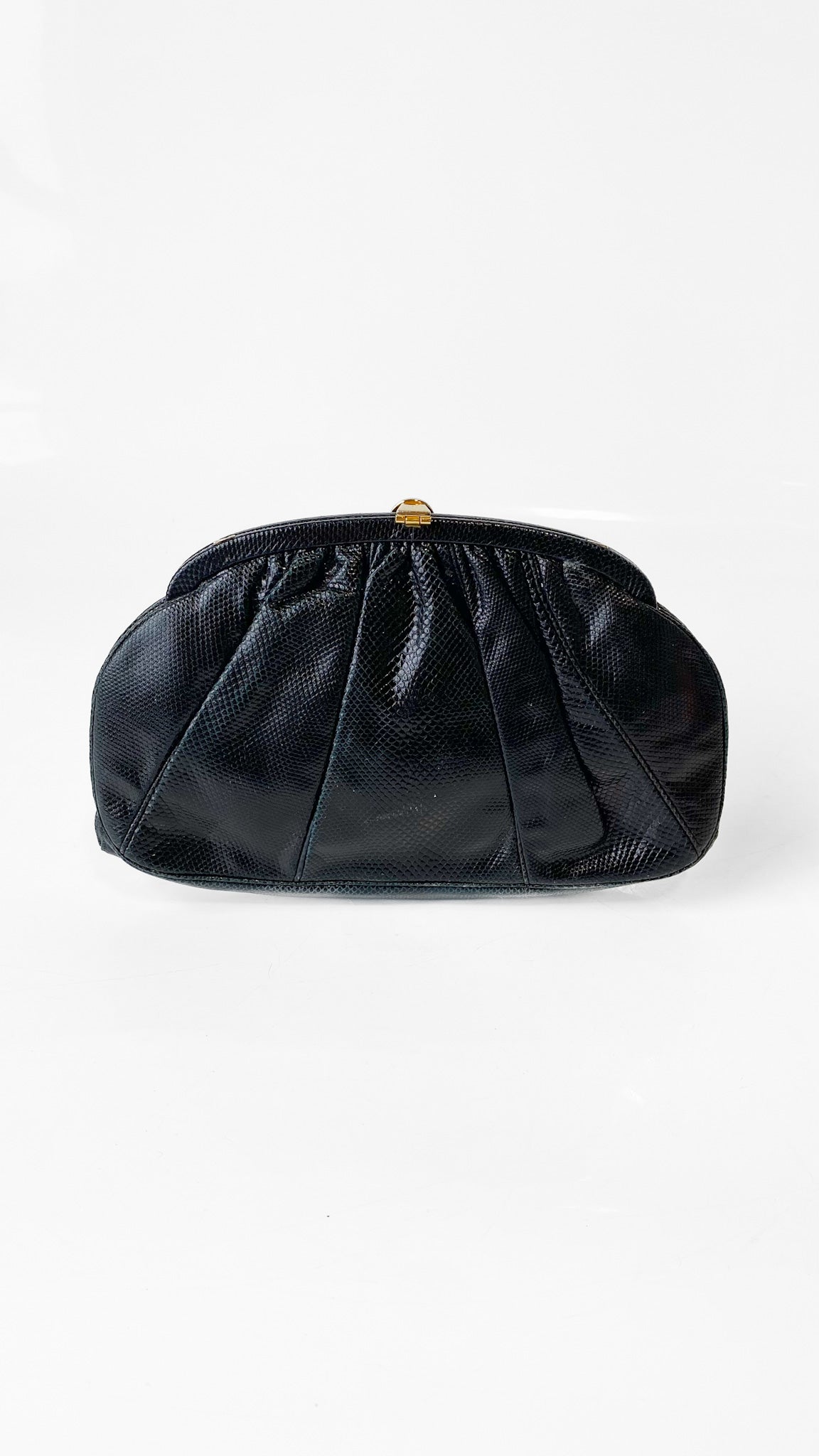 Black gathered reptile leather clutch with gold and black clasp. Interior is lined in black fabric, one zipper pocket, gold chain.