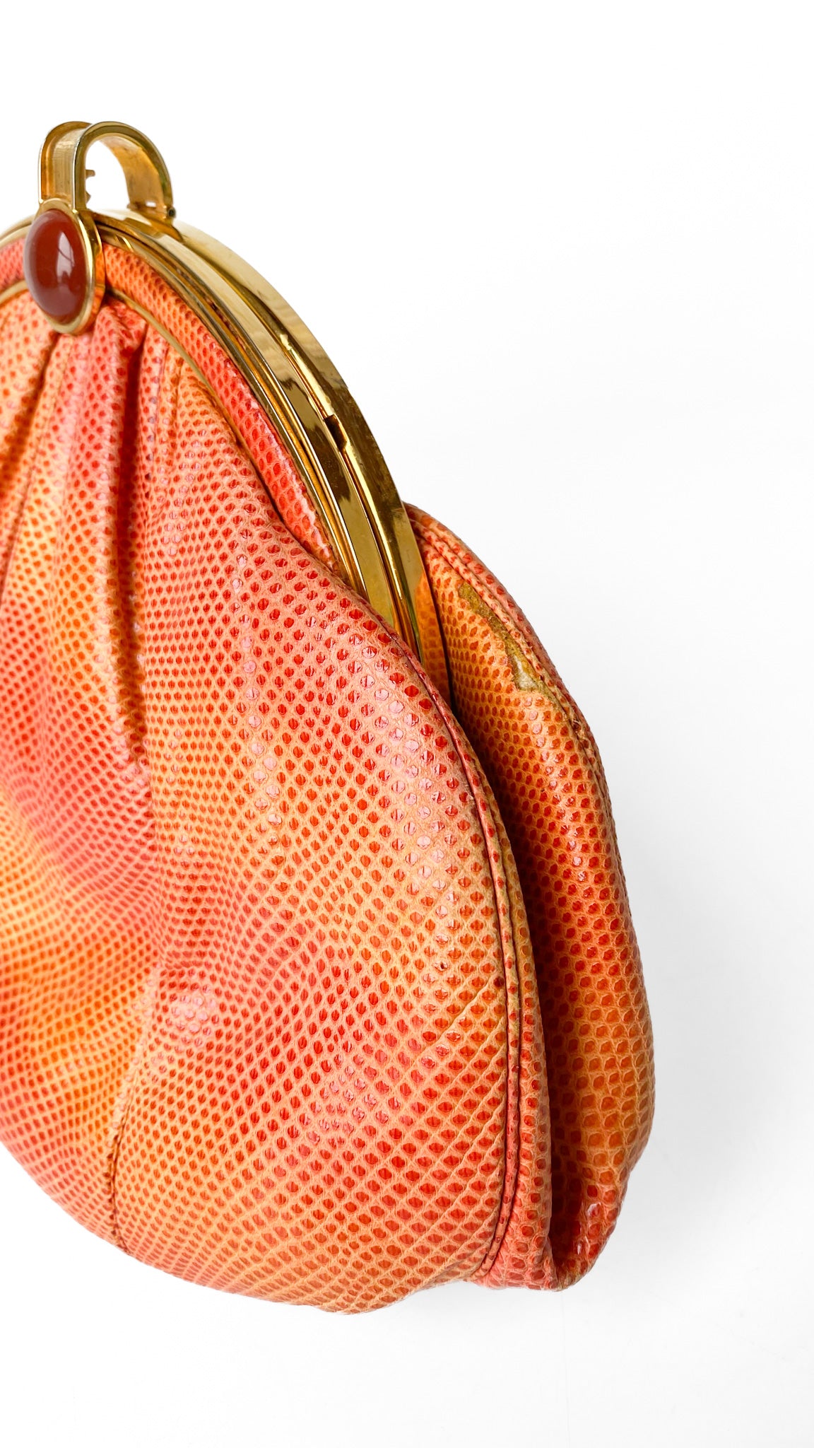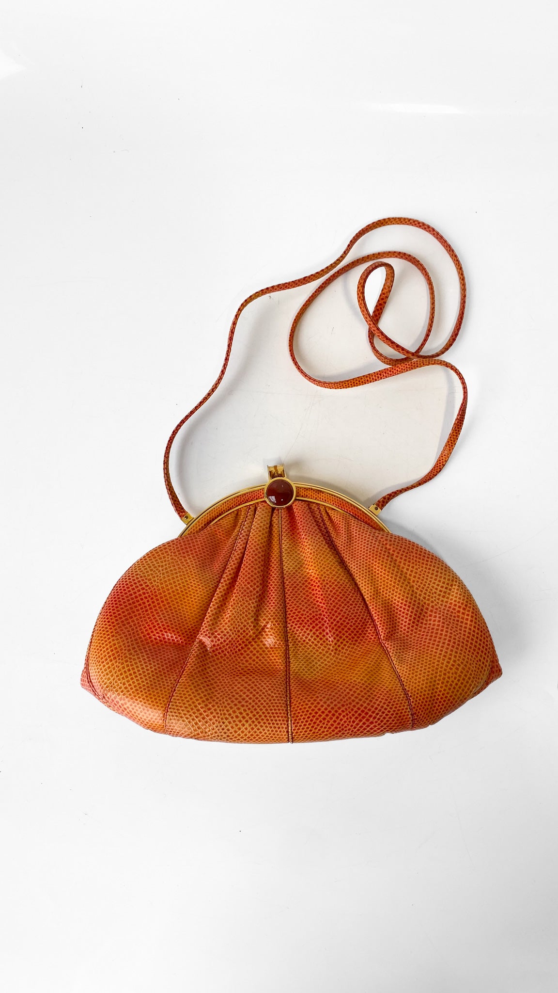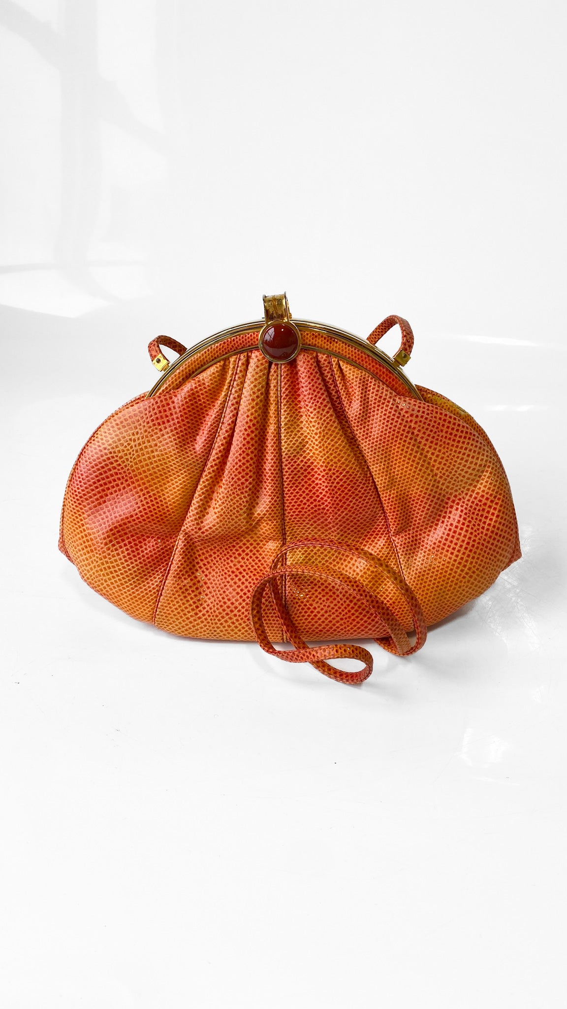 Duo toned orange reptile leather clamshell clutch with gold frame and brown clasp. Interior is lined in orange satin fabric, one interior zipper pocket, one interior flat pocket, matching leather strap.