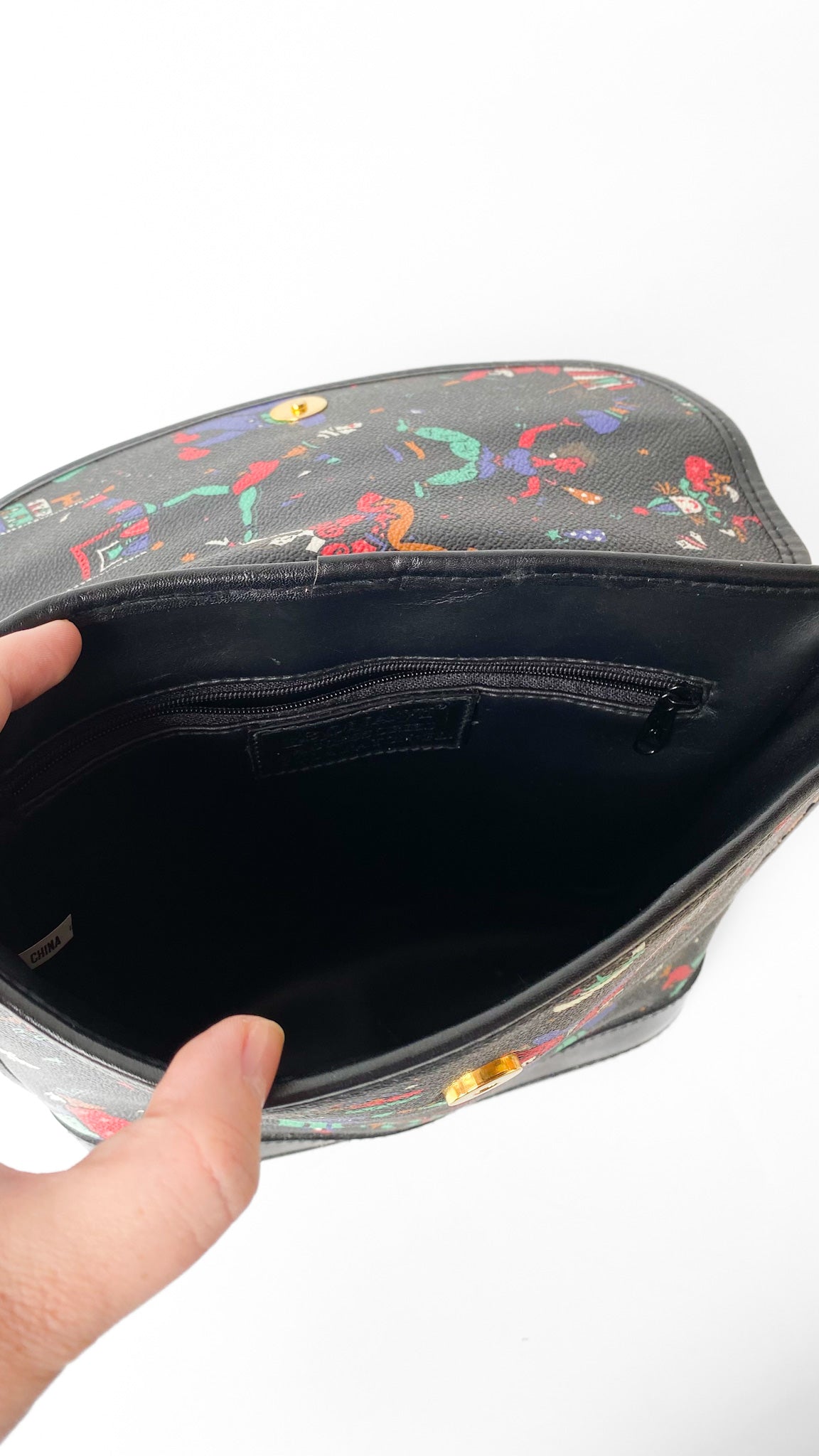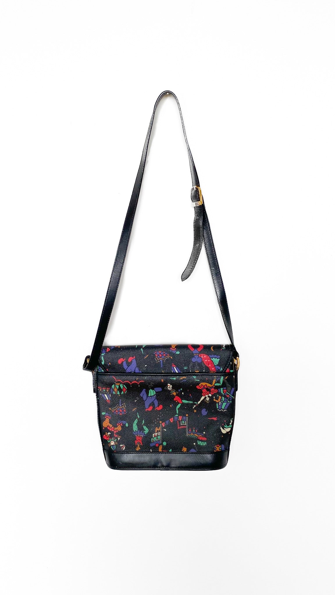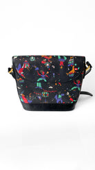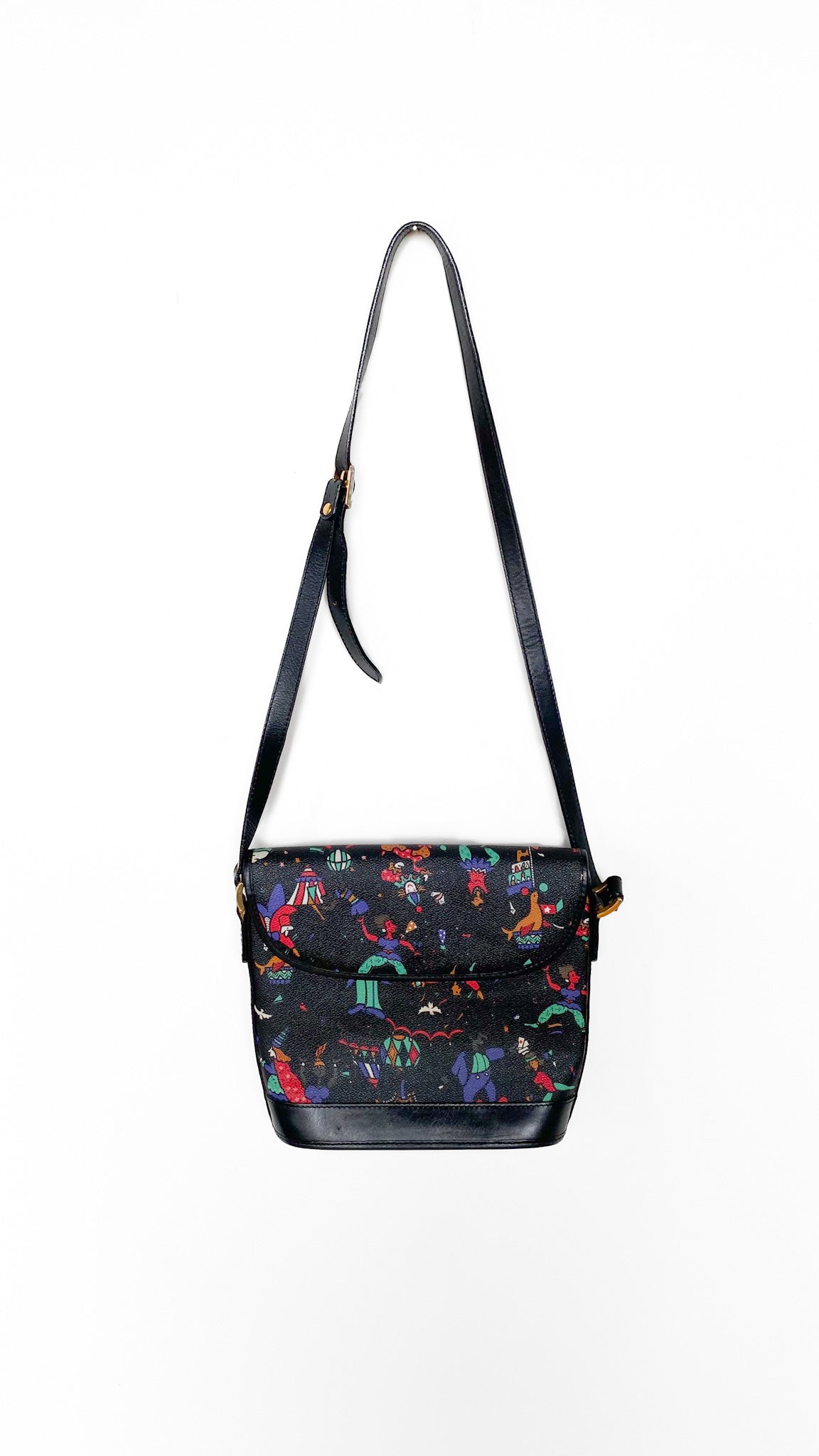 Description: Black shoulder bag with colorful circus pattern. Top flap with magnetic clasp. One interior zipper pocket, one exterior pocket. Adjustable strap.