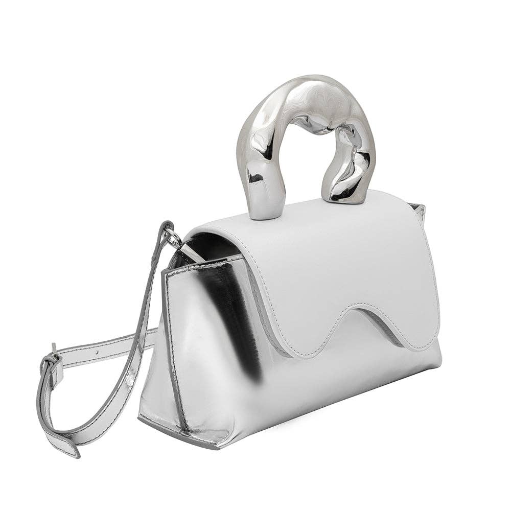 Meet Akari one of the most unique and intricate handbags you will find. Made out of recycled vegan leather this metallic top handle bag makes a fashionable yet sustainable statement piece. Wear it comfortably as a crossbody bag using the adjustable strap for hands-free convenience.