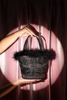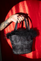 Is it a handbag or lingerie for your arm? This black satin bag is textured with delicate lace and shaped like the dreamiest little corset! It features a row of stunning black feathers along the top and 2 sleek black handles for convenient carrying. It zips open and closed with a cute red bow zipper-pull, revealing a gorgeous red lining inside! What more could a girlie ask for? Measures roughly 6.75" tall (12" with handles included) x 9" wide x 3.5" deep.
