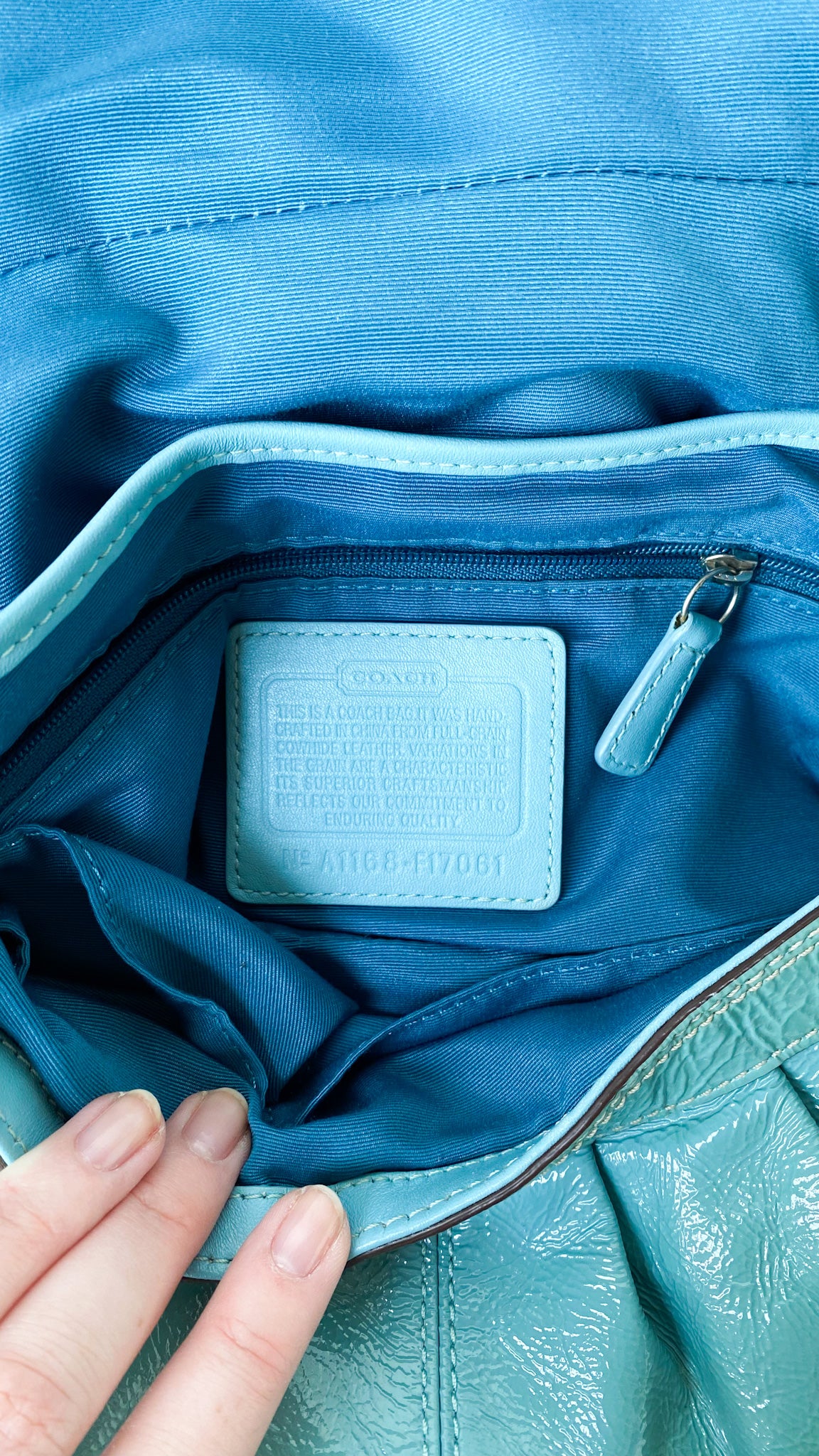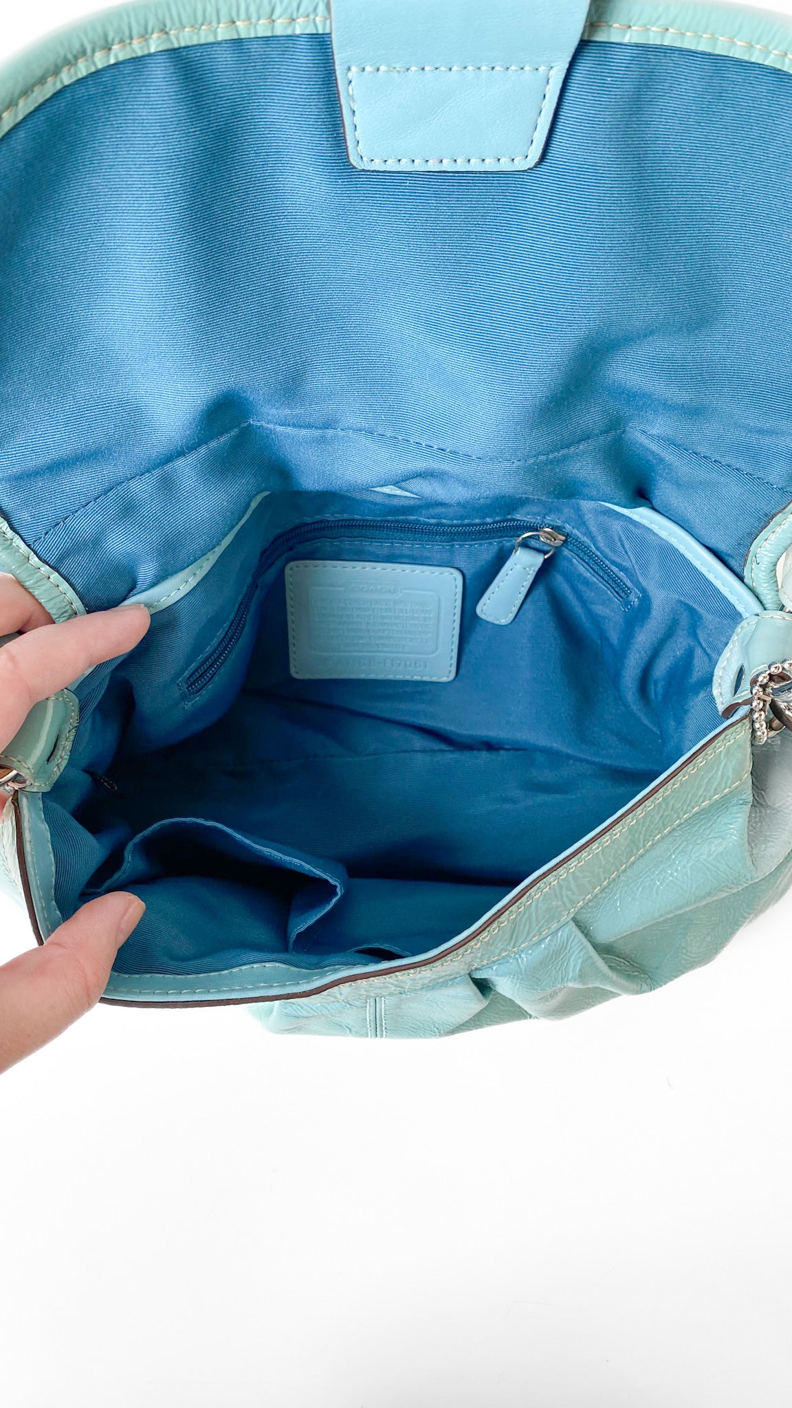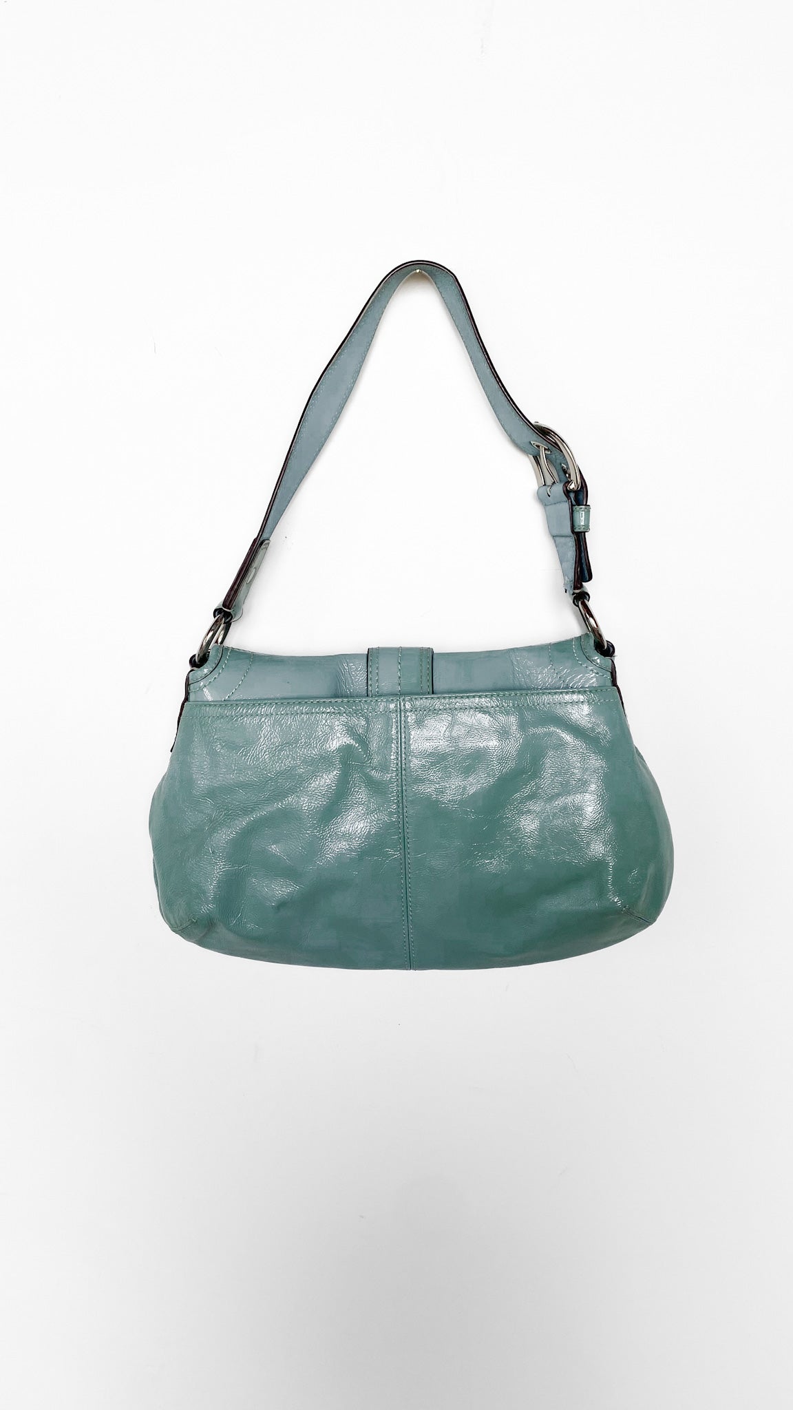 Description: 2011 teal blue patent leather Coach buckle flap hand bag with adjustable strap, exterior back pocket, four interior pockets (one large, one zipper, two small), metal snap closure. Fabric lined. Leather Coach keychain tag.
