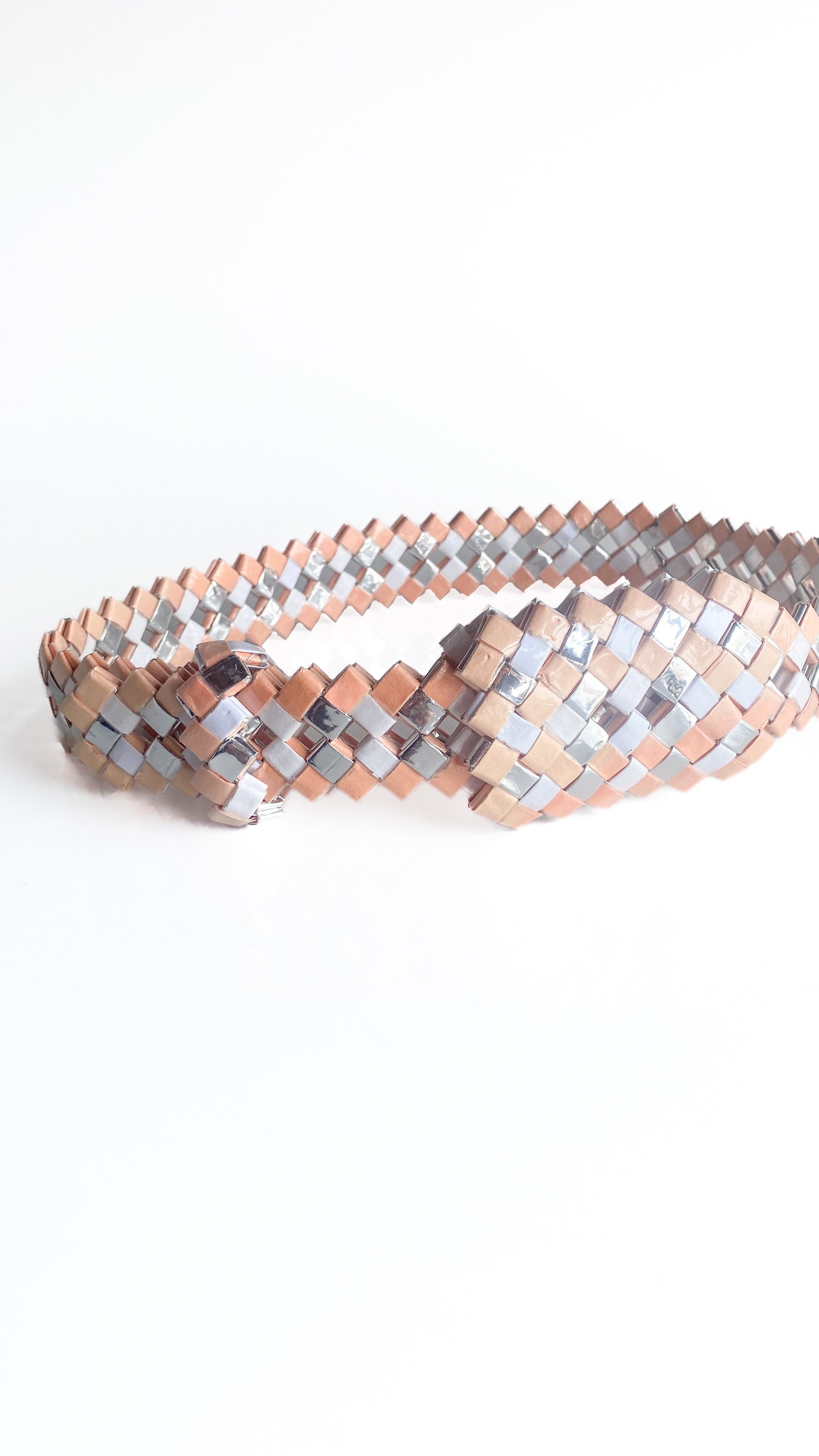 Belt made from woven wrappers. Peach, white, and silver coloring. Belt loop but no clasp.