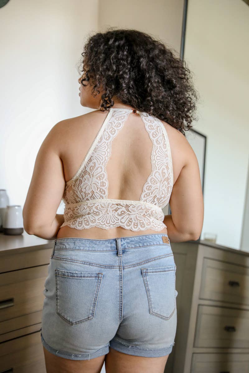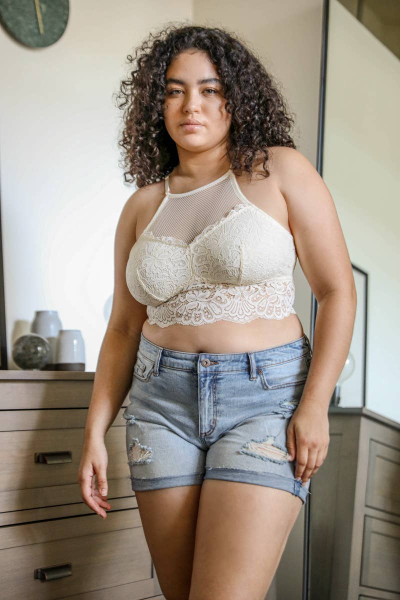 High neck cream colored bralette in cream lace. Has adjustable racerback straps.