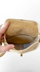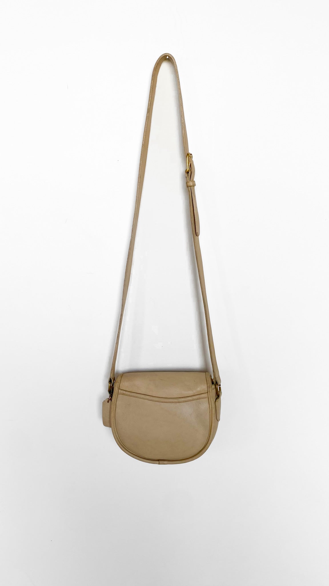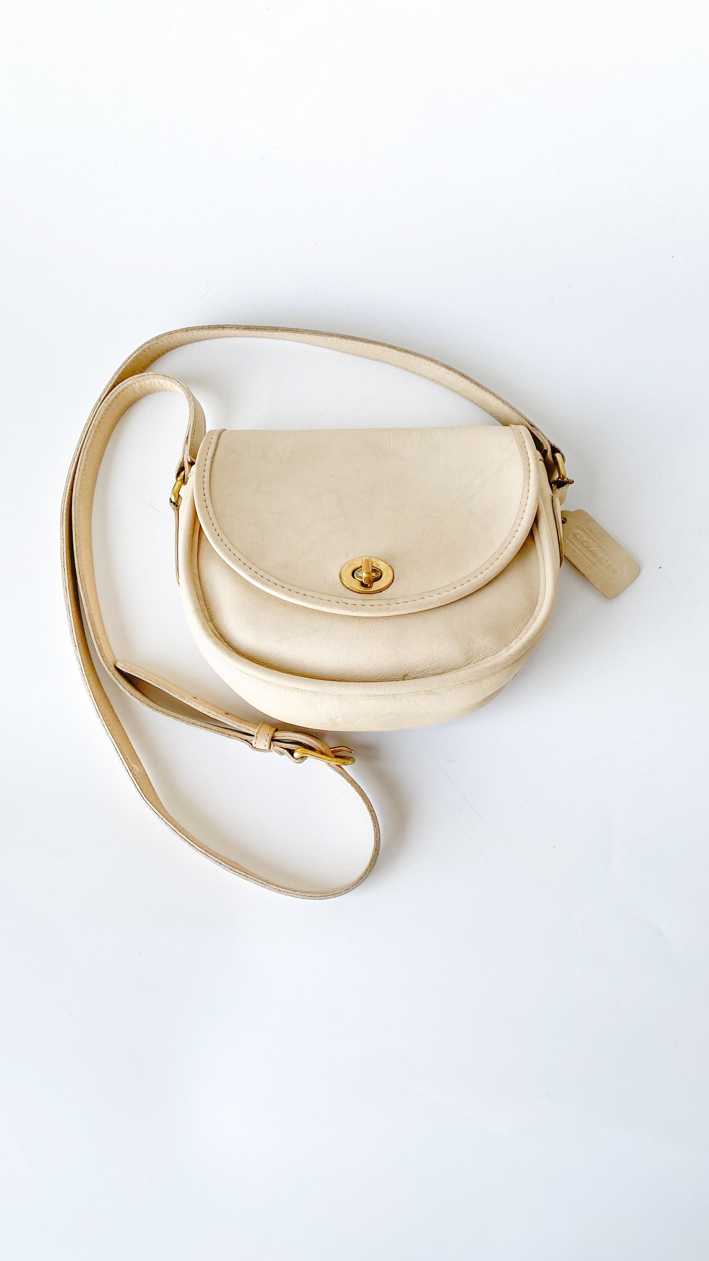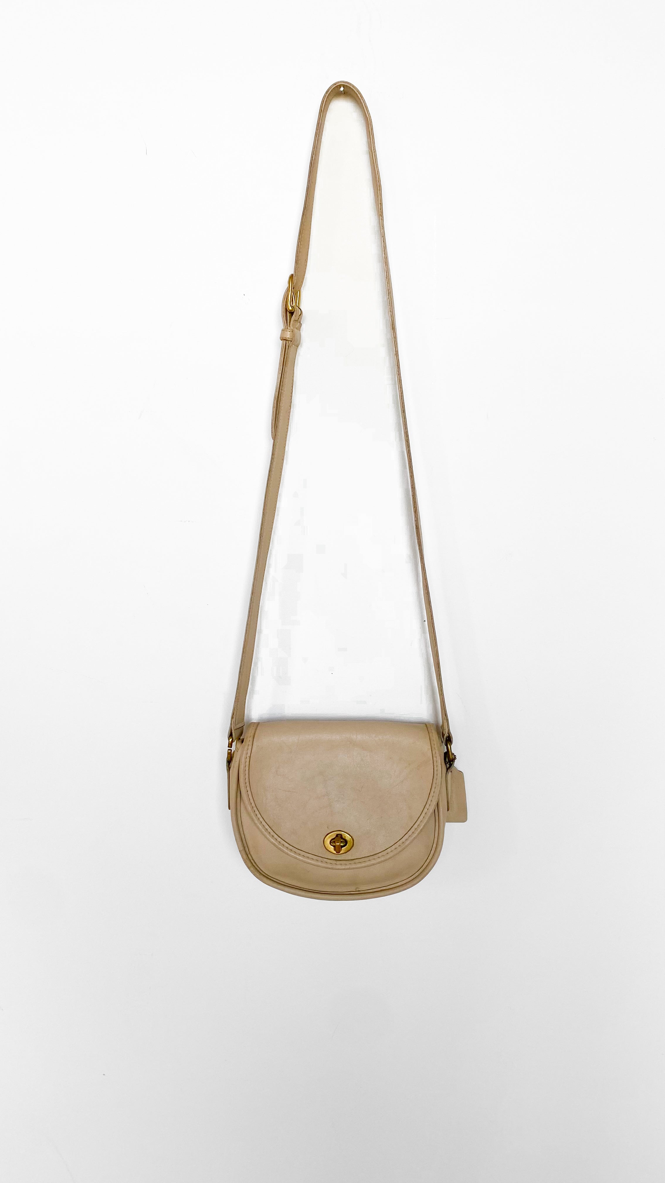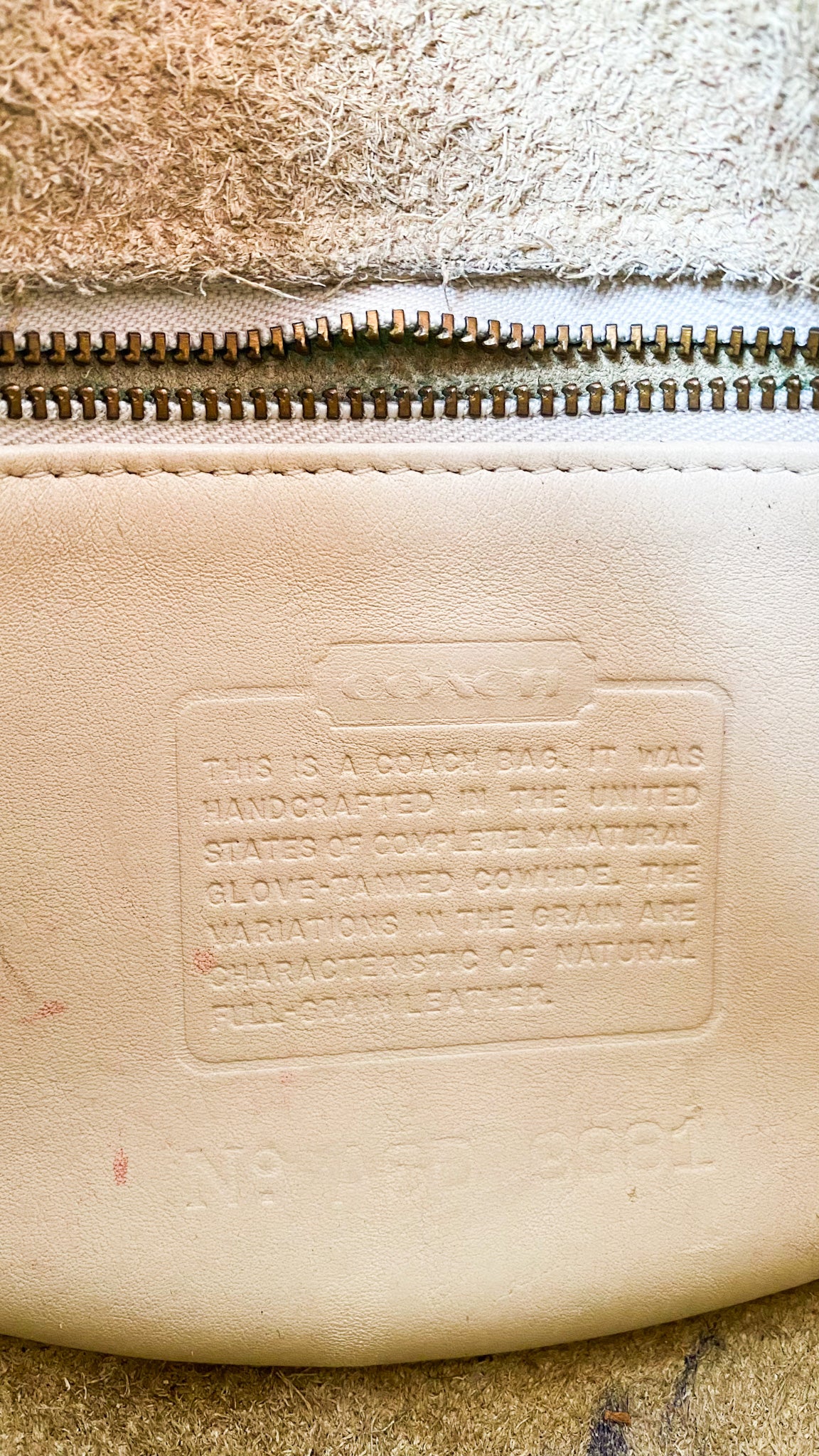 Description: 1996 leather Coach shoulder bag in bone color with adjustable strap and small interior zipper pocket. Classic Coach twist clasp closure. Unlined. Coach leather keychain tag.