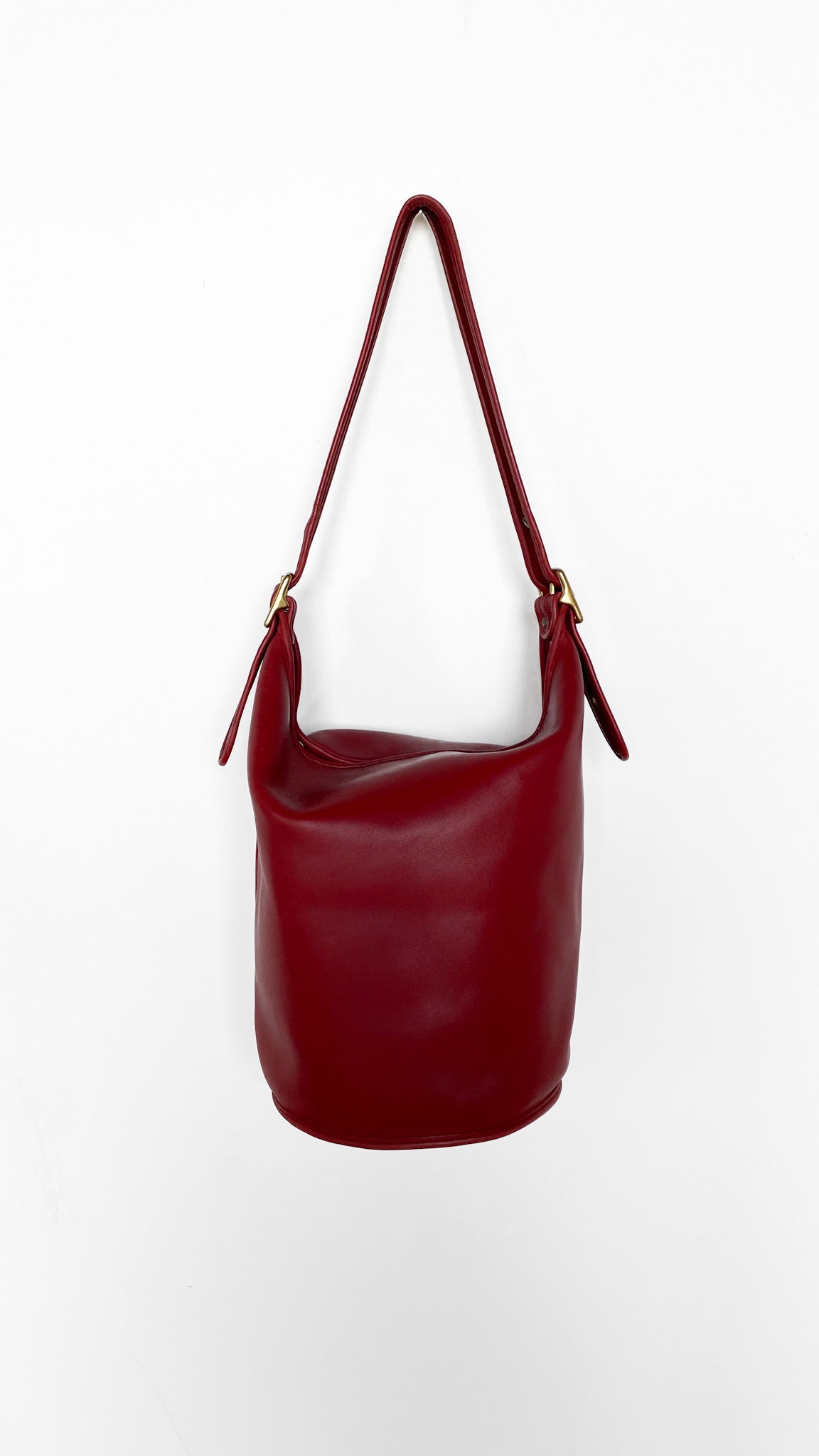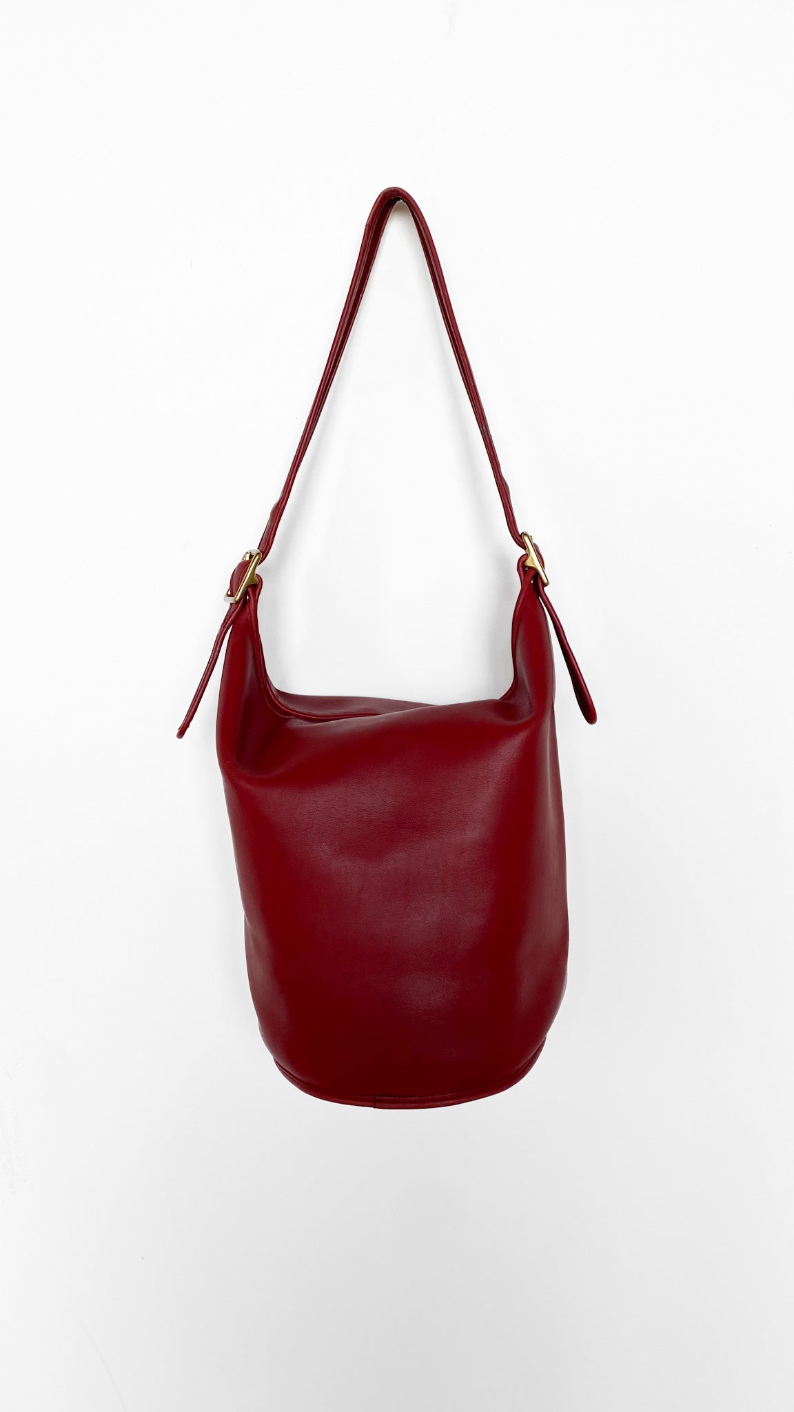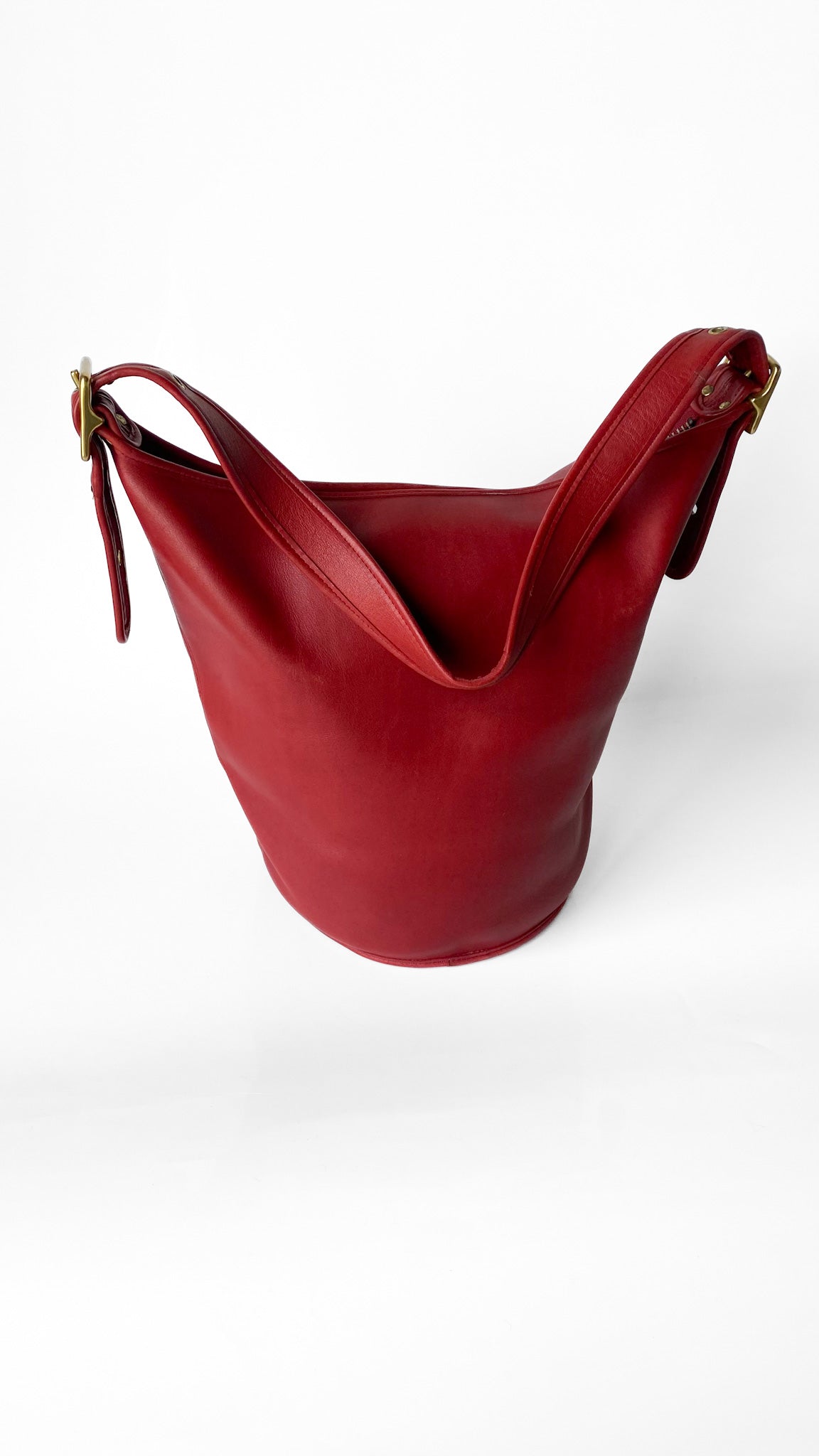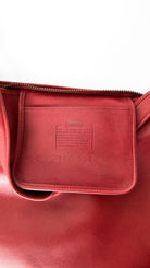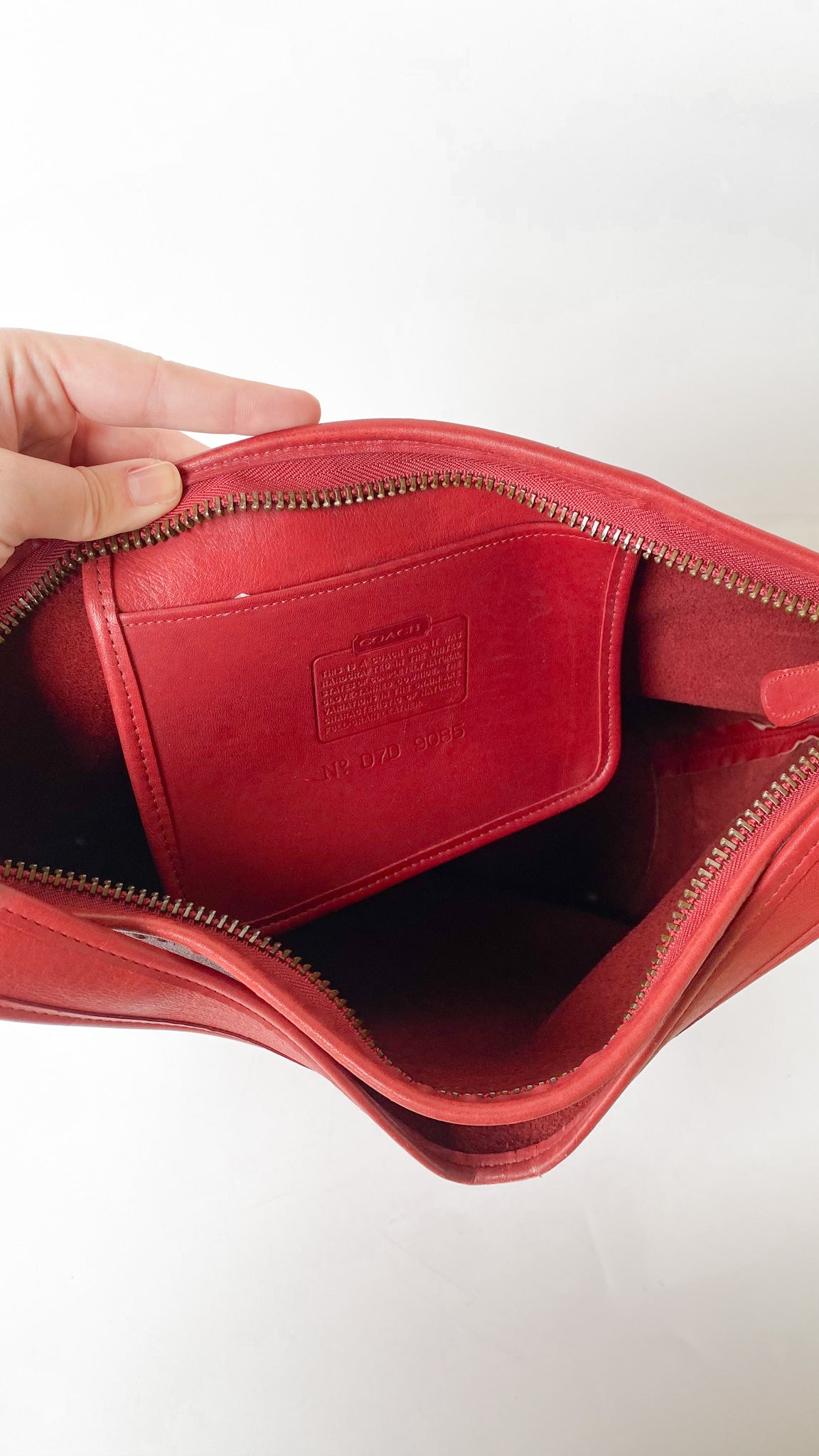 Description: 1997 red Coach leather shoulder tote bag with adjustable strap and zipper closure. Small interior pocket. Unlined, interior is suede.