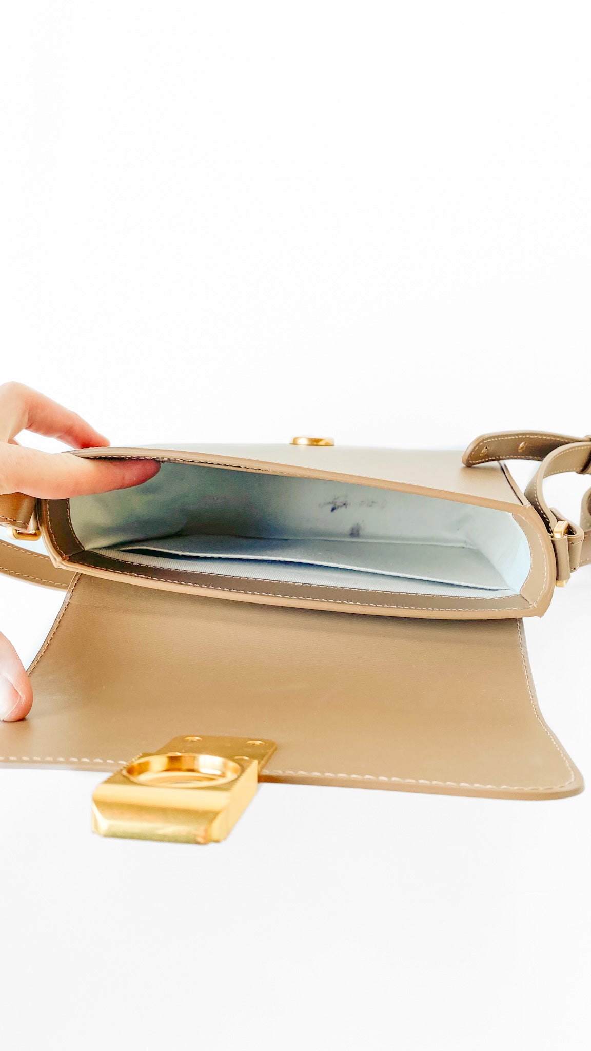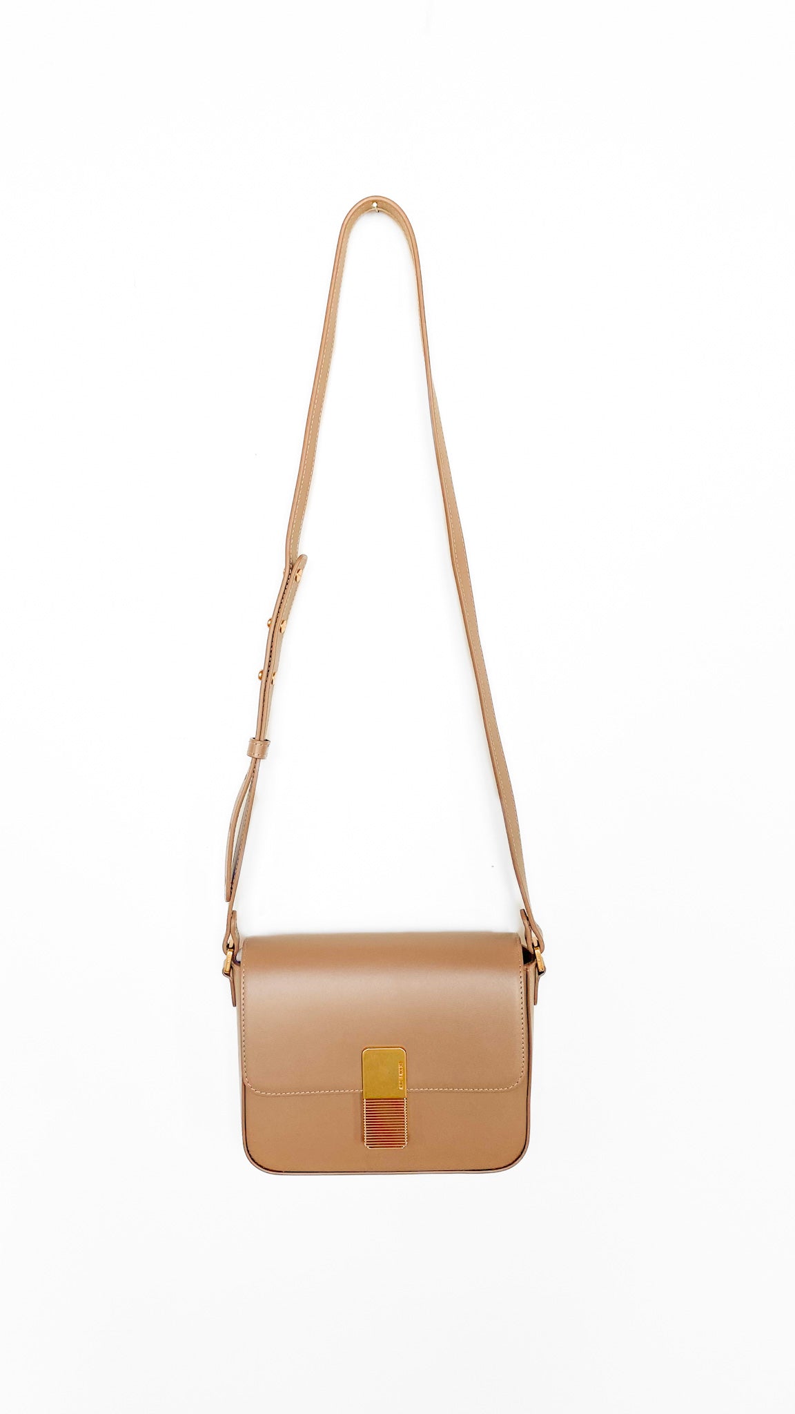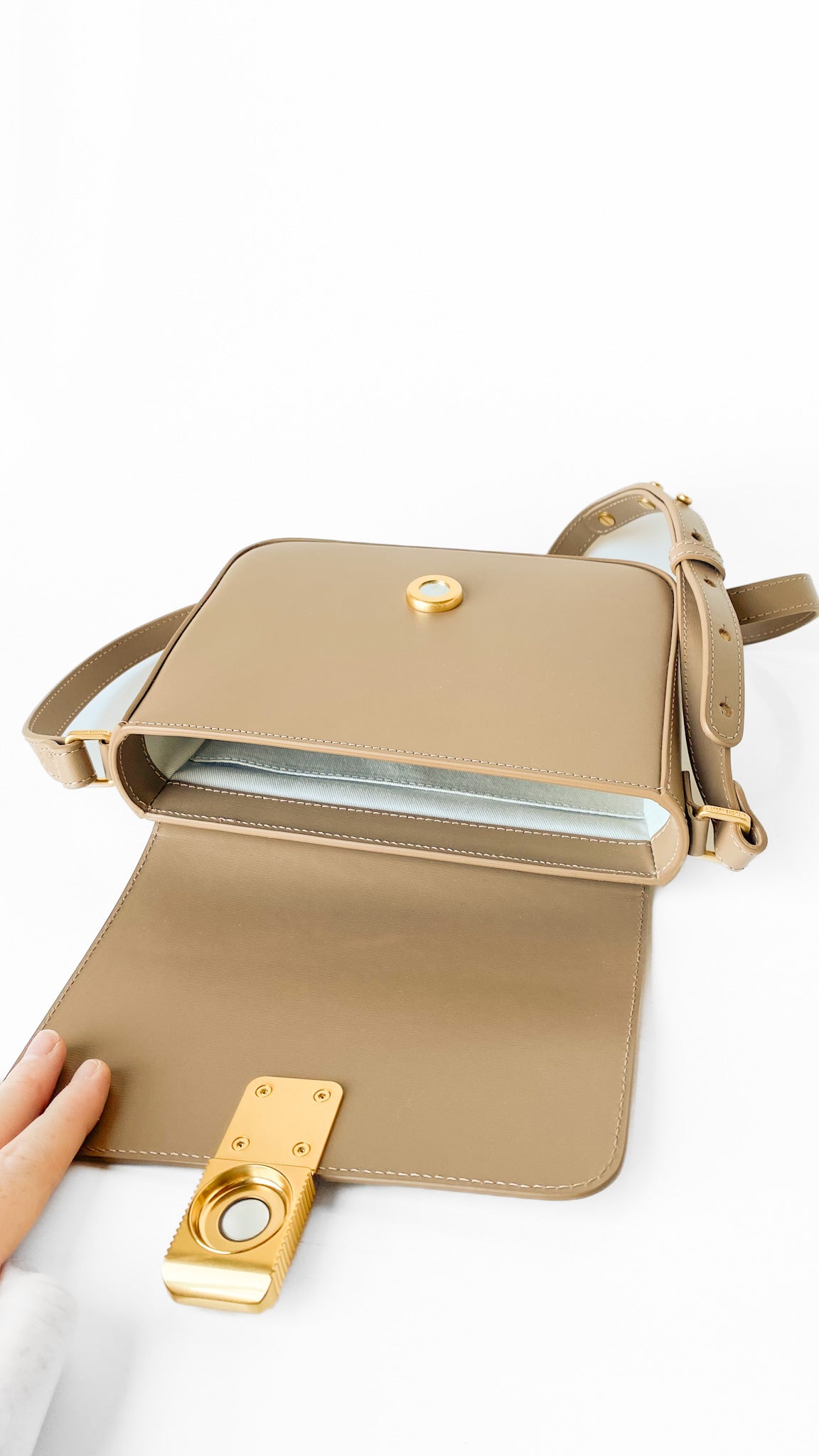 Mini Monceau Silver Edition. Cool tan genuine leather crossbody bag with gold magnetic clasp and long adjustable strap. One inside pocket.