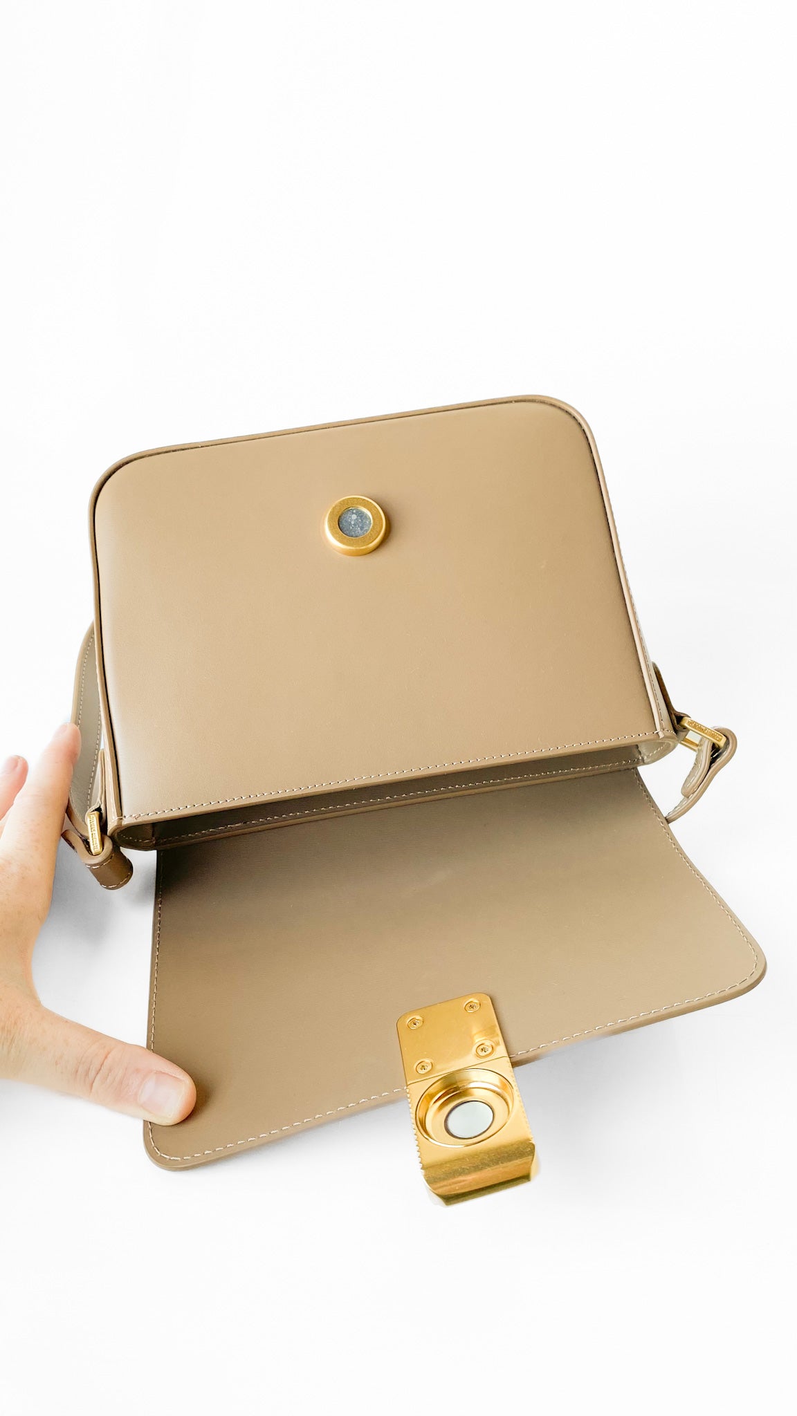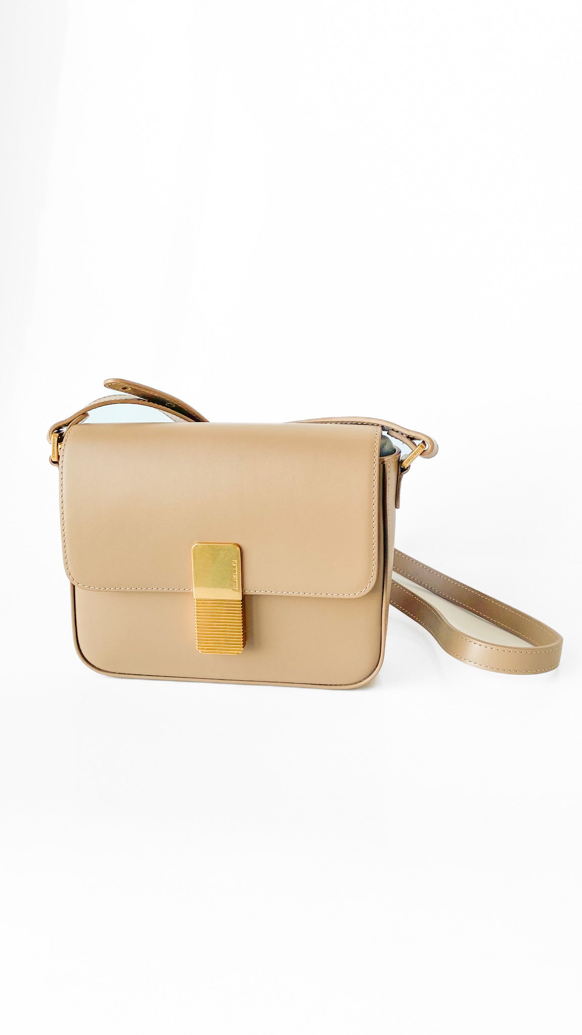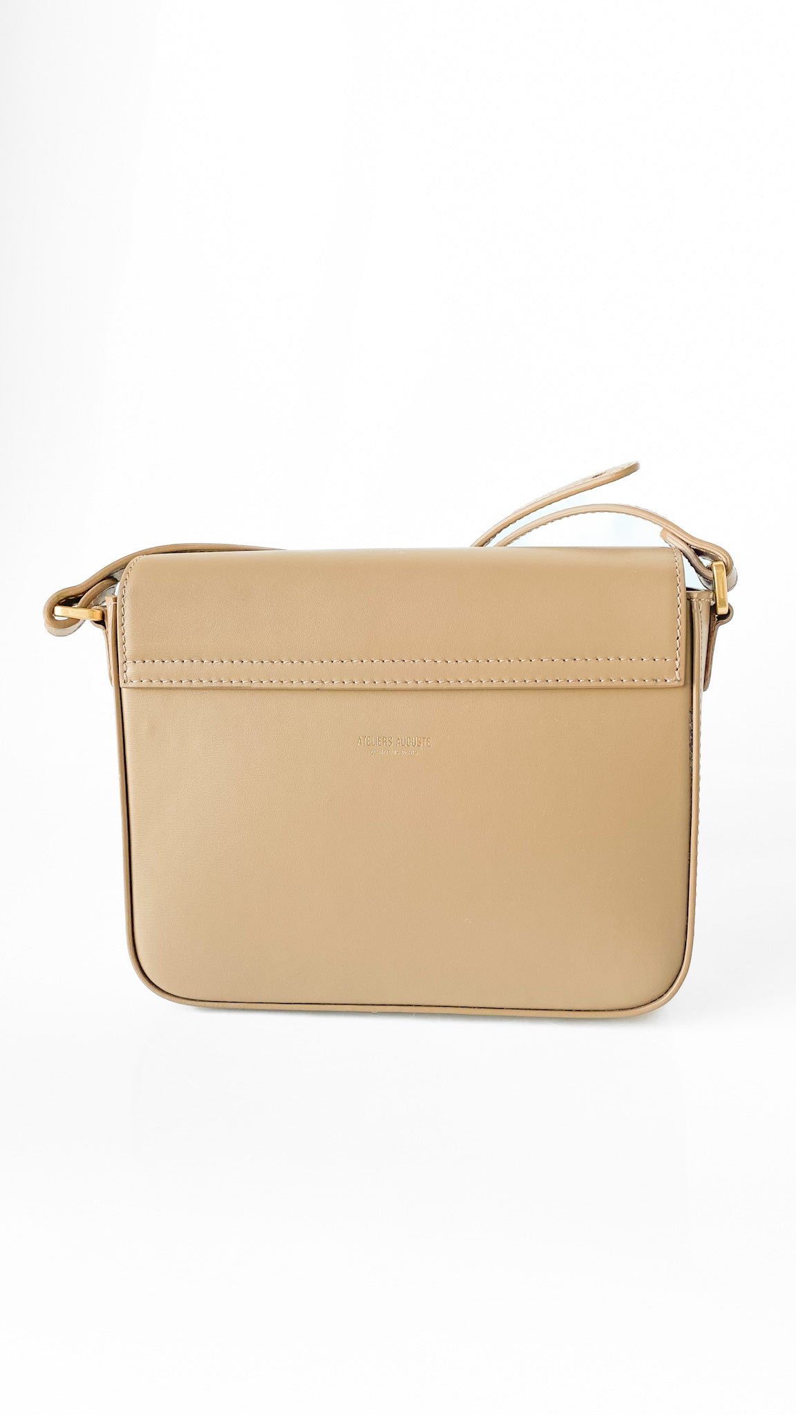 Mini Monceau Silver Edition. Cool tan genuine leather crossbody bag with gold magnetic clasp and long adjustable strap. One inside pocket.