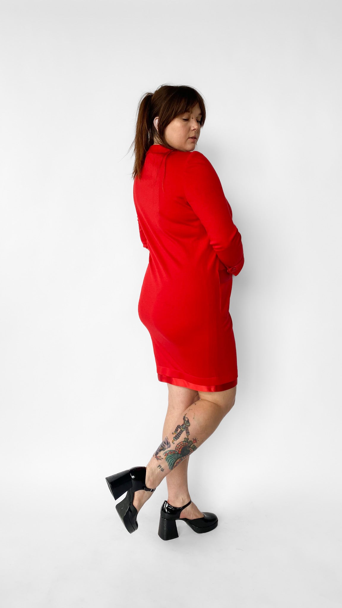 Bright red collared dress with long sleeves. Decorative jeweled buttons on cuffs and next to collar. Button closure down halfway on front. Pockets on front. Satin collar, cuff, and pocket details. Stretchy knit fabric. On a smaller size could fit like an A-line dress, on a larger size would fit more like a wiggle dress.