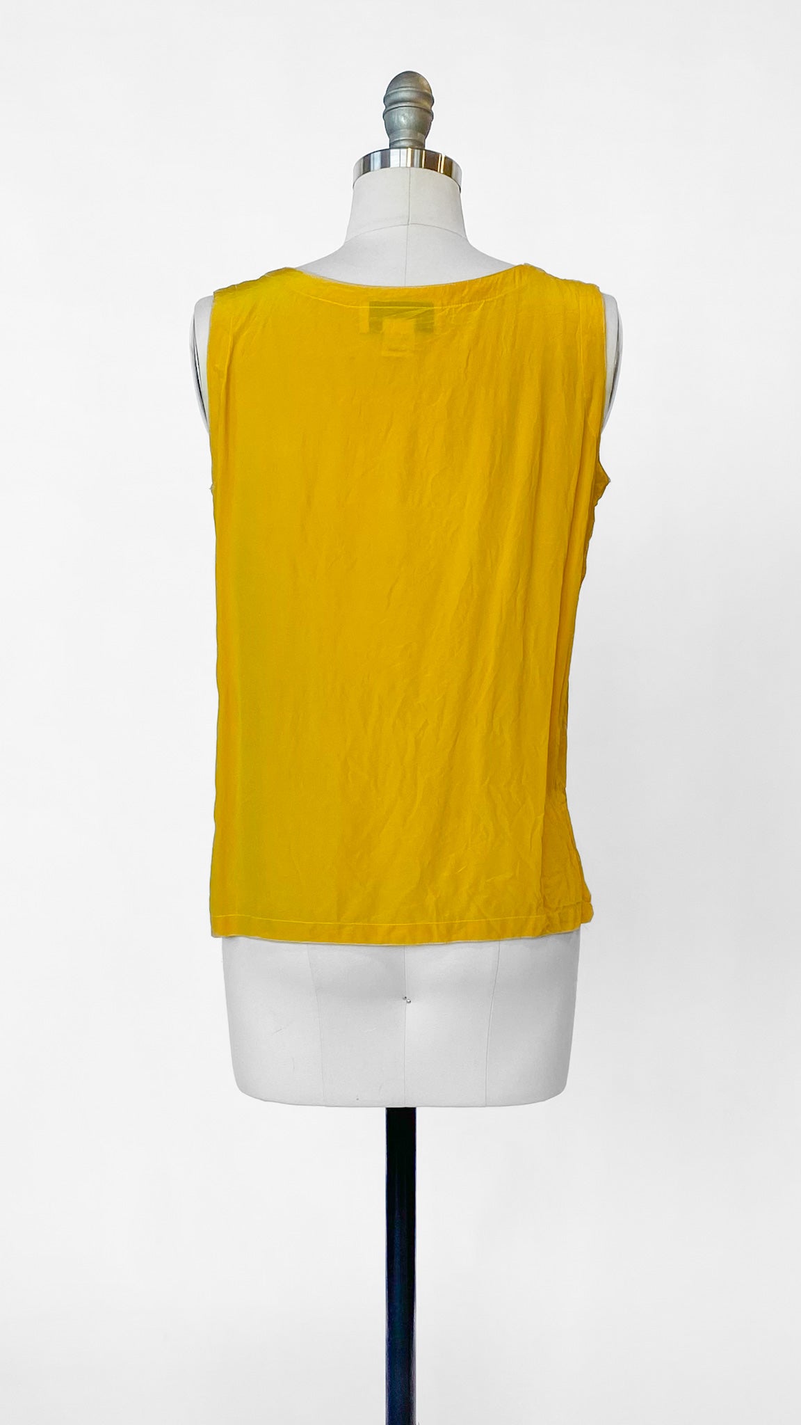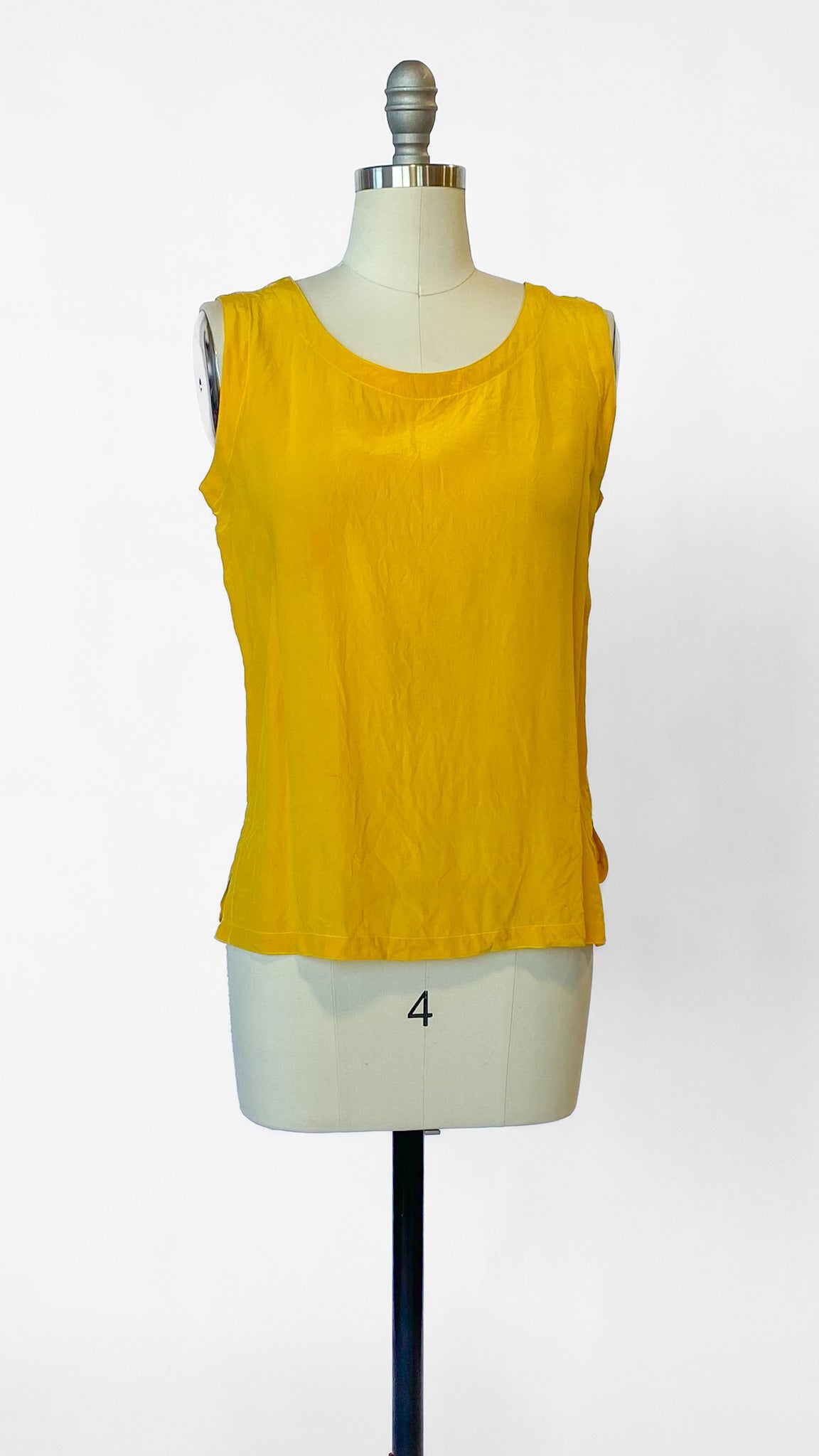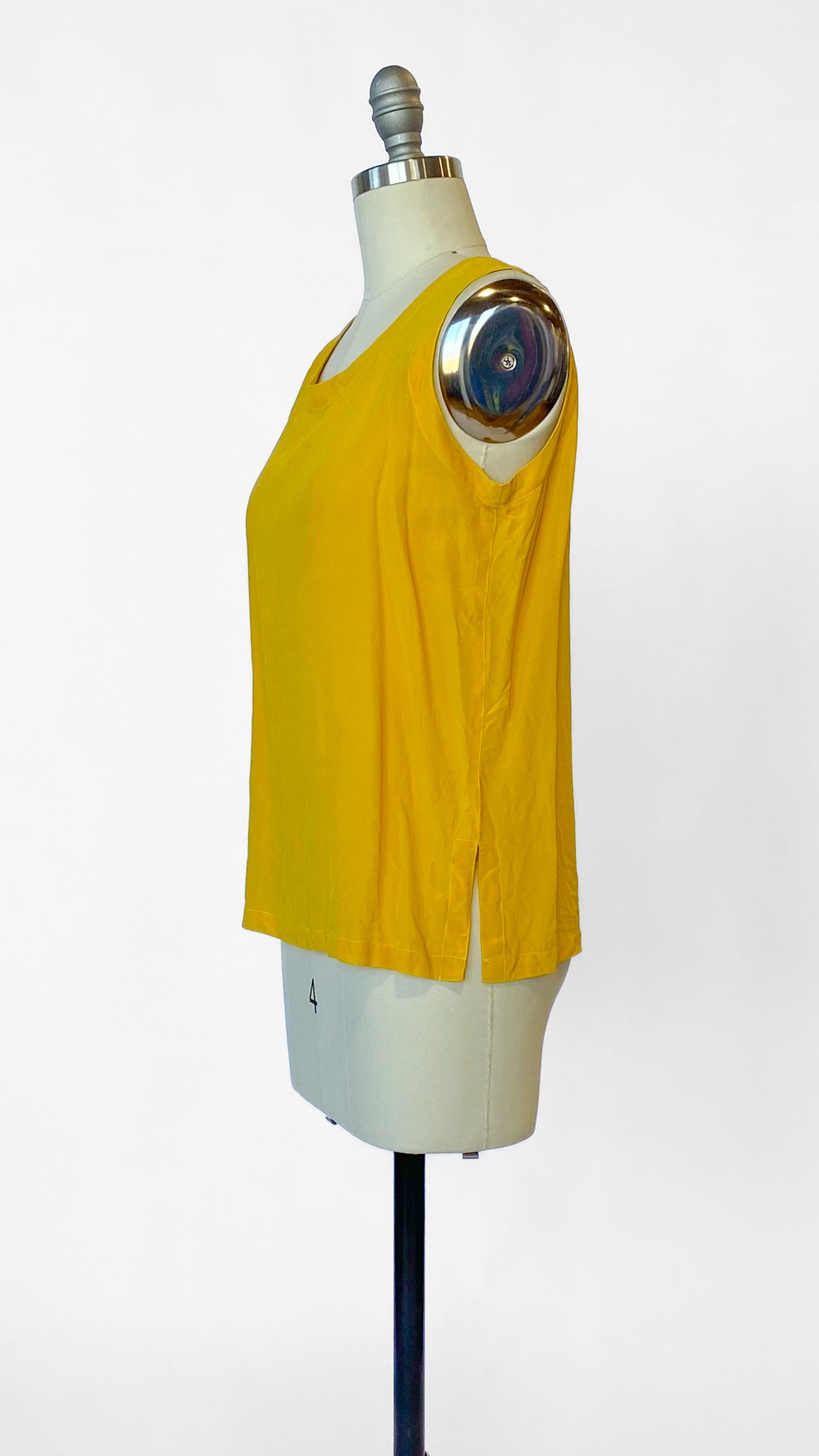 Classic cut mustard yellow sleeveless tank top with short slits at sides, no closures.