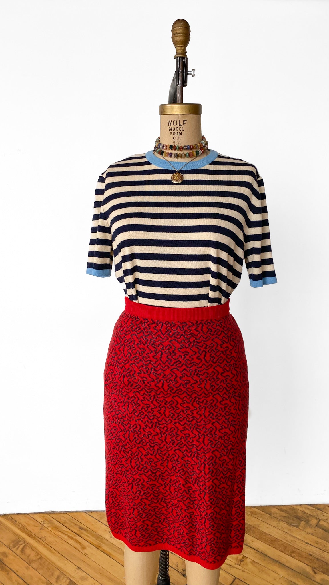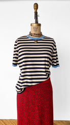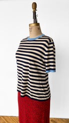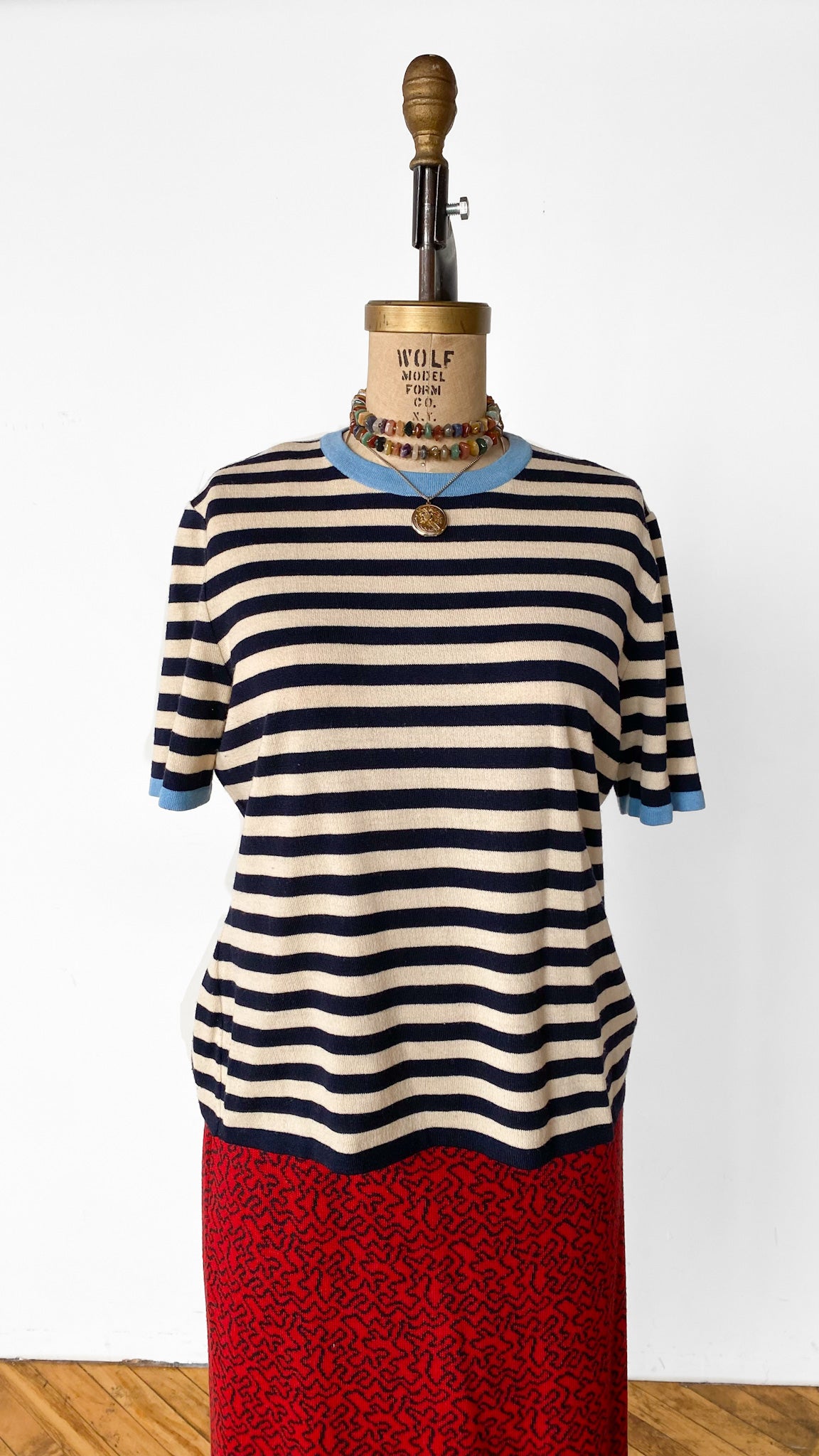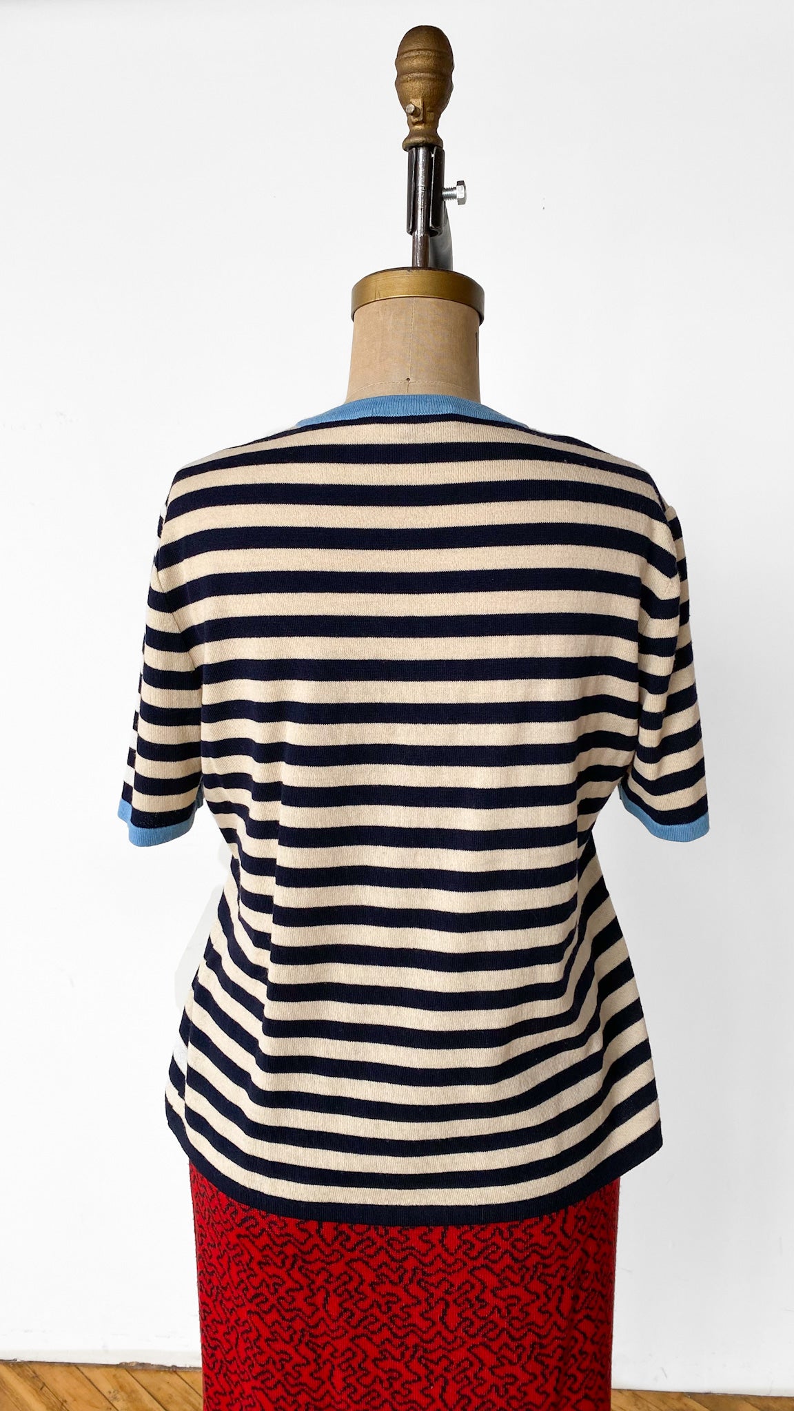 Ivory and dark navy blue vertical striped knit short sleeve shirt with light blue trim.