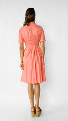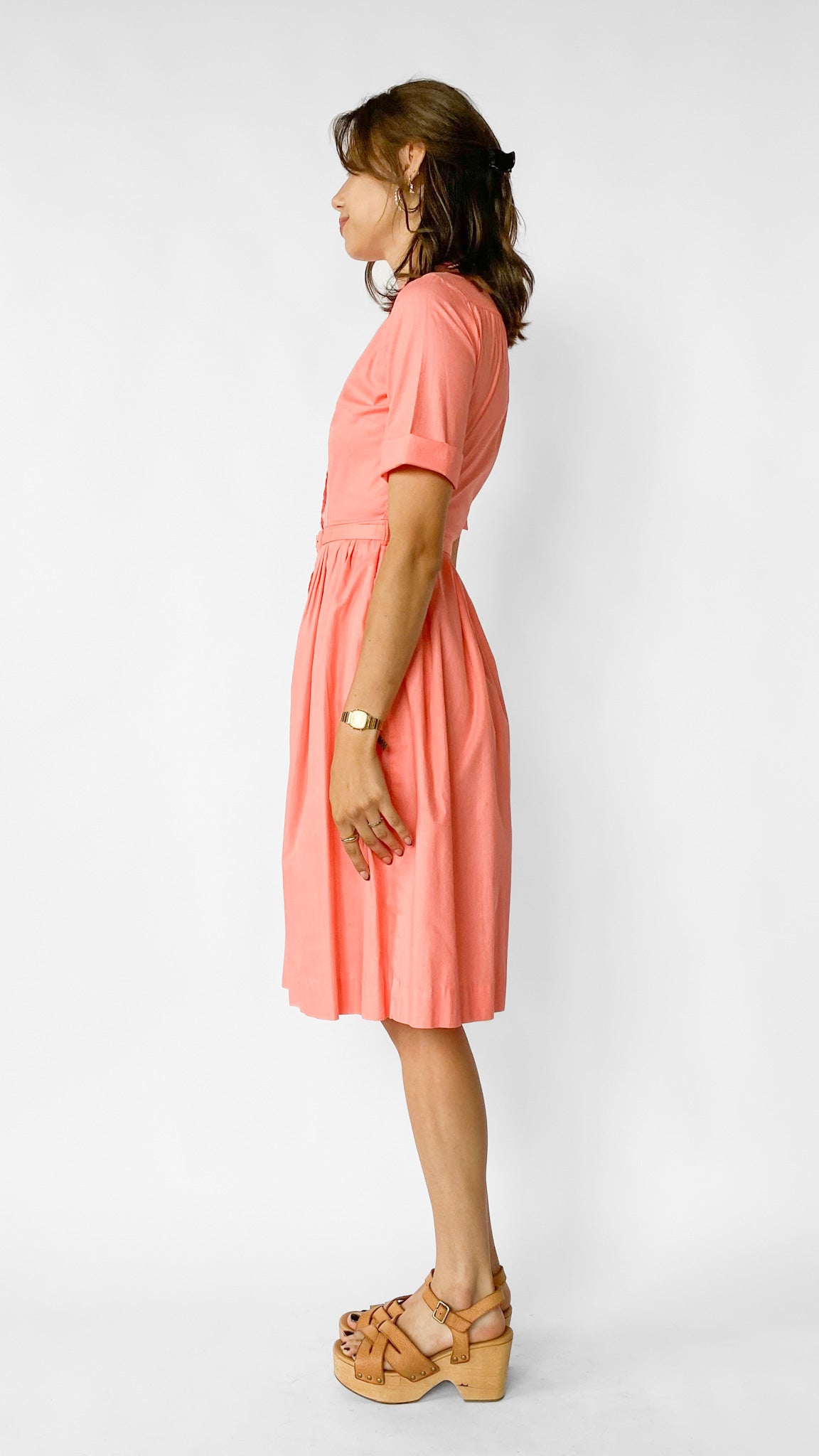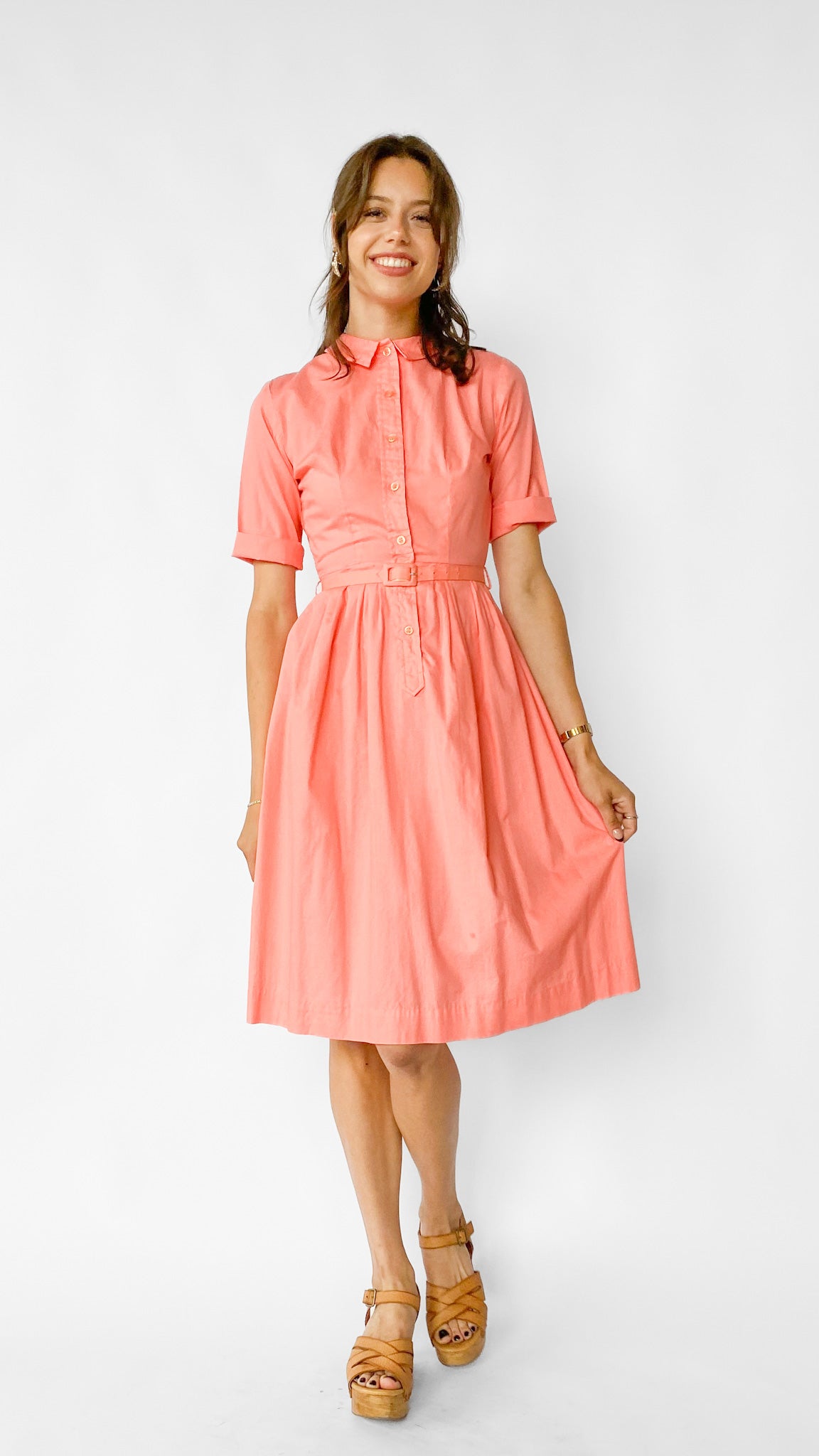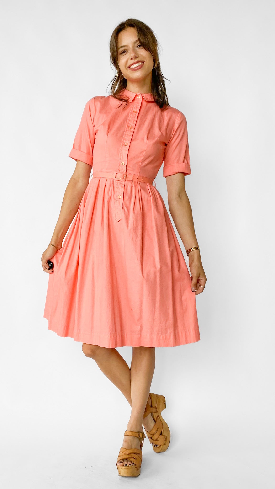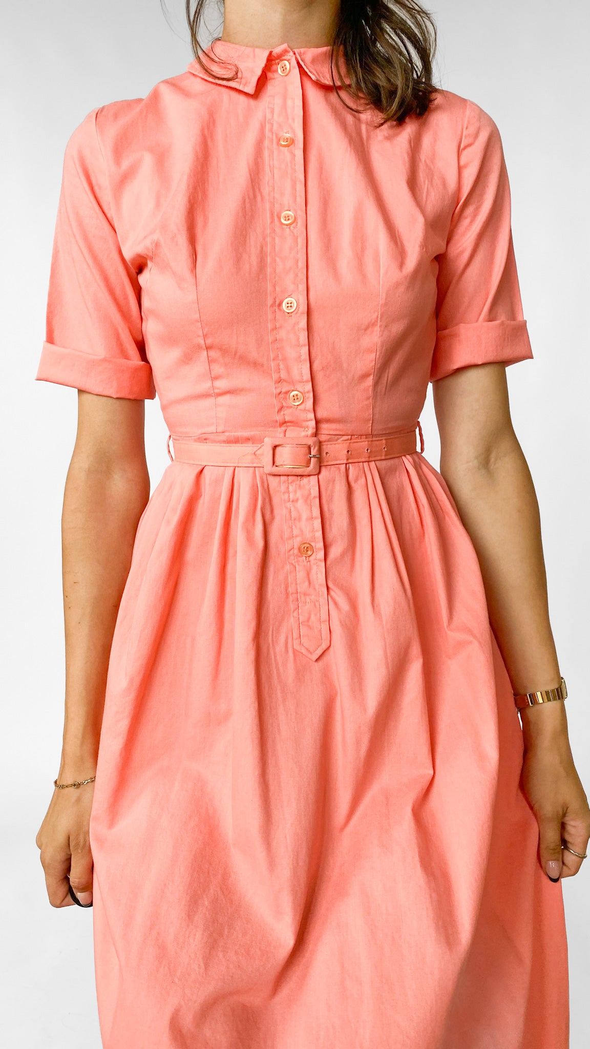 Description: Coral shirt dress with buttons 3/4 way down front. Comes with matching belt. Unlined.