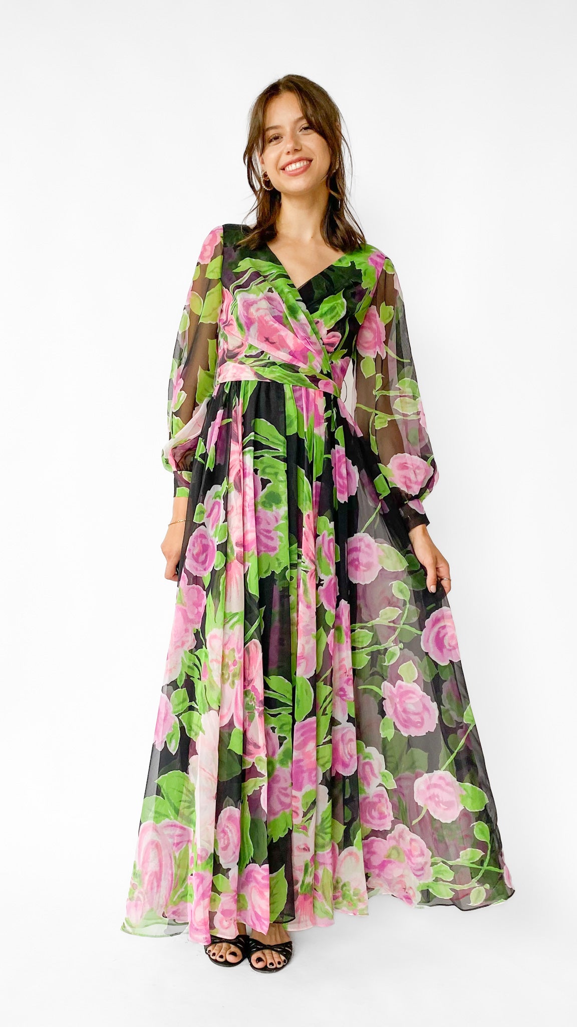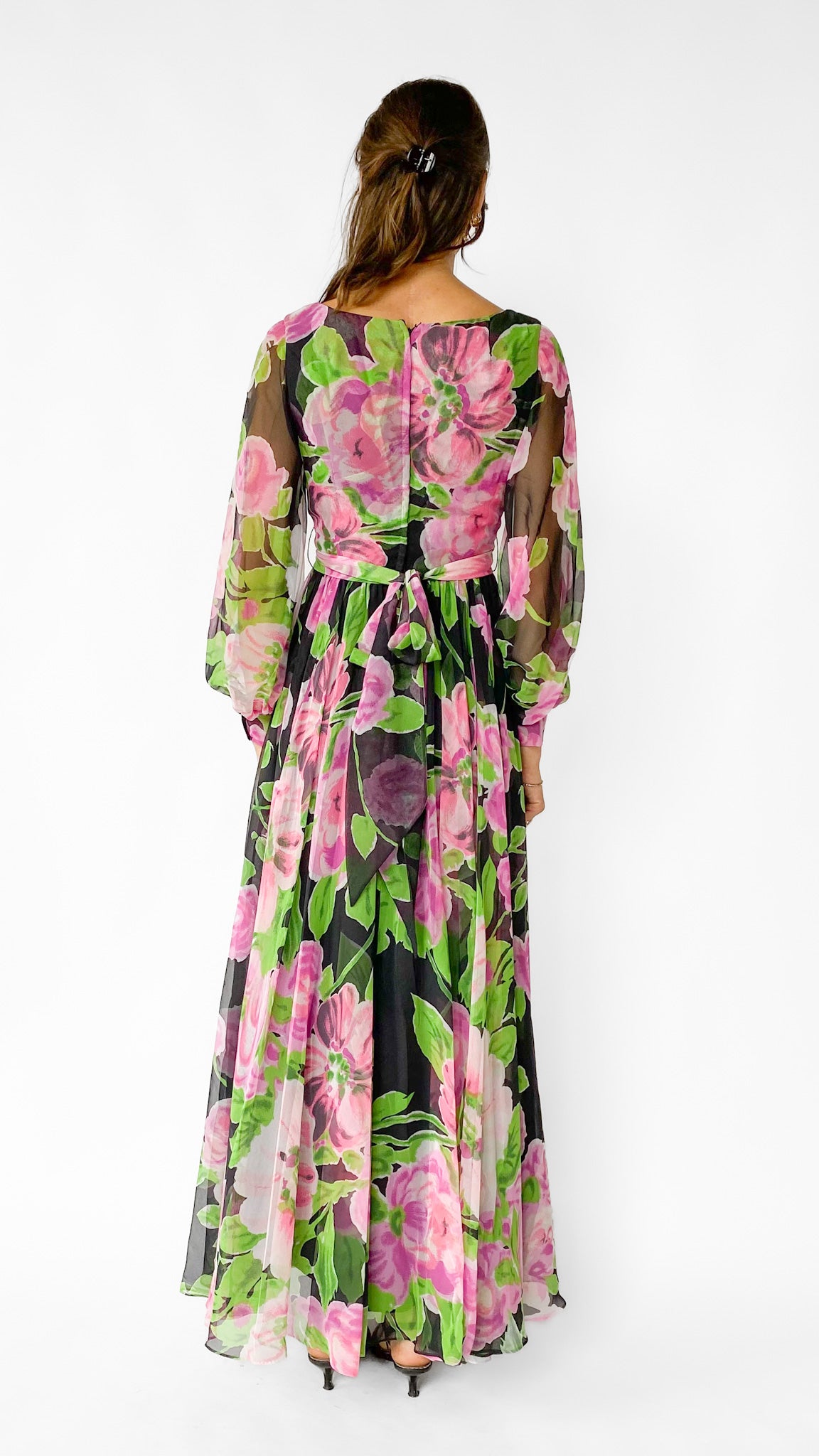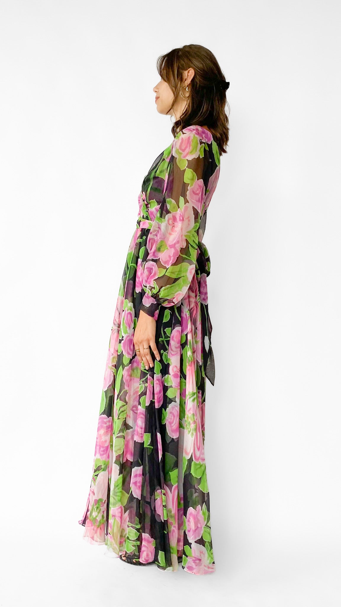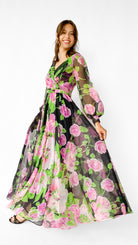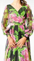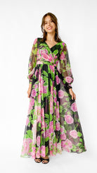 Black long sleeve full length faux wrap gown with large pink and green floral pattern. Gathered skirt, unlined sleeves with hook and eye cuffs, zipper in center back. Sash belt.