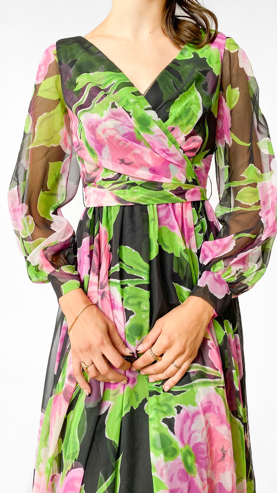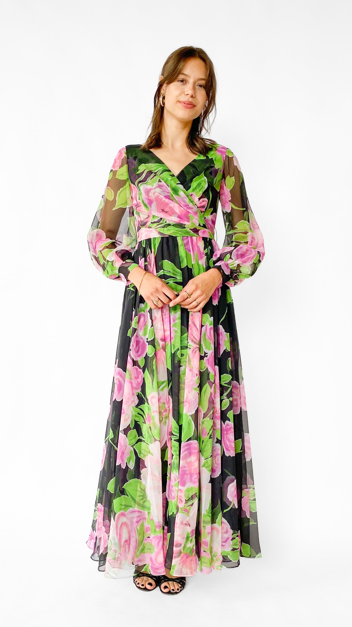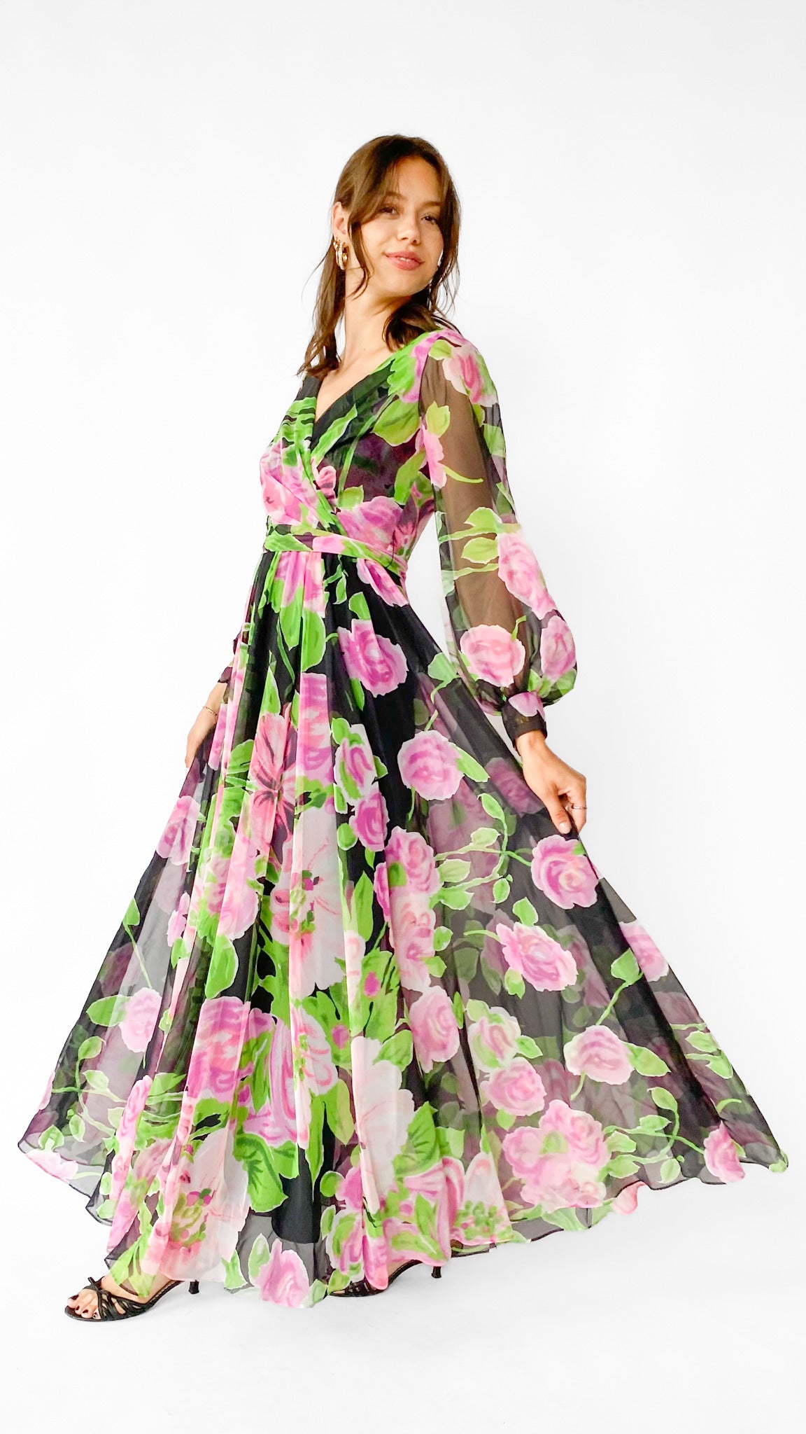 Black long sleeve full length faux wrap gown with large pink and green floral pattern. Gathered skirt, unlined sleeves with hook and eye cuffs, zipper in center back. Sash belt.