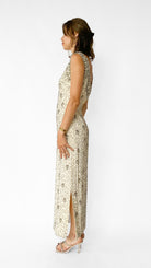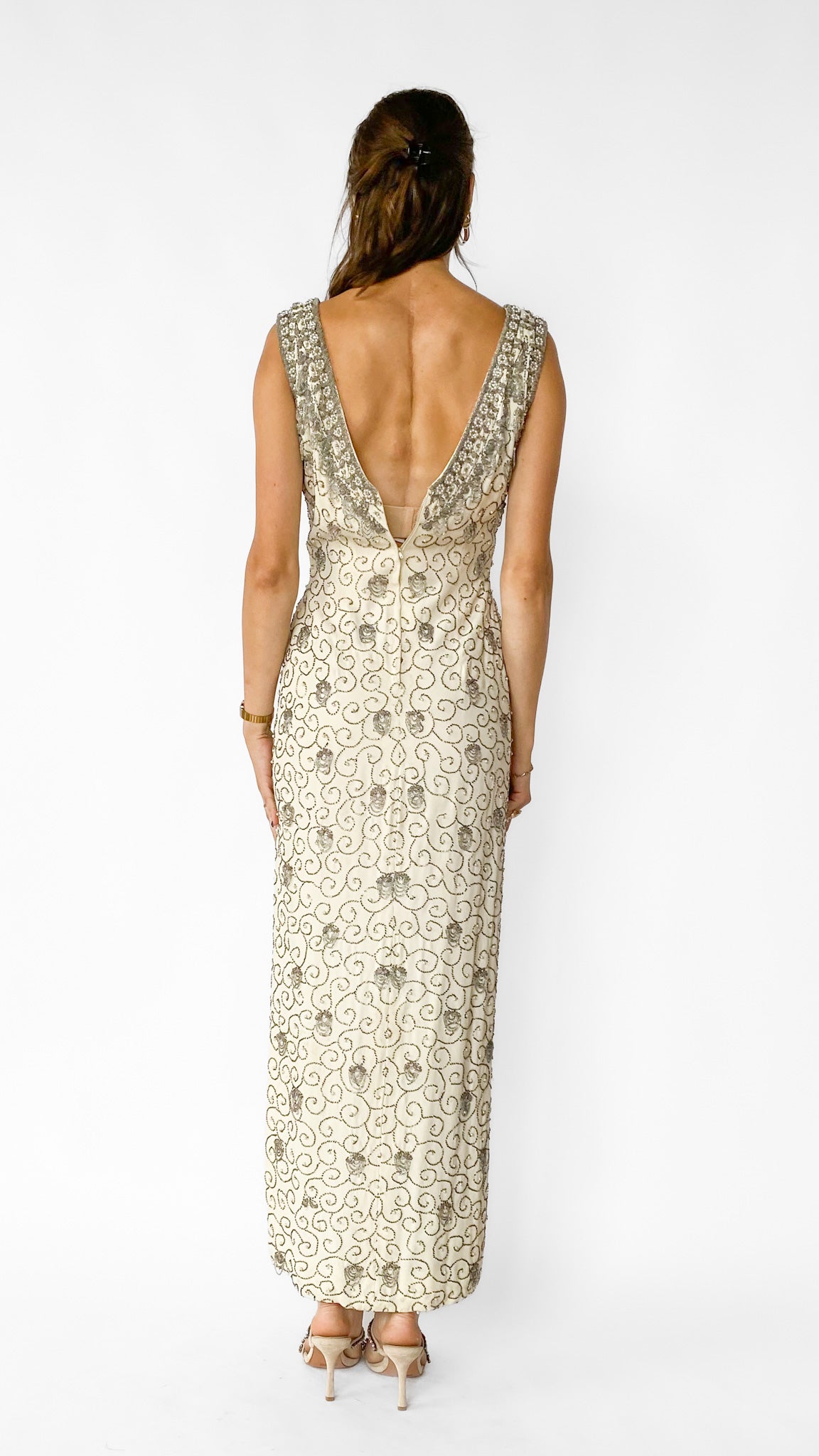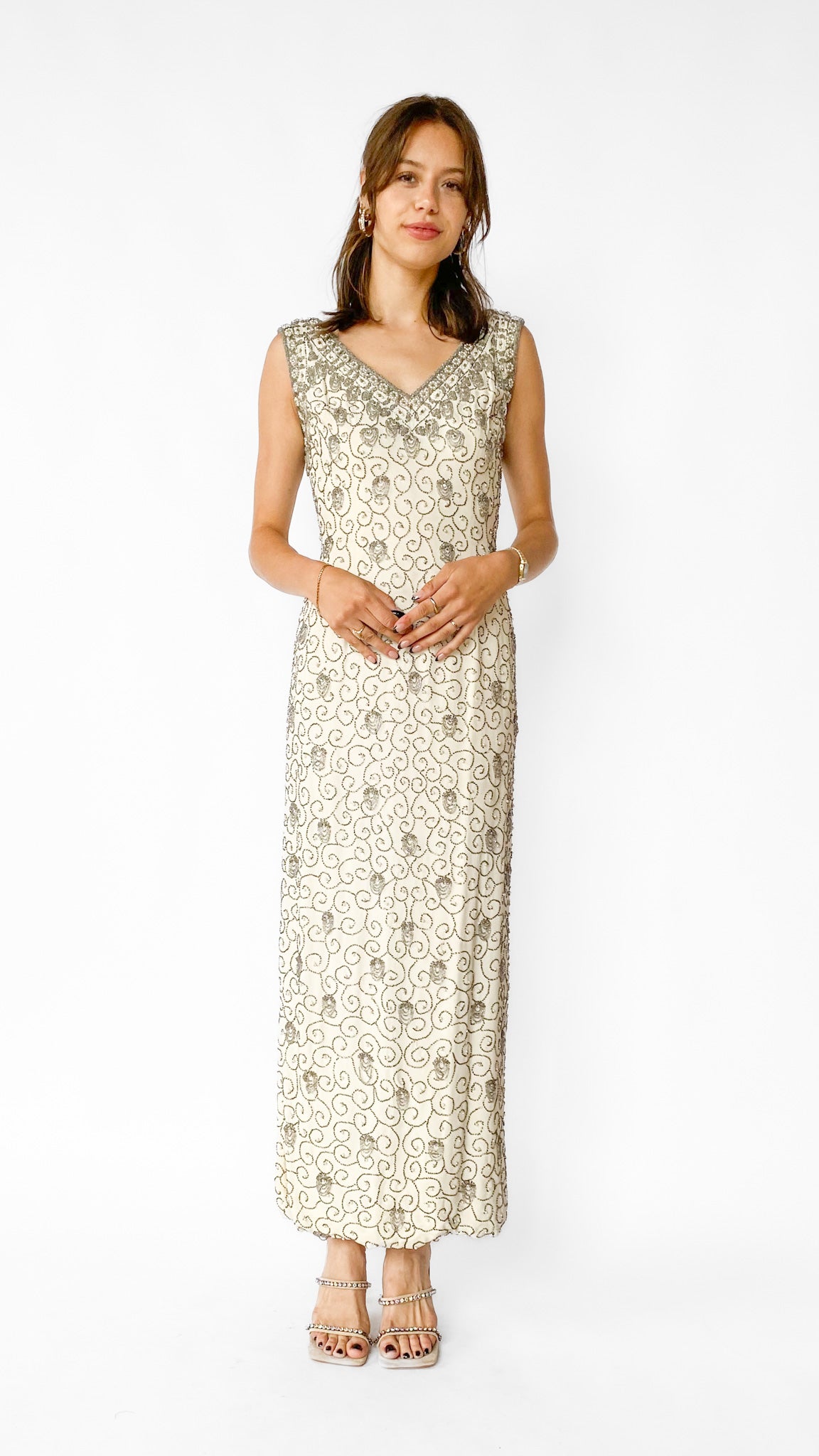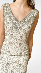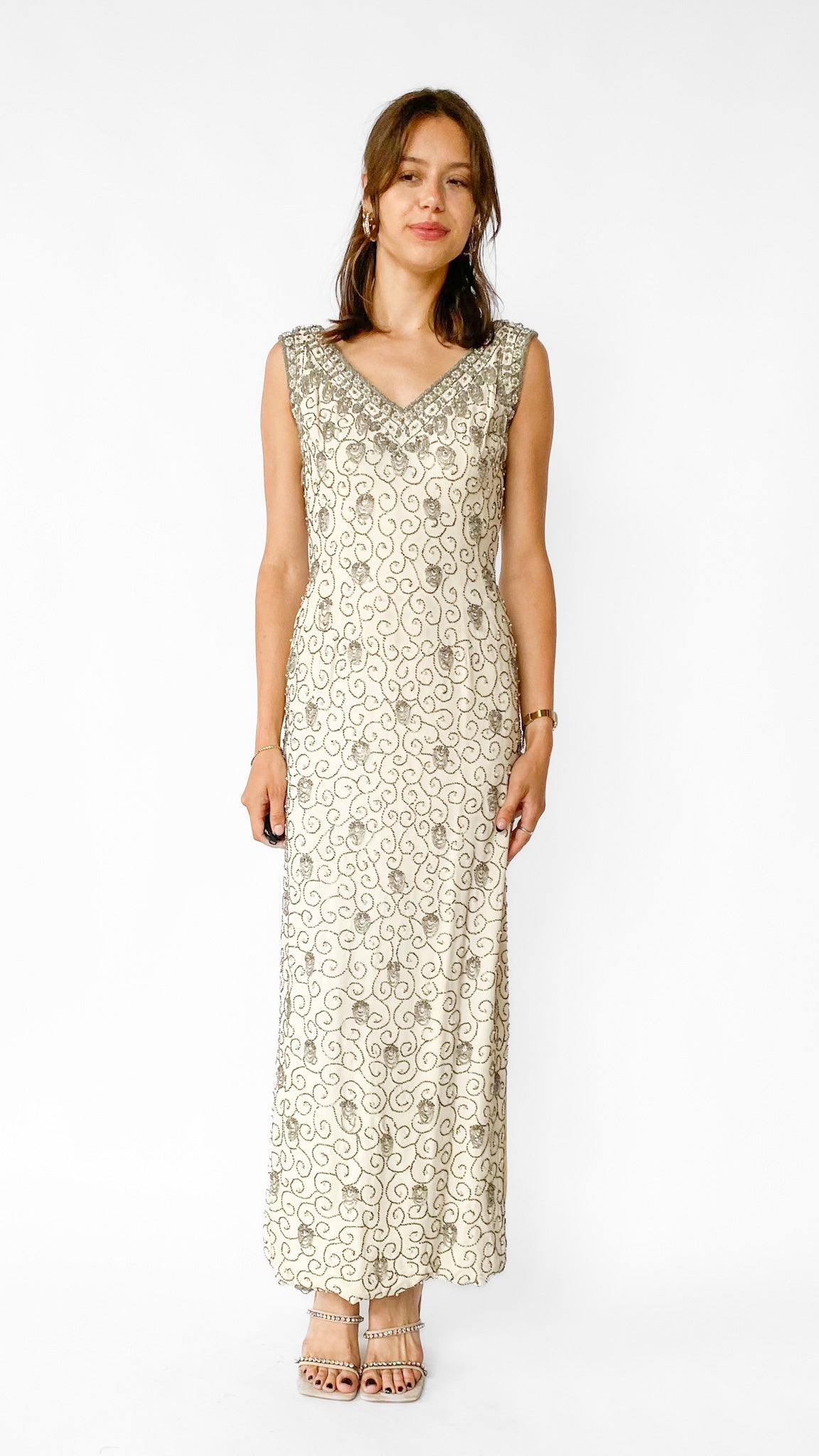 Full length ivory V-neck sleeveless gown with silver beading and faux pearls. 15" slits in both side seams.