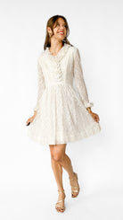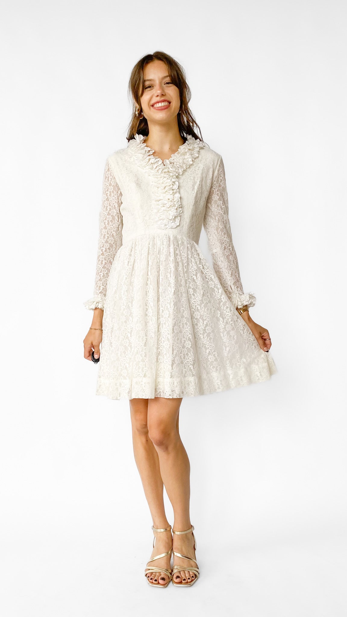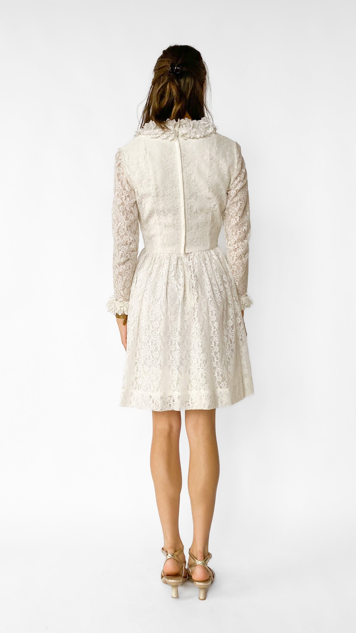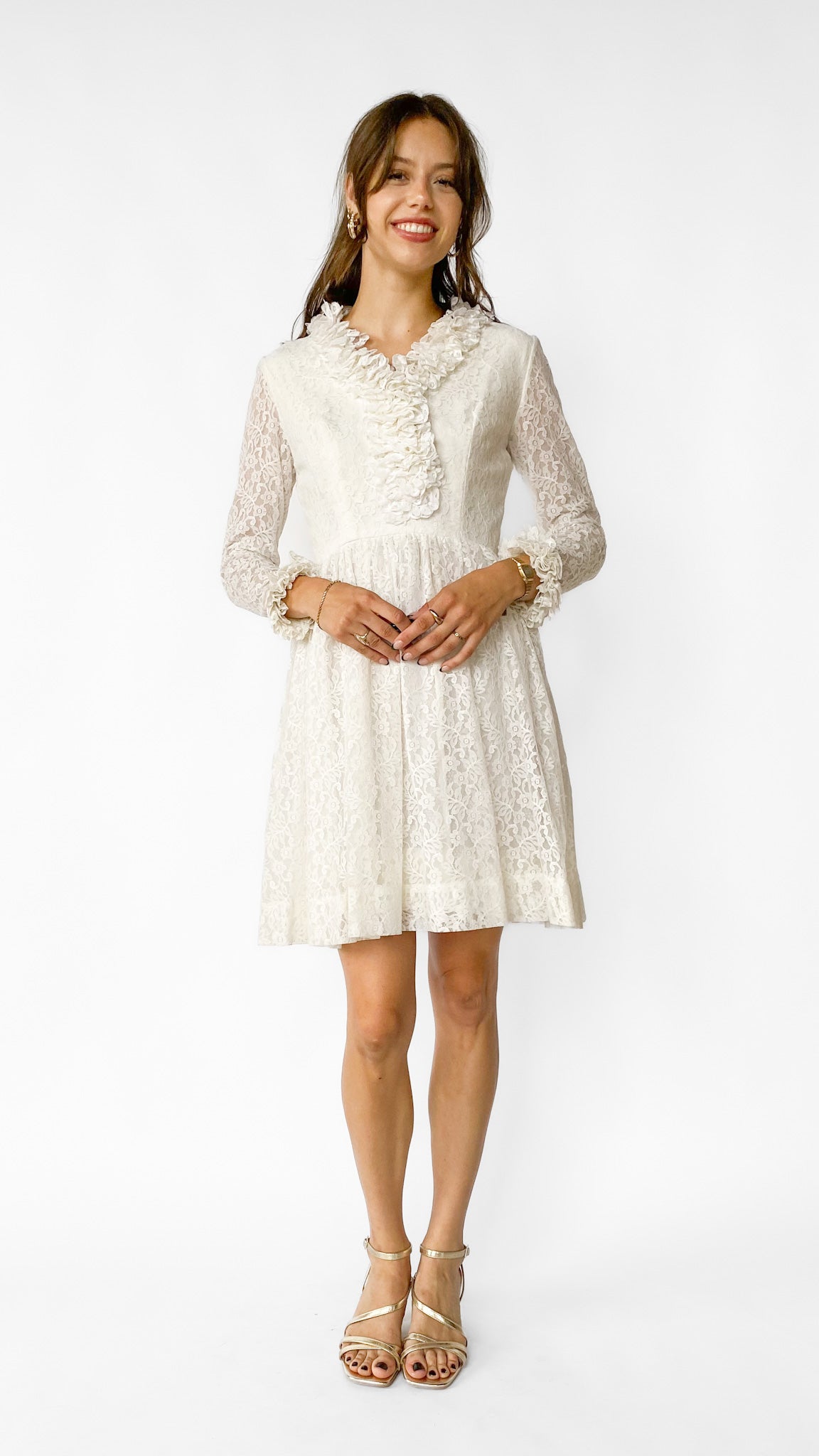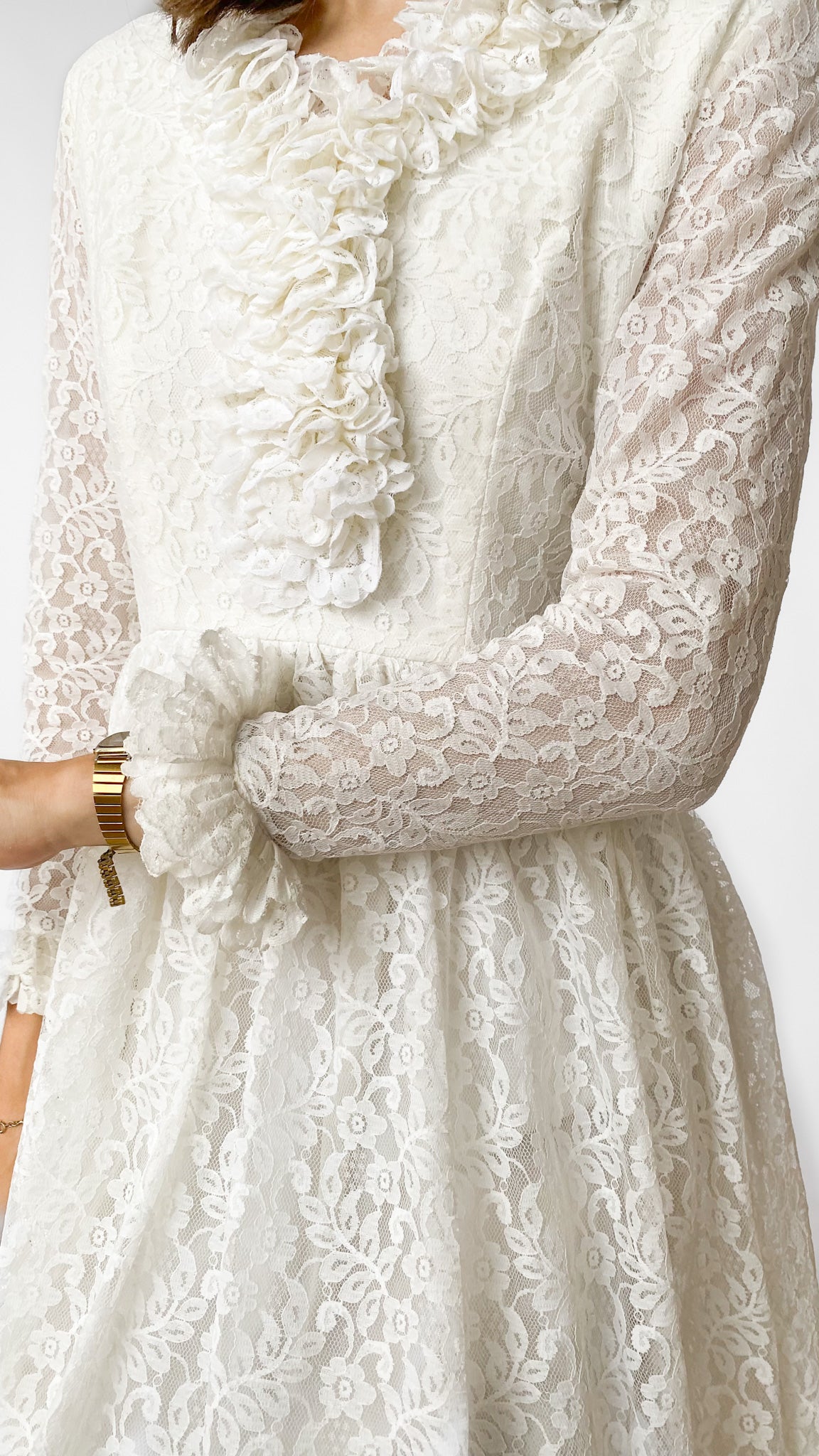 White lace dress with A-line skirt and ruffle that encircles neckline, long unlined sleeves with ruffle at wrist and snap closure. Zipper in center back.