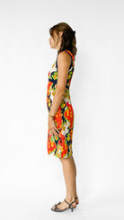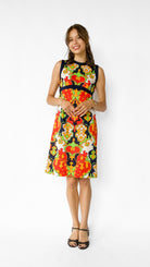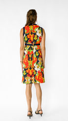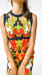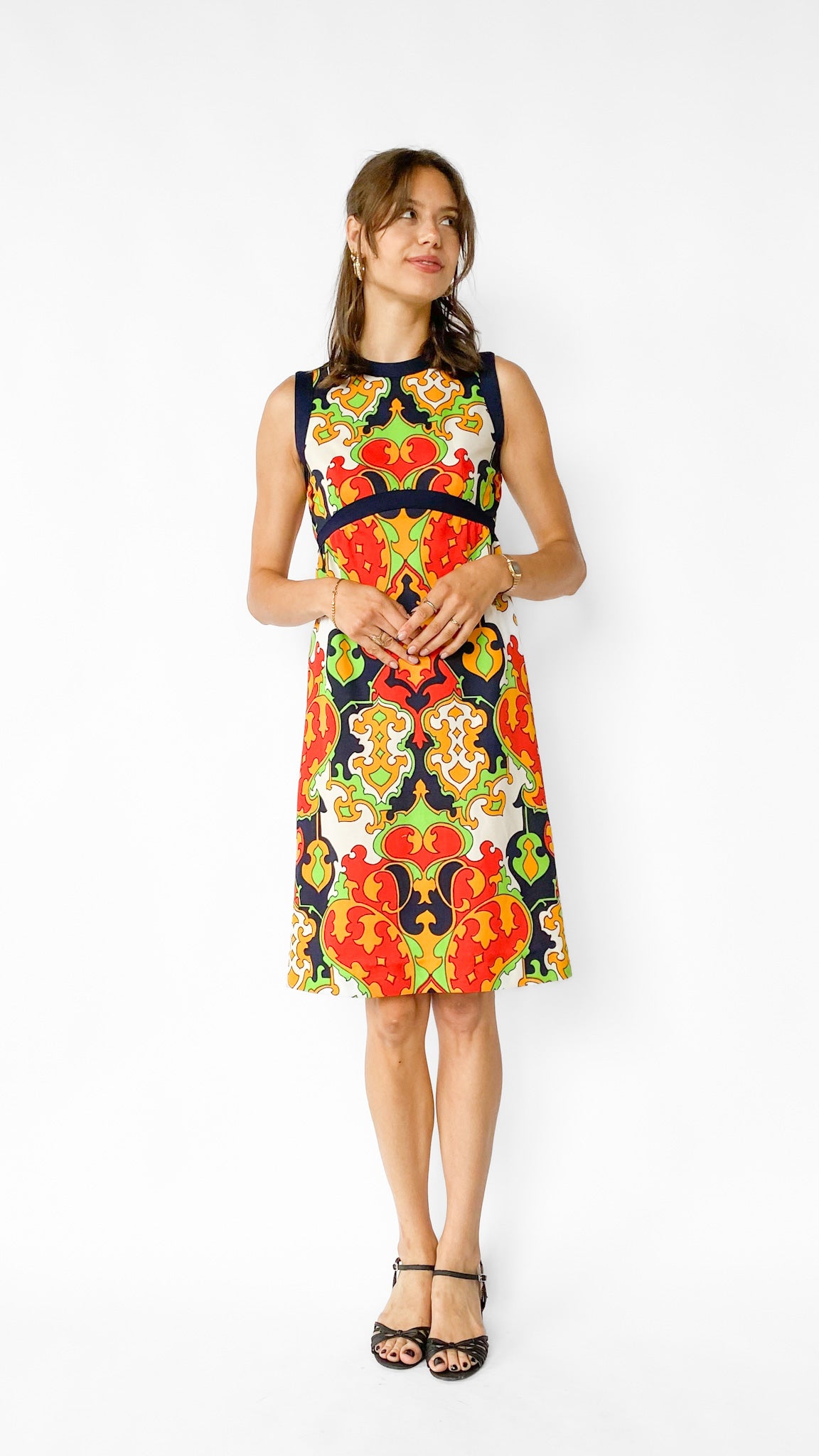 Sleeveless white sheath dress with navy blue waistband, neckline, and armholes. Bright green, yellow, and red geometric pattern. Zipper in center back.