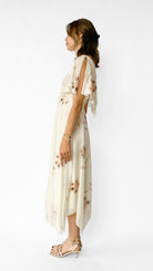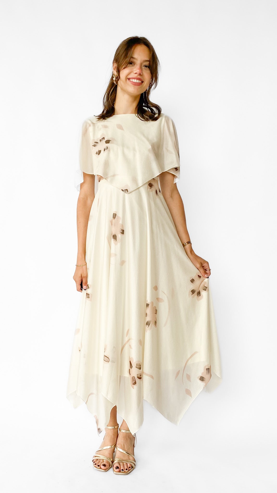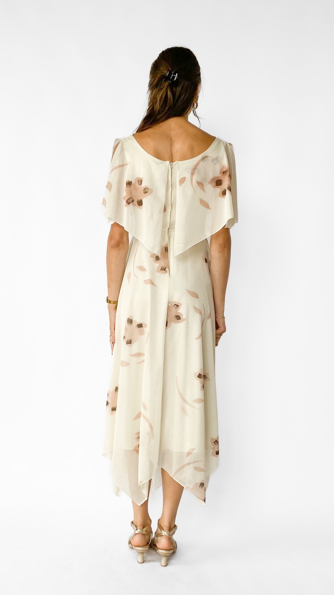 Cream colored dress with slight sheen, mauve abstract floral pattern, flutter bodice/sleeve, handkerchief hem, hidden zipper in center back.