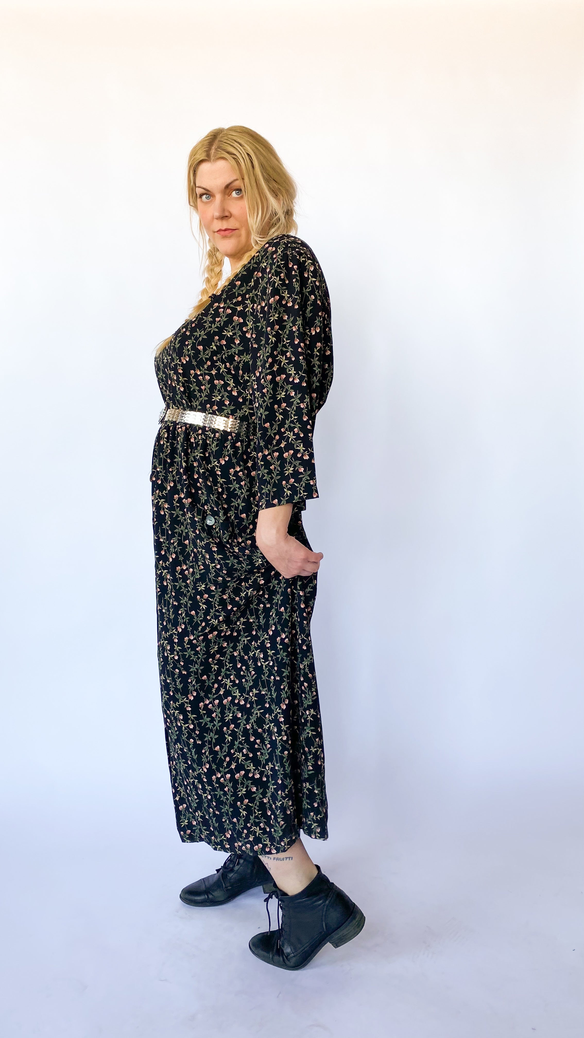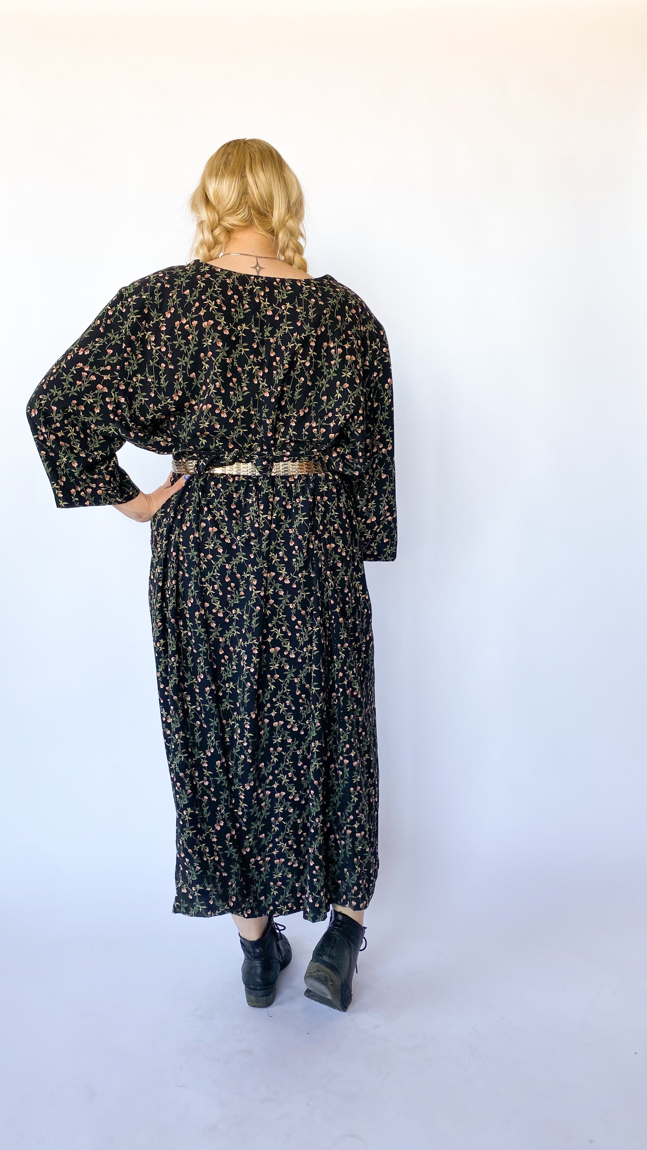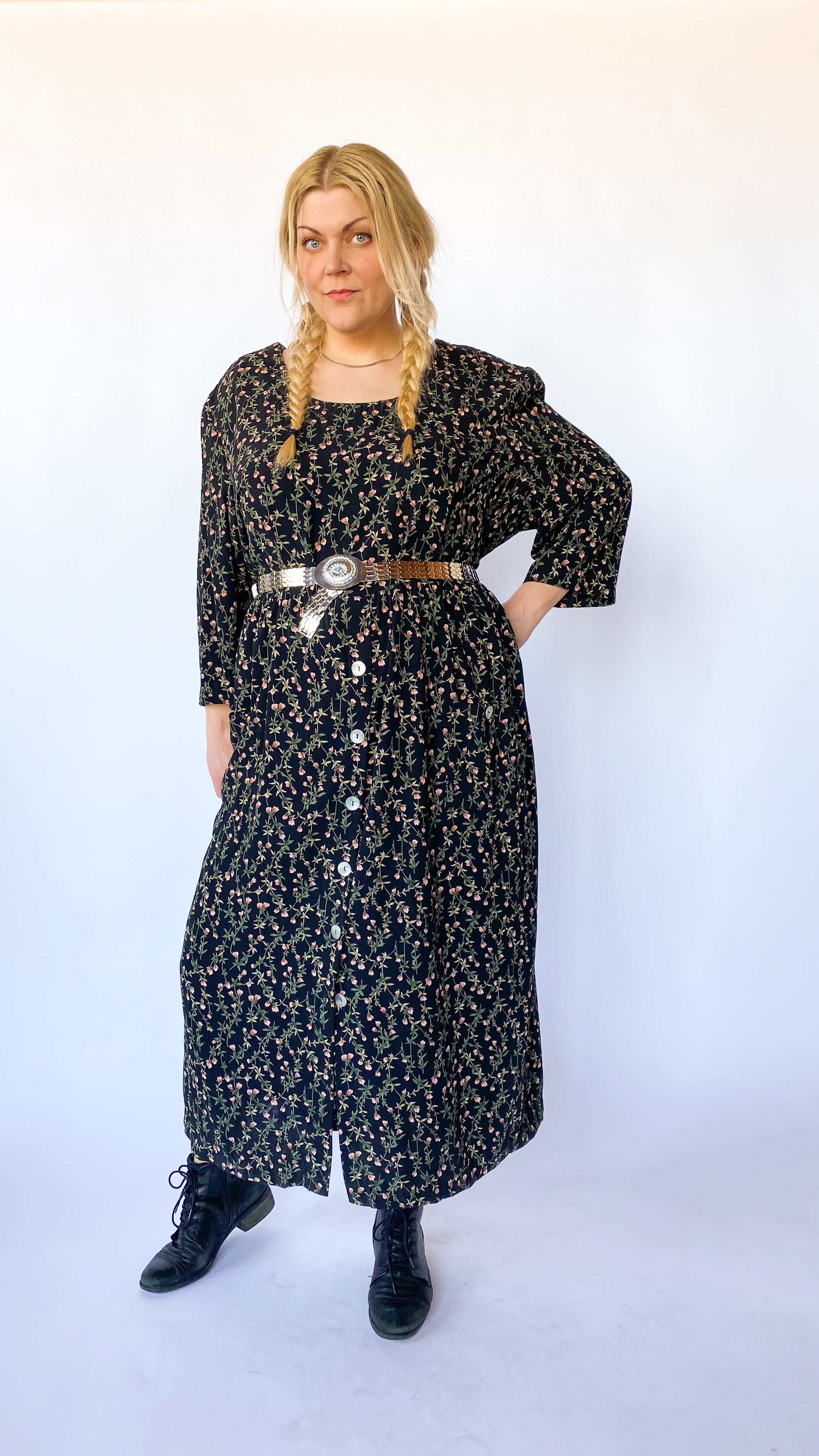 Description: Long-sleeve black dress with pink and green floral pattern. There are buttons running down front of the skirt. The buttons are pearly iridescent. The dress has ties at the waist to tighten. Dress also has shoulder pads.