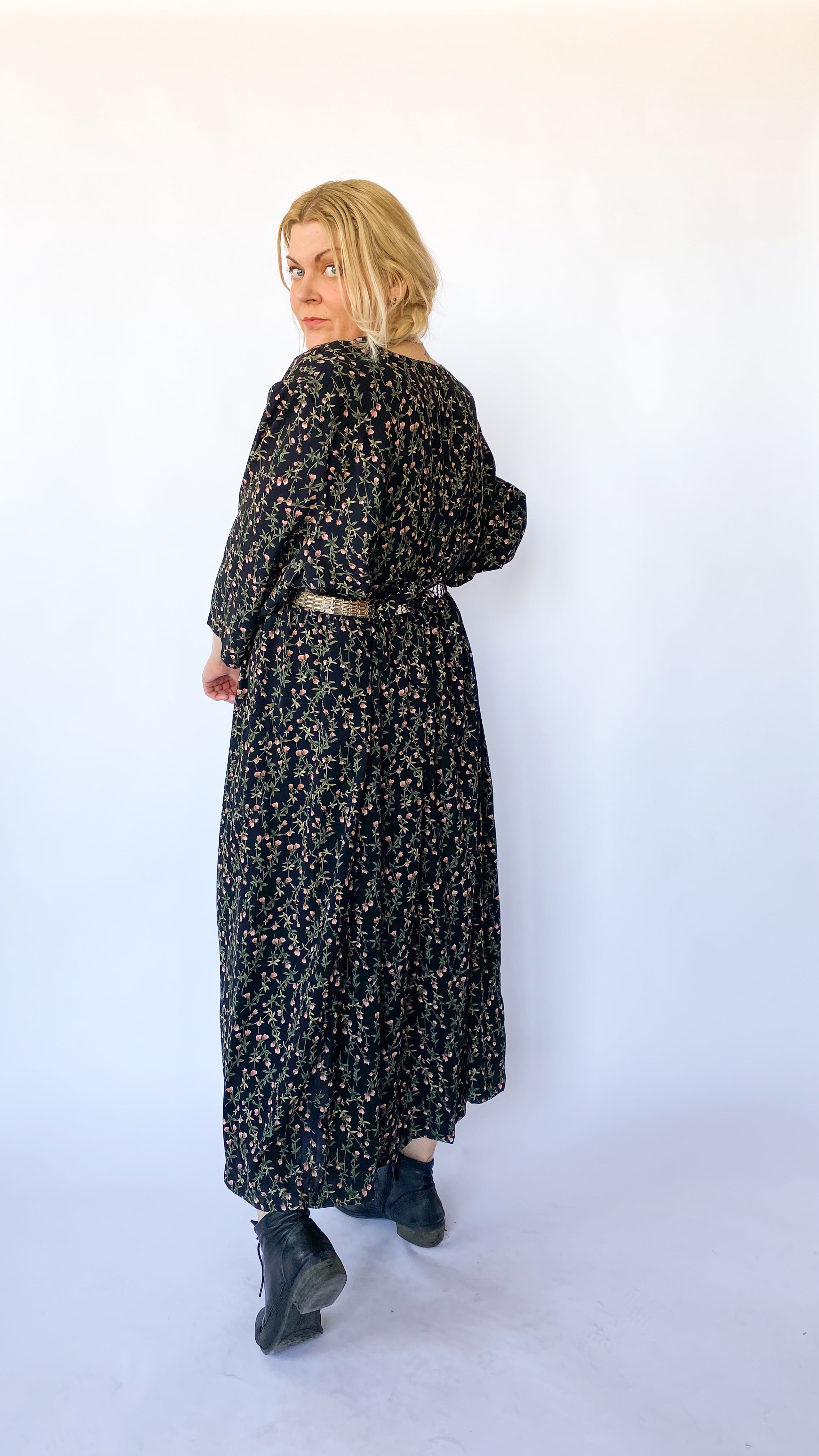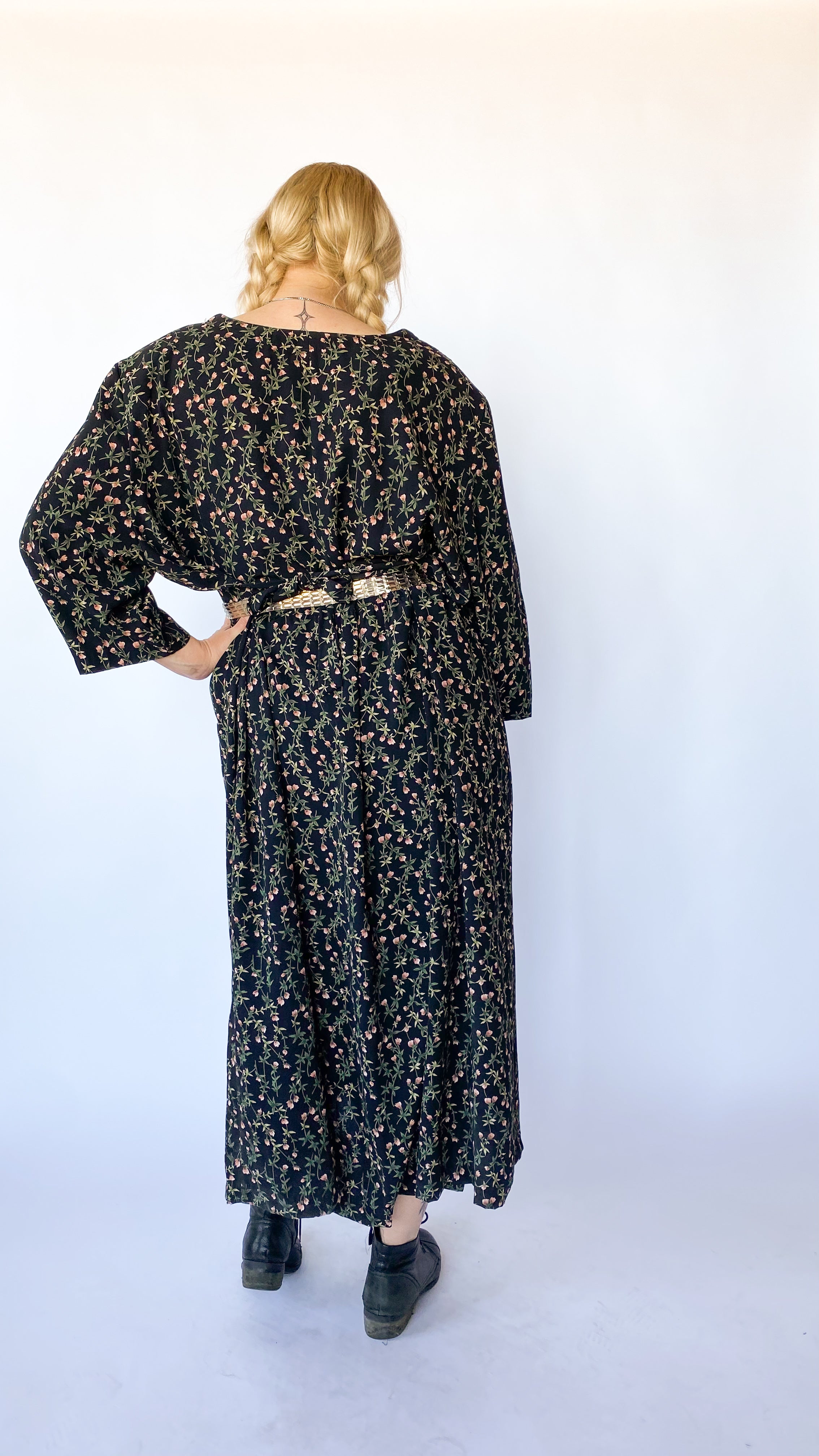 1980s Black Floral Long-Sleeve Dress, sz. 6XL