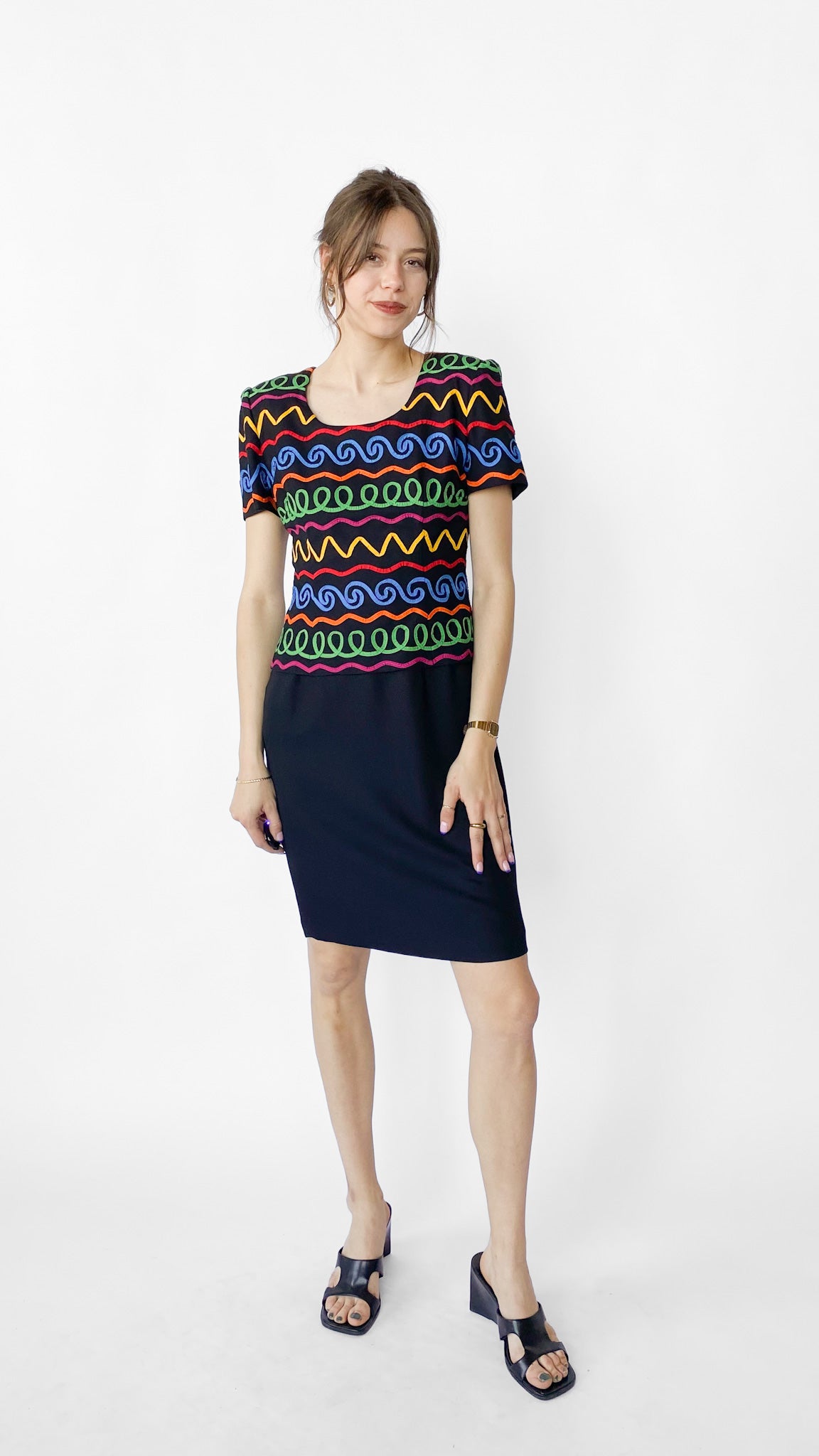1980s Black Rainbow Ric Rac Dress, sz. M
