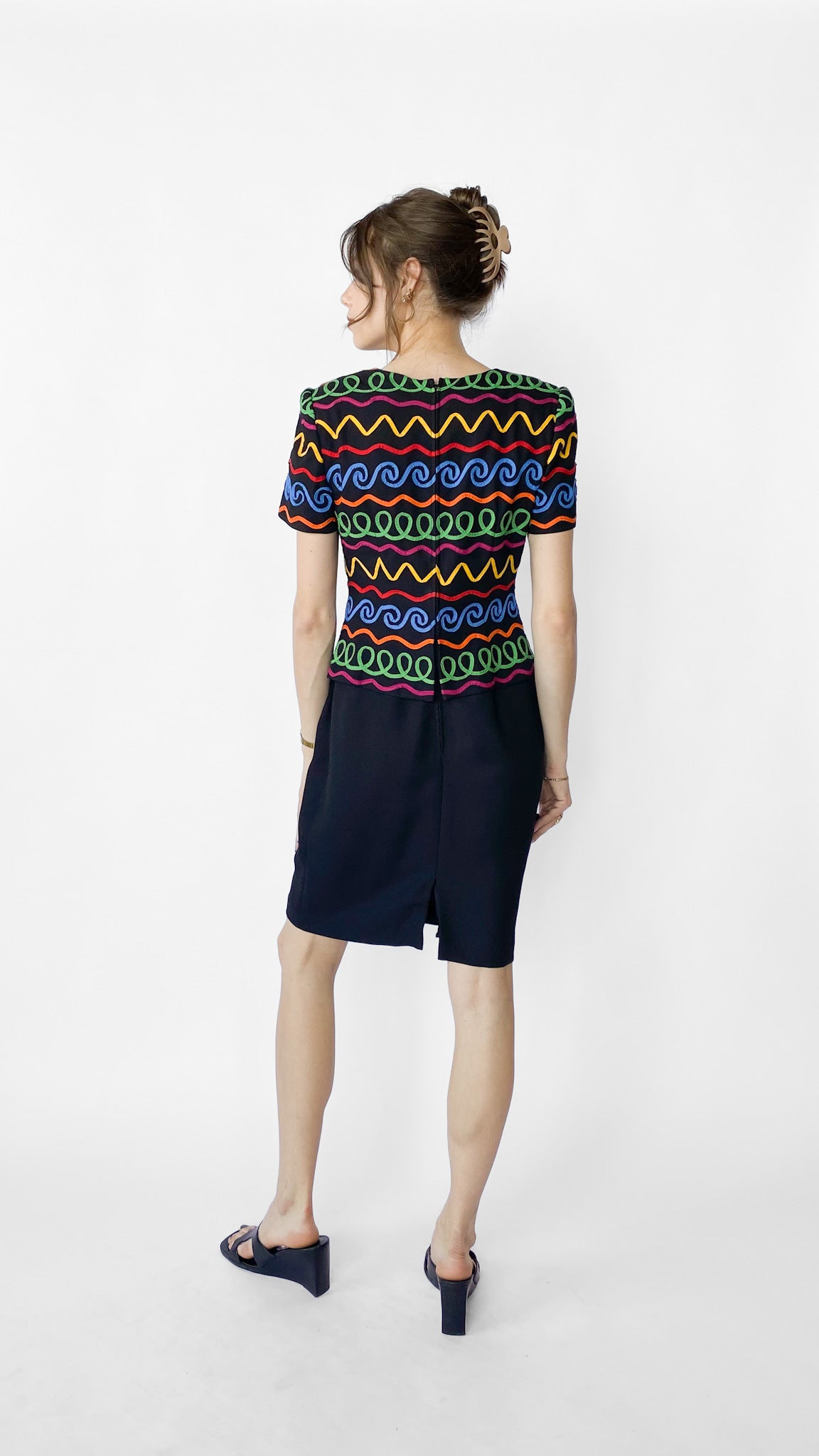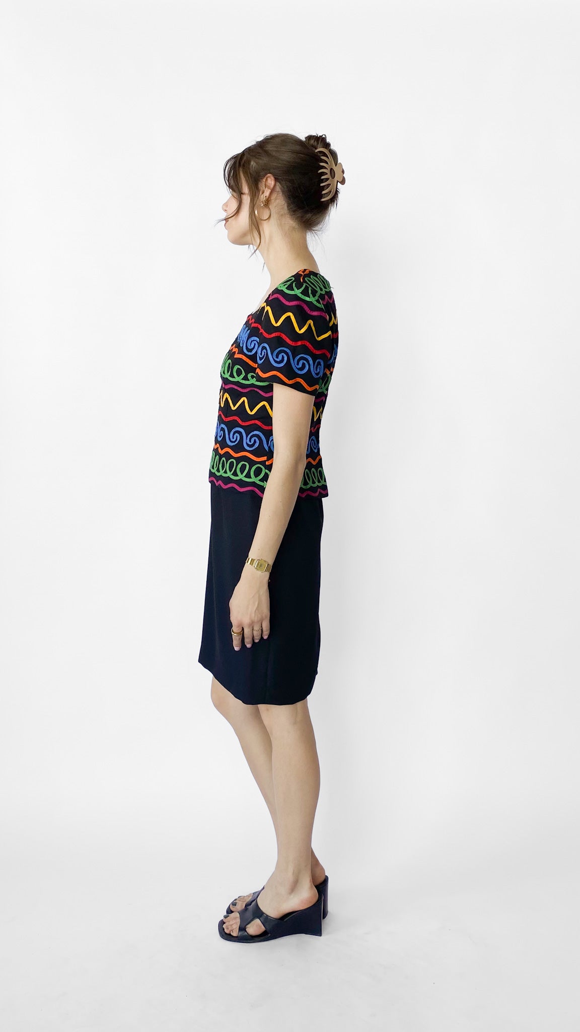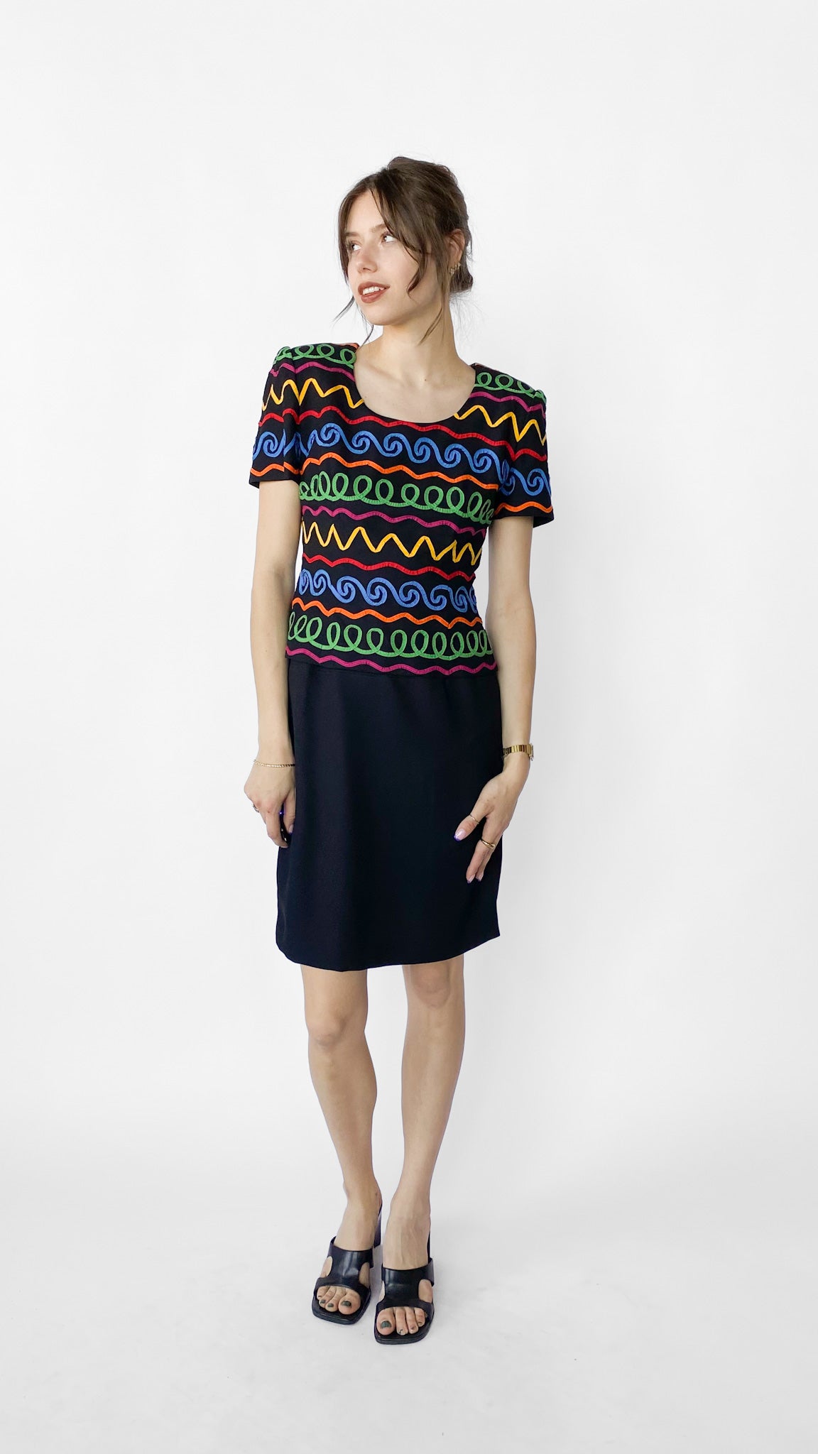 Description: Short sleeve black dress with funky rainbow pattern on top. Dress has zipper on back. Top of dress is broken off at waist so it looks like it's a shirt on top of a skirt.