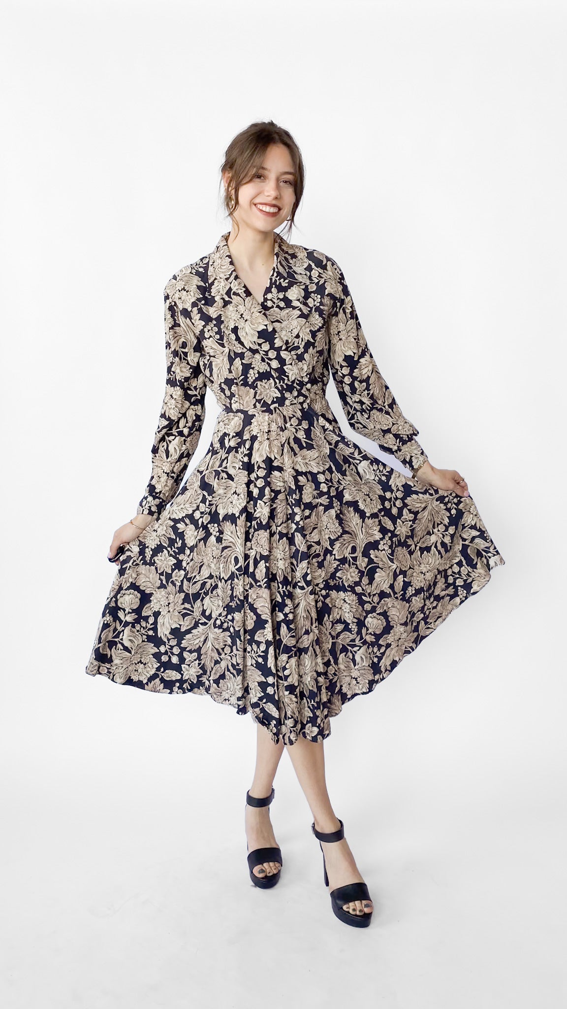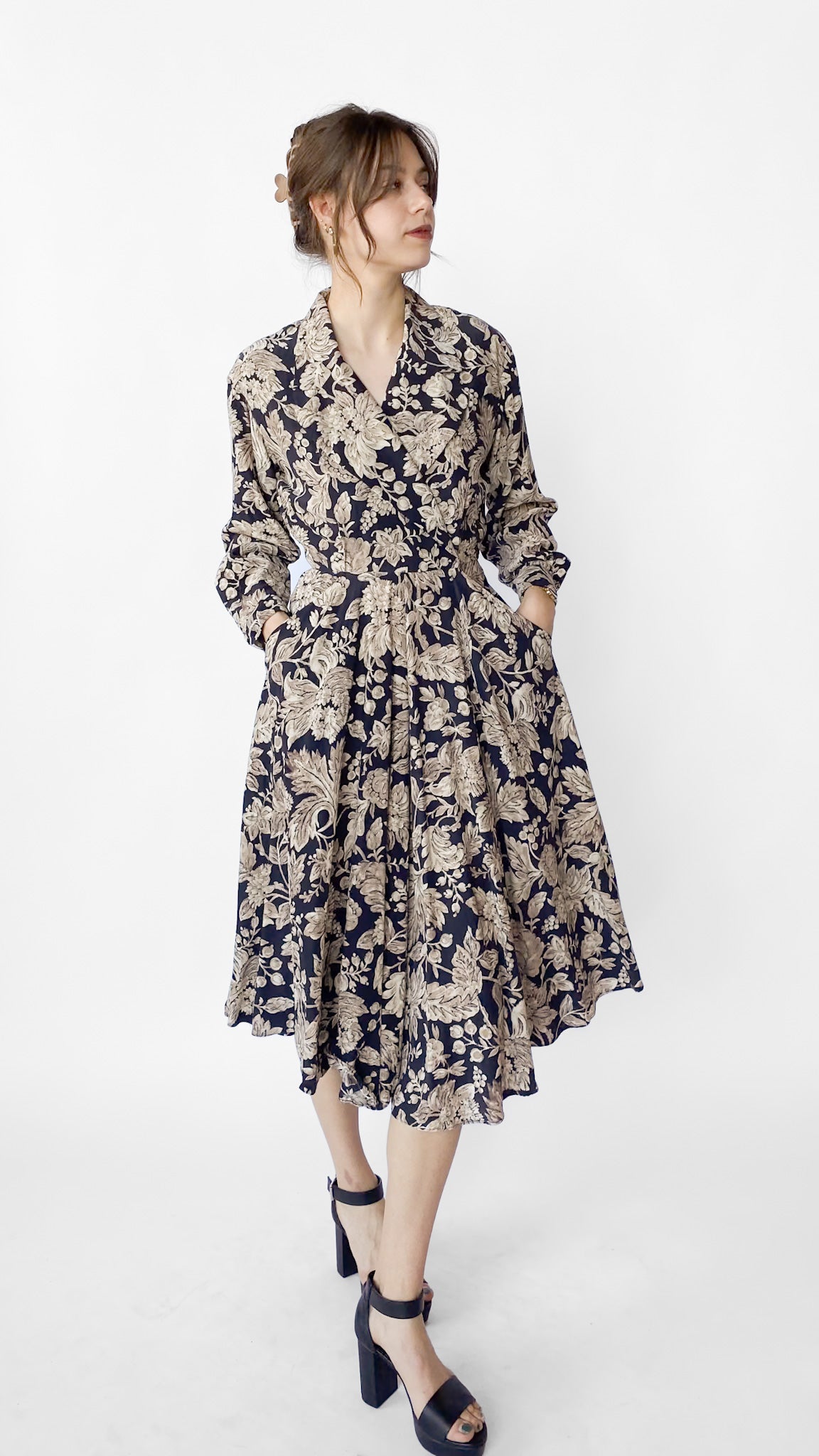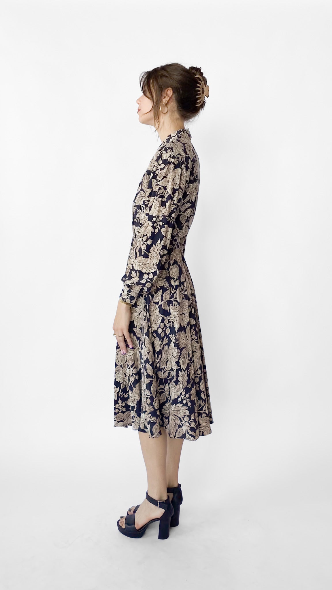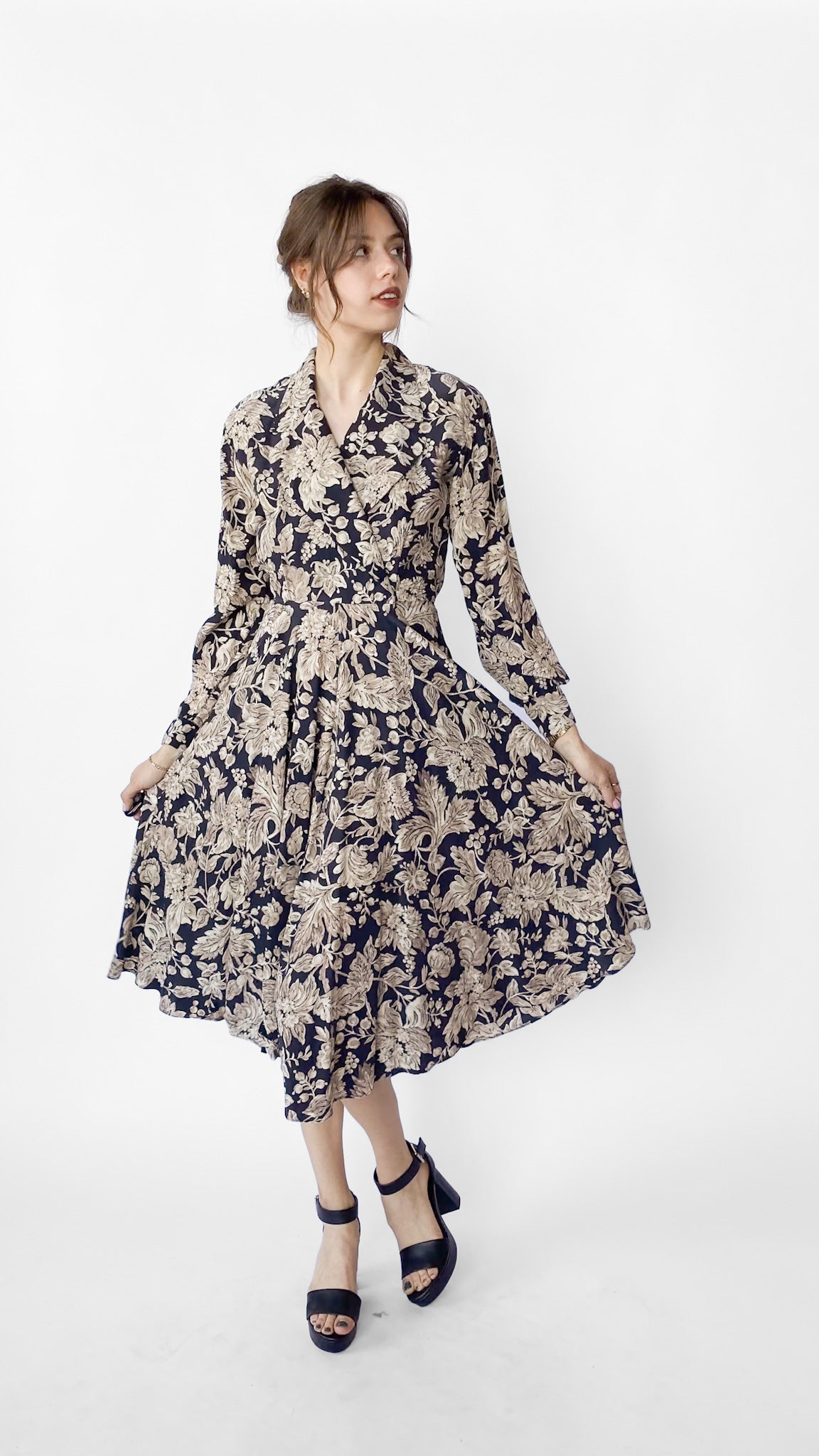 Navy blue & tan midi dress with ornate floral pattern. Has overlap waist closure & collar. Unlined, with side hip pockets.