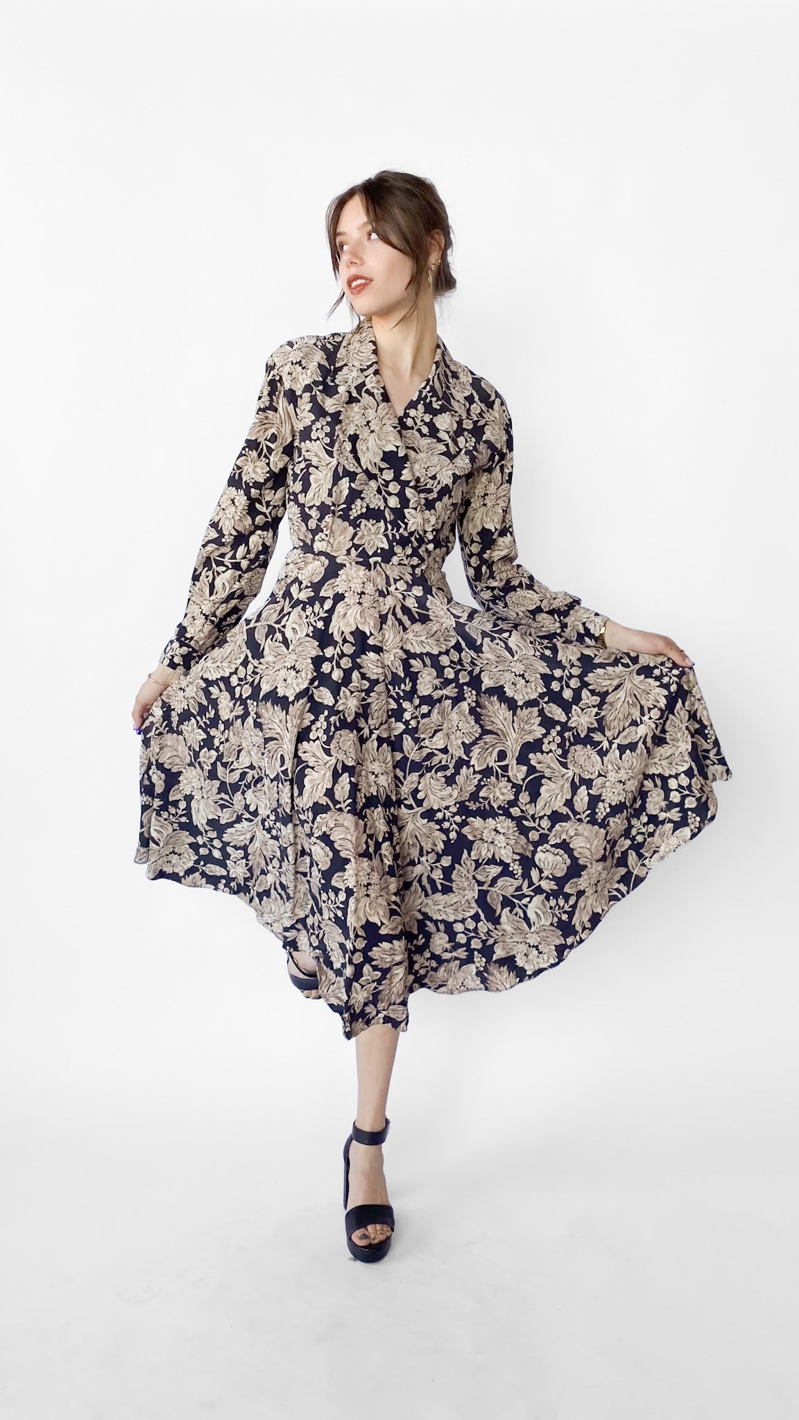 1980s Navy & Tan Floral Midi Dress, sz. S