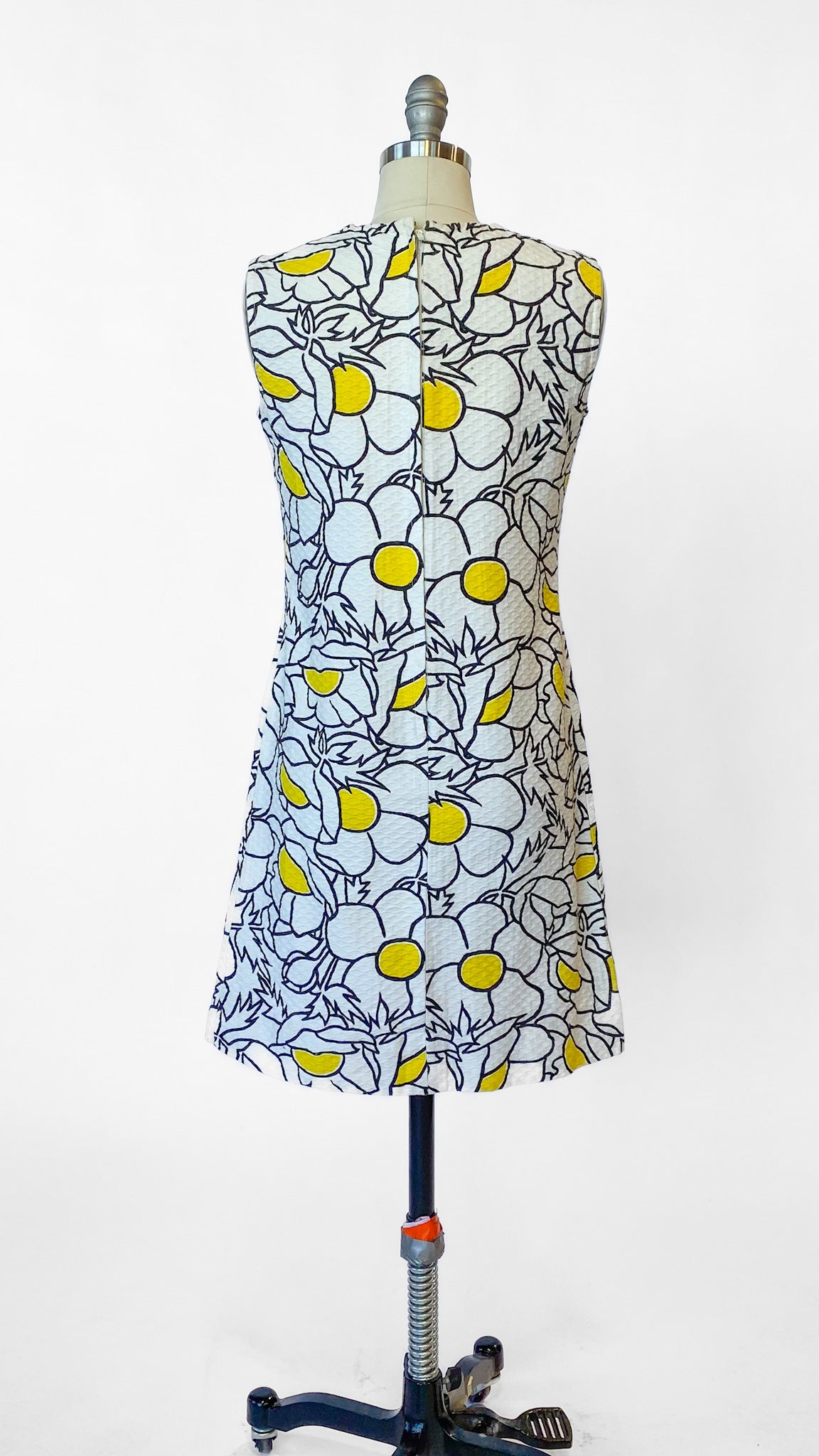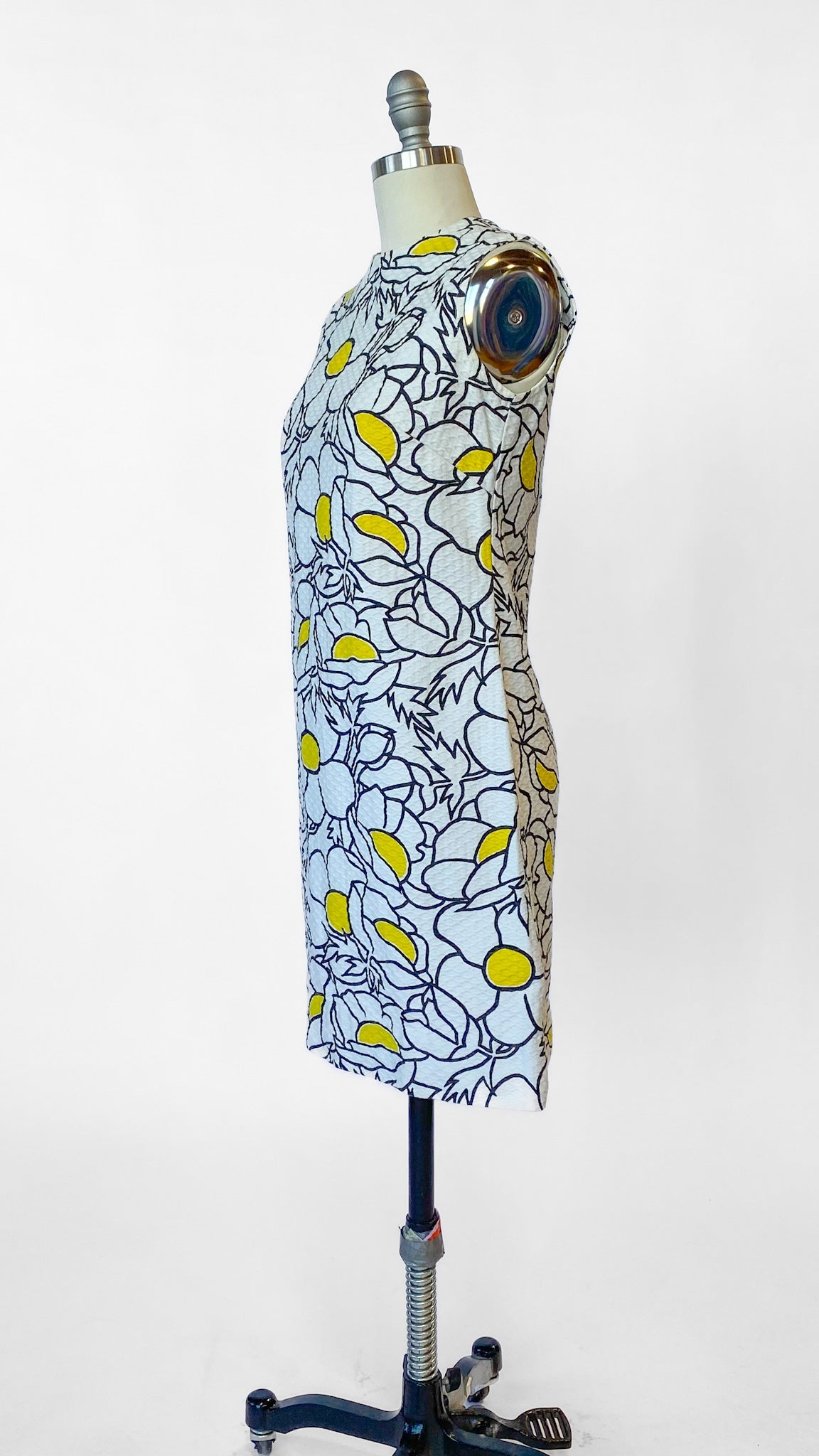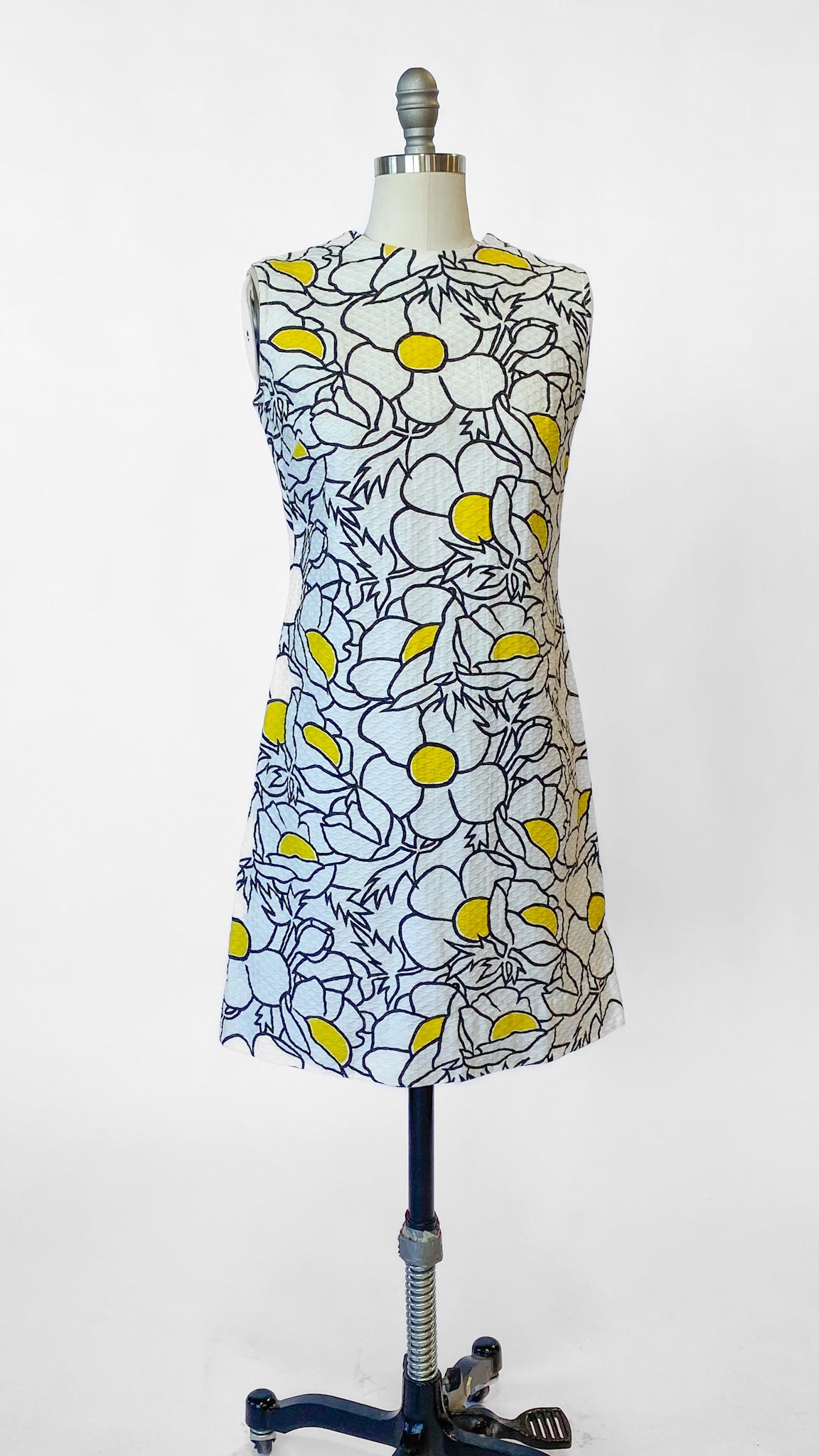 White sleeveless shift dress with illustrative black floral pattern and pops of yellow, zipper up center back.