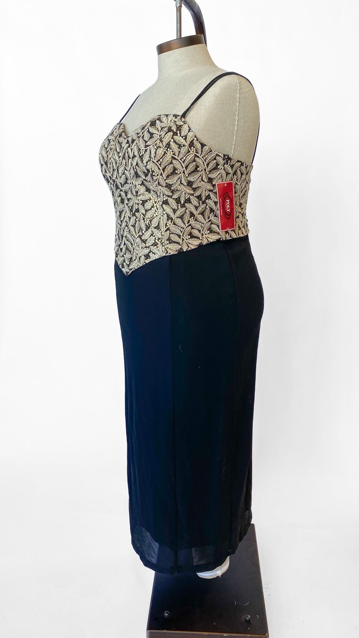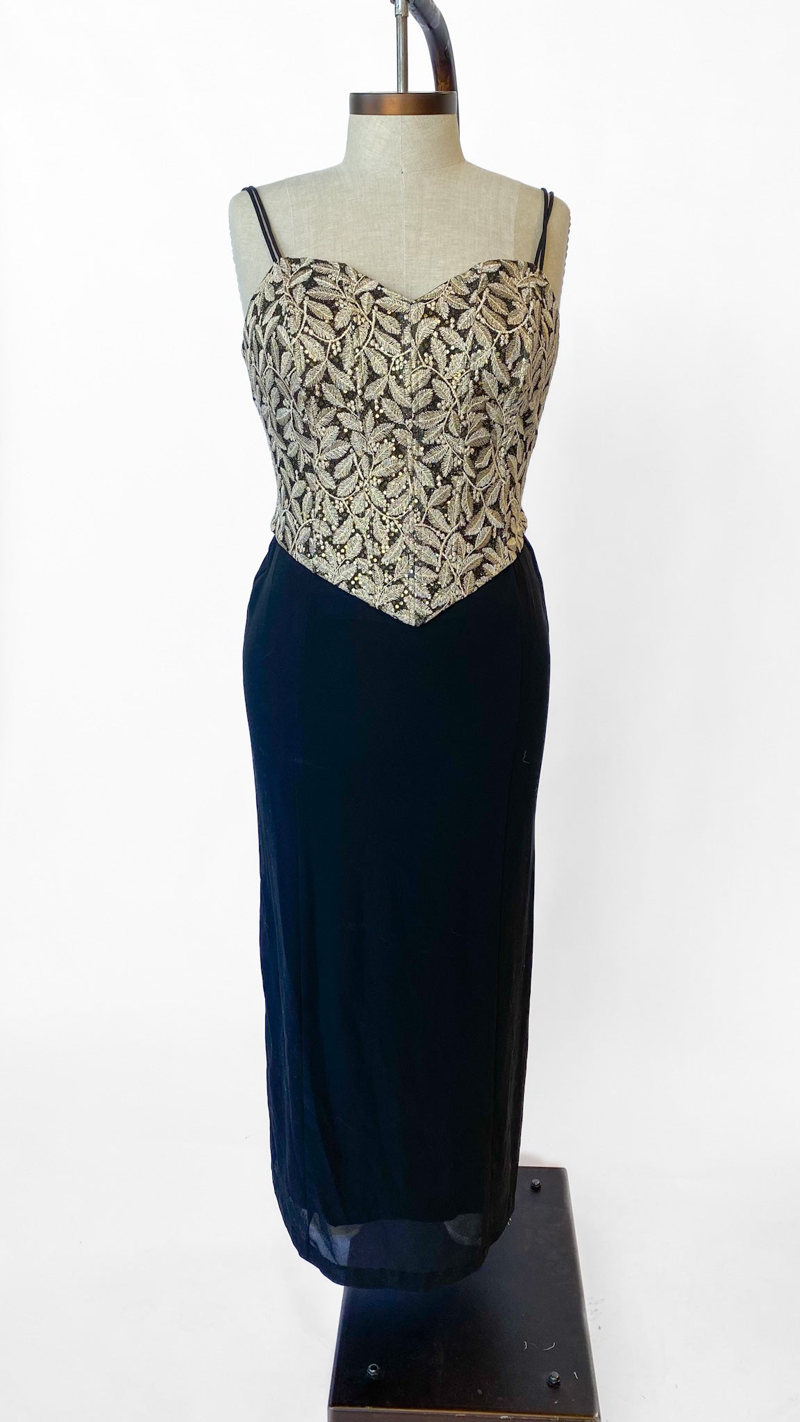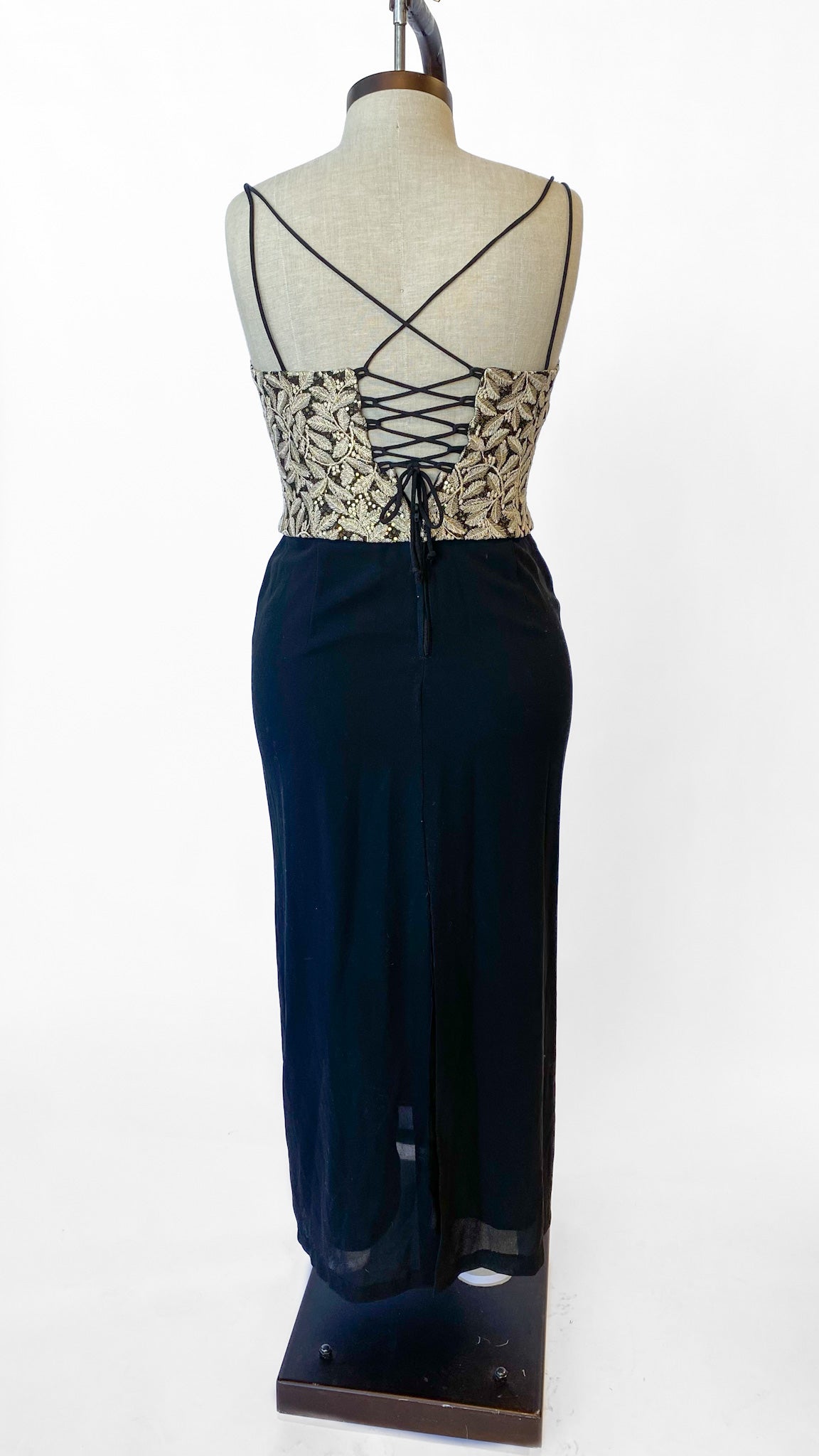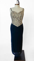 Black evening dress with gold embroidered corset bodice with gold sequin underlay. Spaghetti straps that extend into a corset back with a zipper in the center back of the skirt. Sheath style skirt, full length.