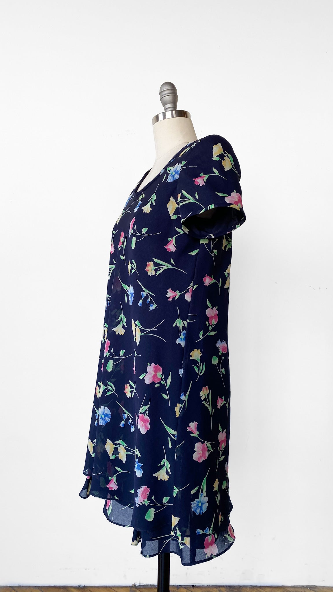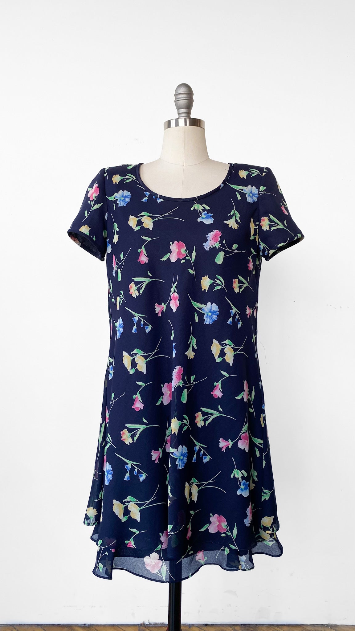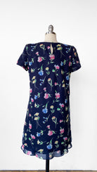 Navy blue short sleeve shift dress with floral print and keyhole back. Shoulder pads.