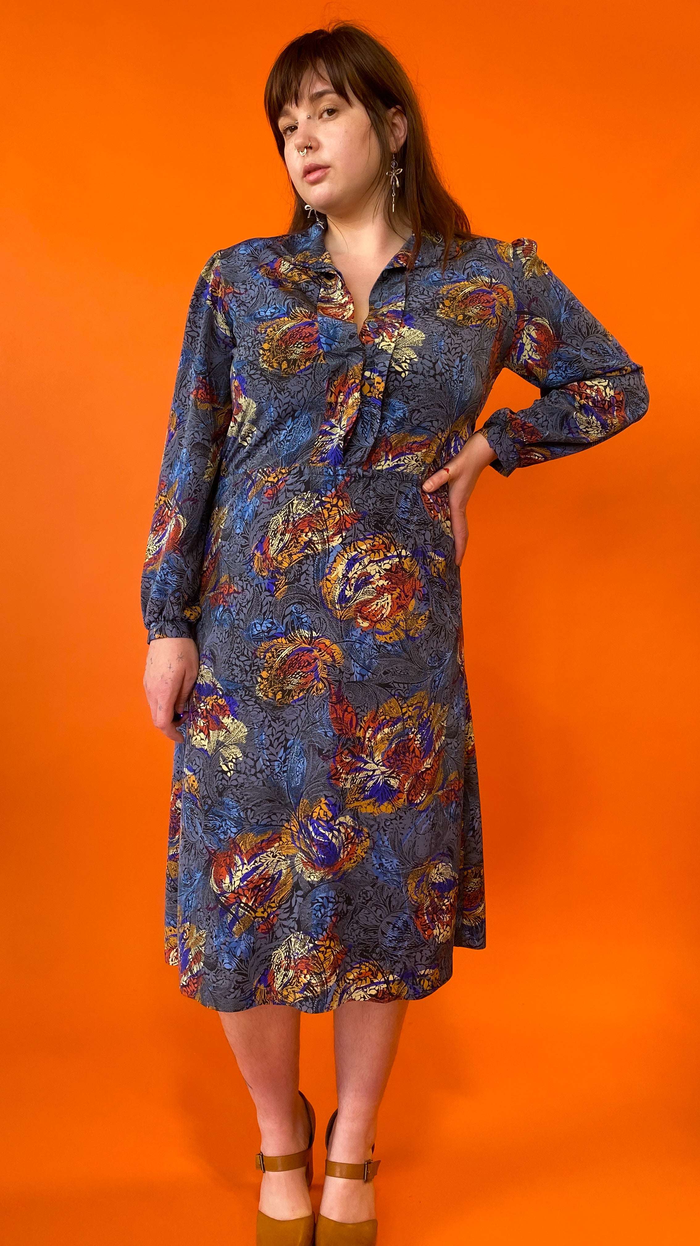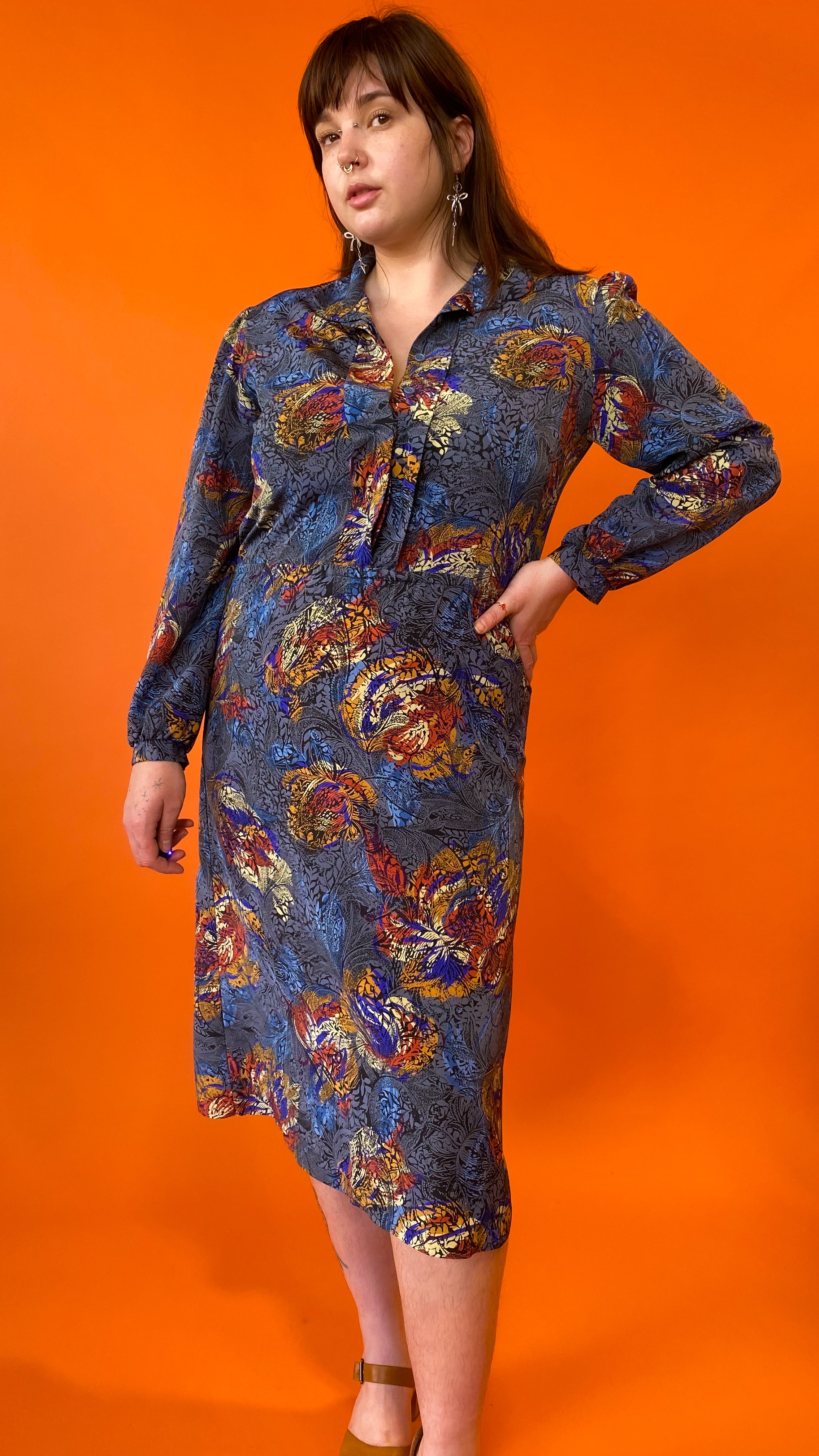Gray blue collared long sleeve dress with abstract colors of tan, orange, red, and purple and a floral print that looks similar to stamps. Buttons down the center bust and has elastic at the waist that no longer stretches.