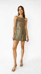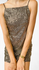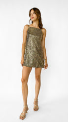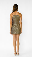 Spaghetti strap gold sequin mini dress with square neckline and black lining. No closures.