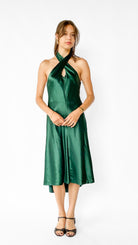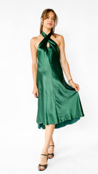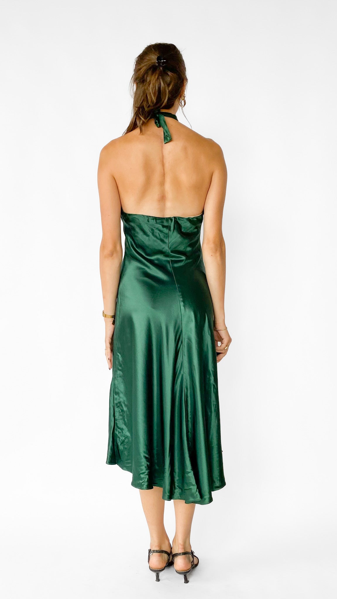 Emerald green fit and flare bias cut cocktail dress with halter top, high-low hem, and satin finish.