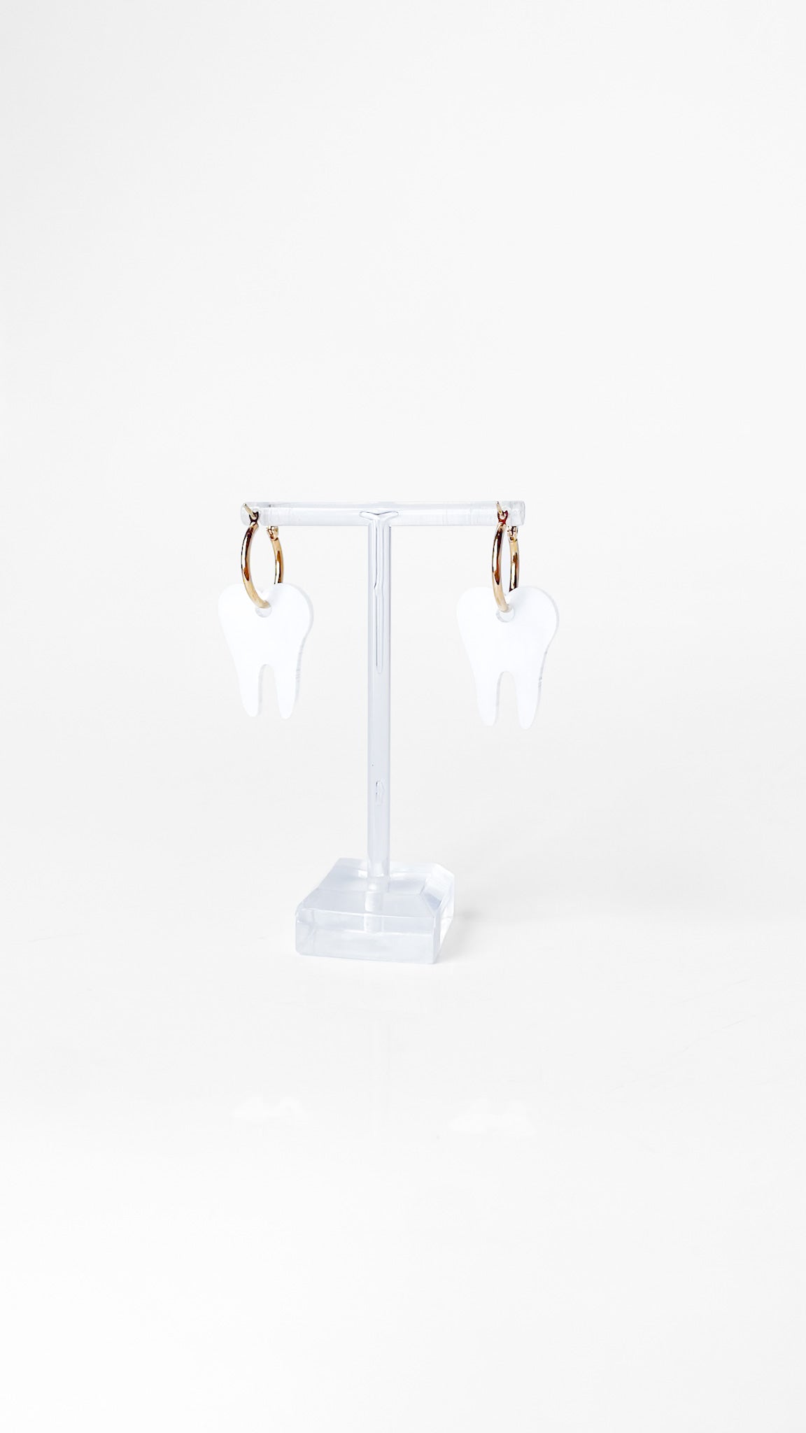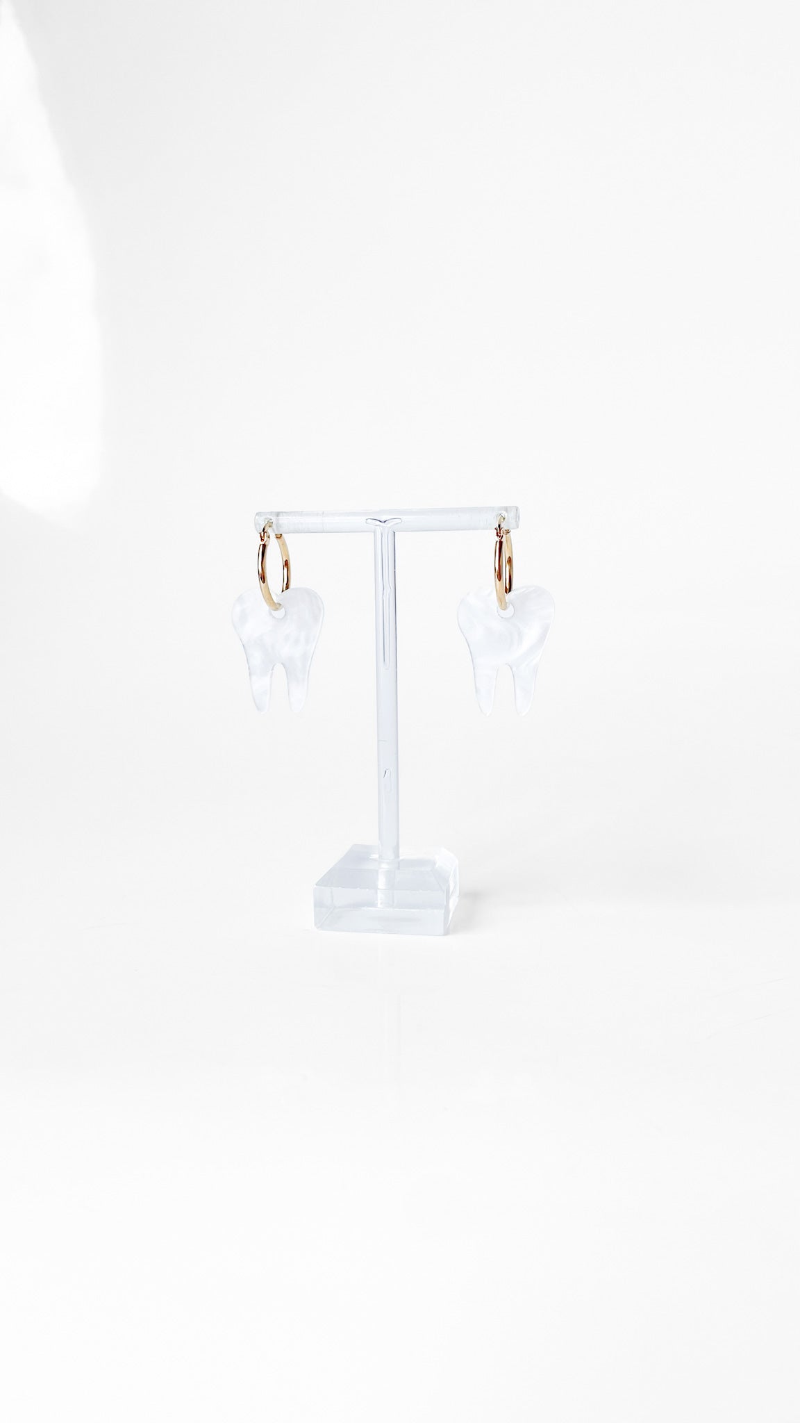Gold plated hoops with a swirly white acrylic in a tooth shape.