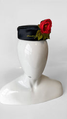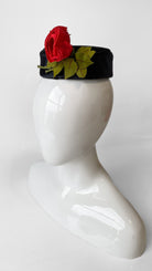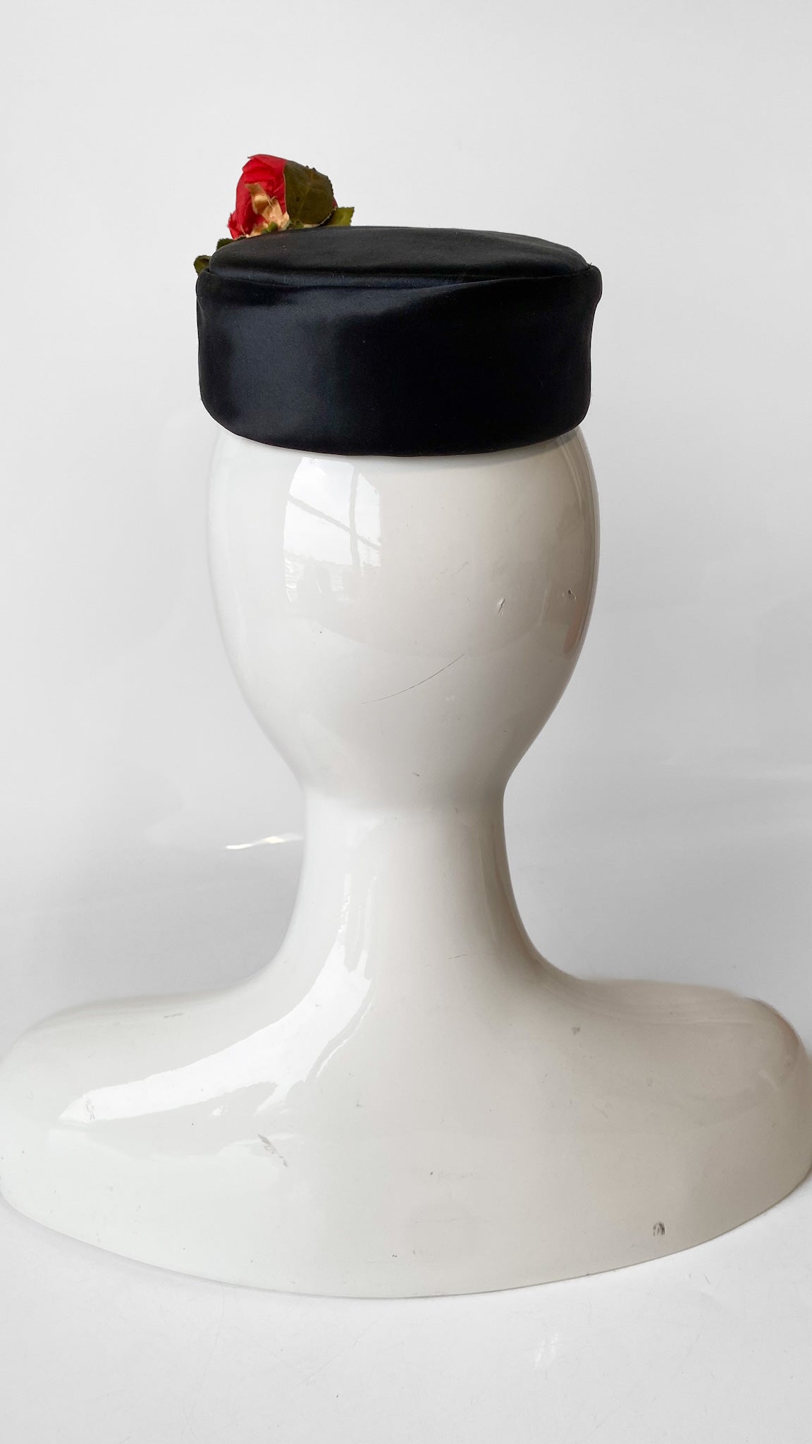 Small black pillbox hat with decorative faux red rose attached. Interior has two loosely attached hair combs.