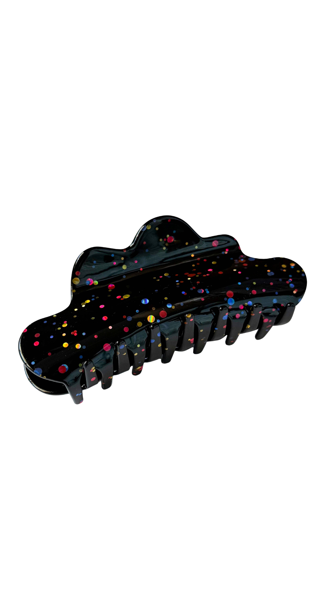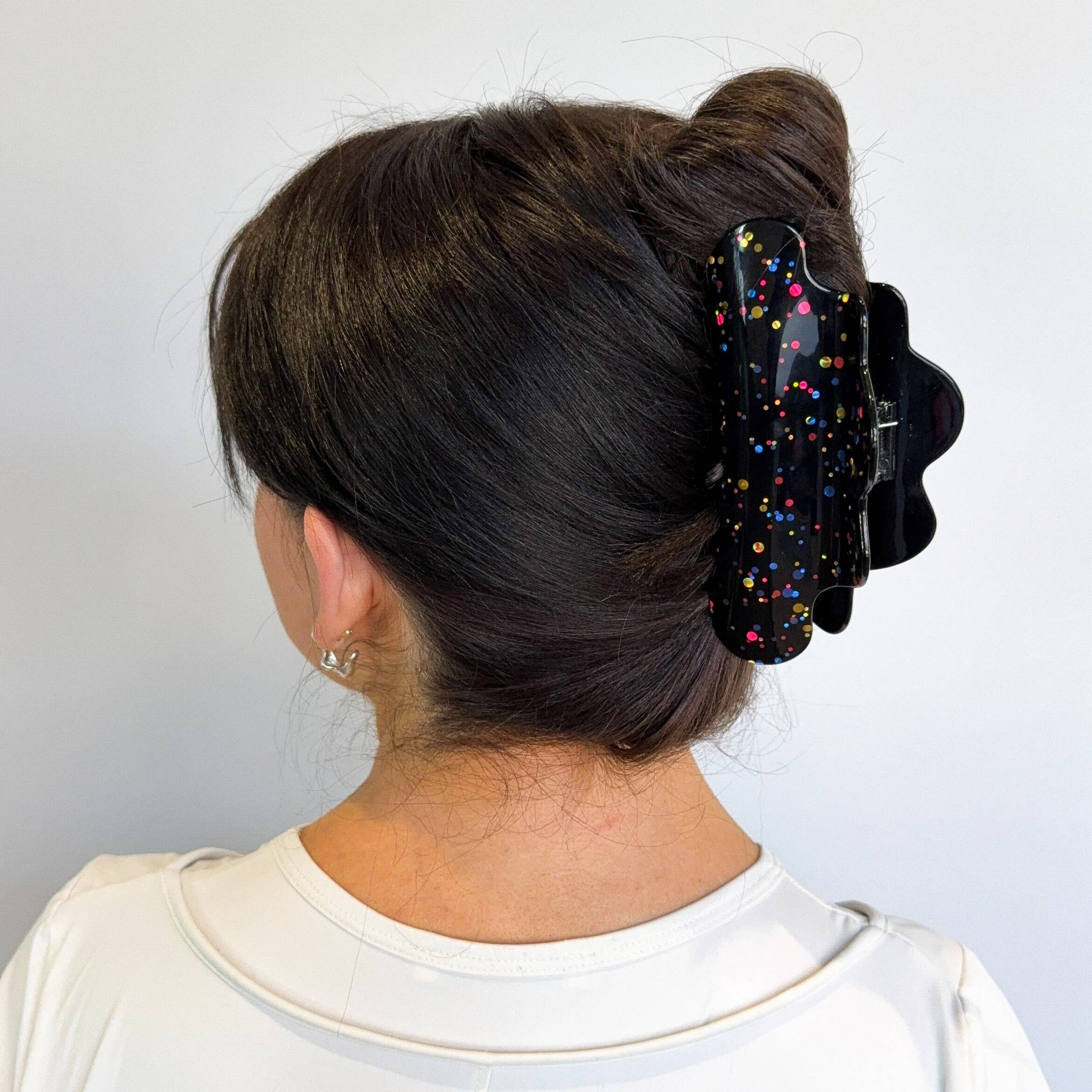 This large hair claw works like a dream on all hair types and textures. Perfect for medium to longer hair lengths. Made from high quality acetate; a durable, plant based bio-plastic. Metal hardware is lead and nickel-free. Slight variations will appear with pattern, color and form due to the handmade nature of the product. Measures approx 5"L x 2.25"H x 1.75"D Color: black, multicolor confetti, blue, gold, pink, silver tone hardware