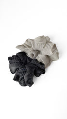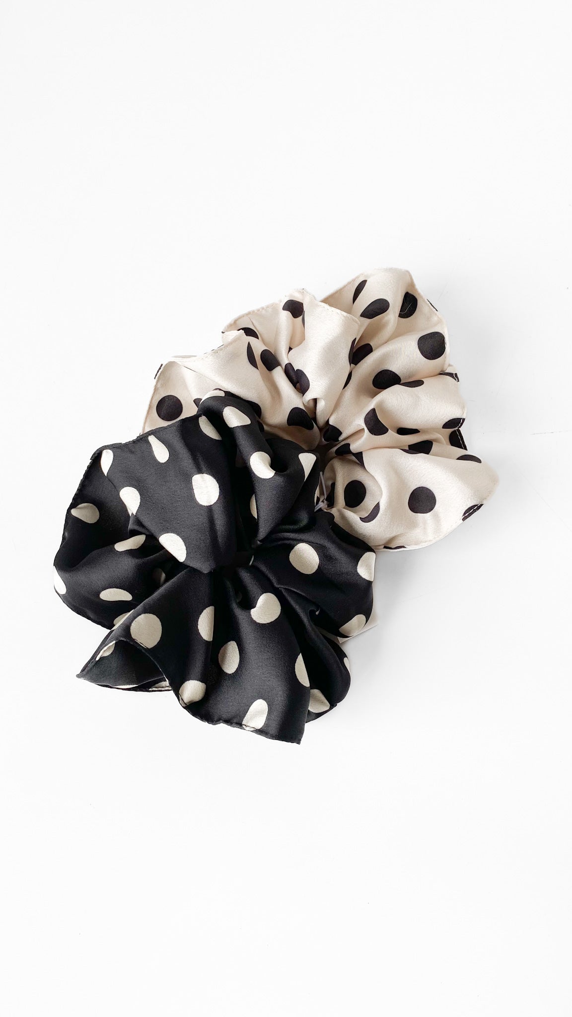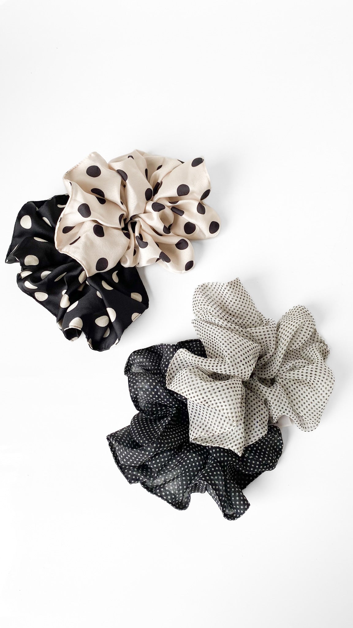 Featuring black and white polka dots, this patterned scrunchie is perfect for fall/winter. Comes in two styles: large polka-dots and small polka-dots. Set of 2.