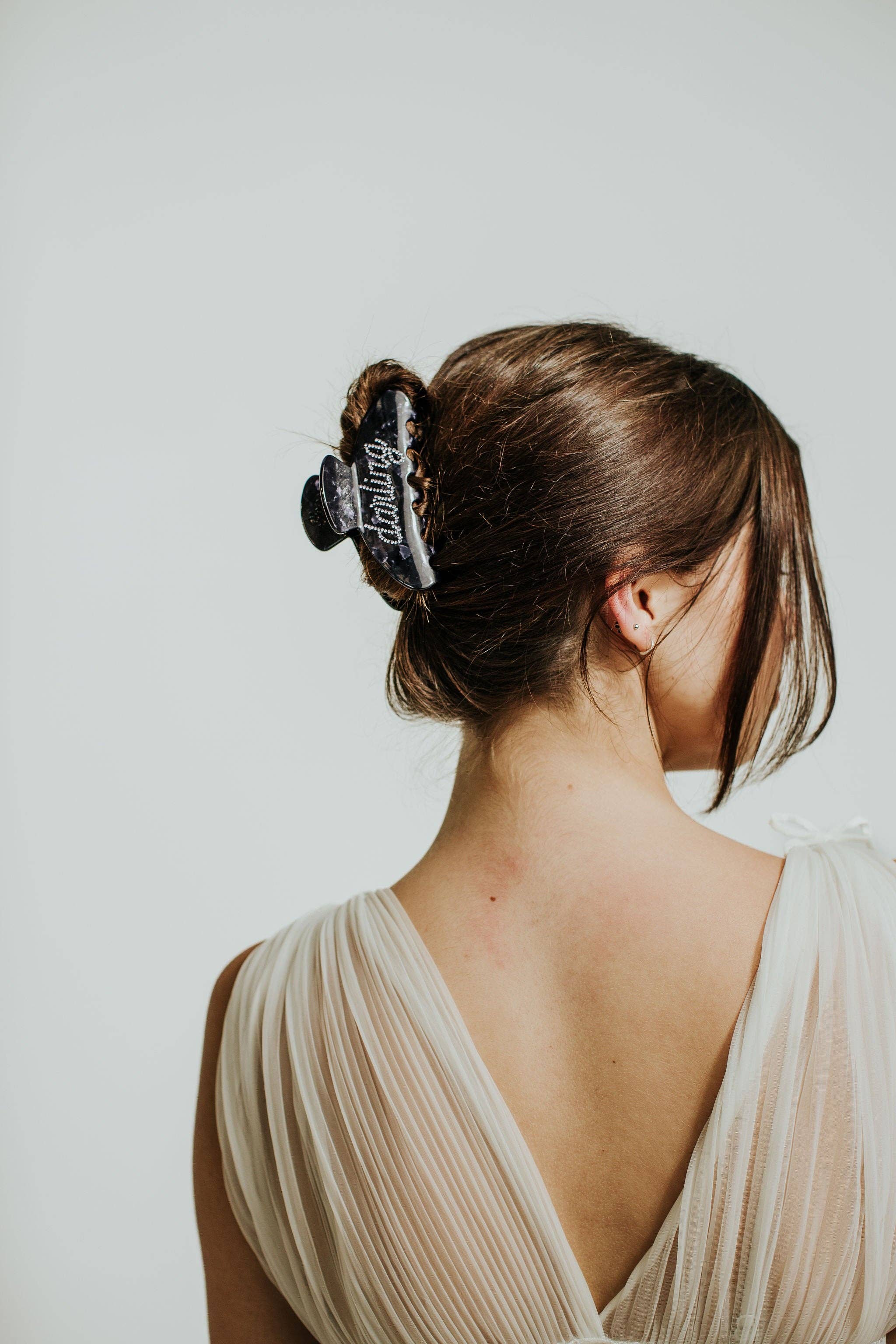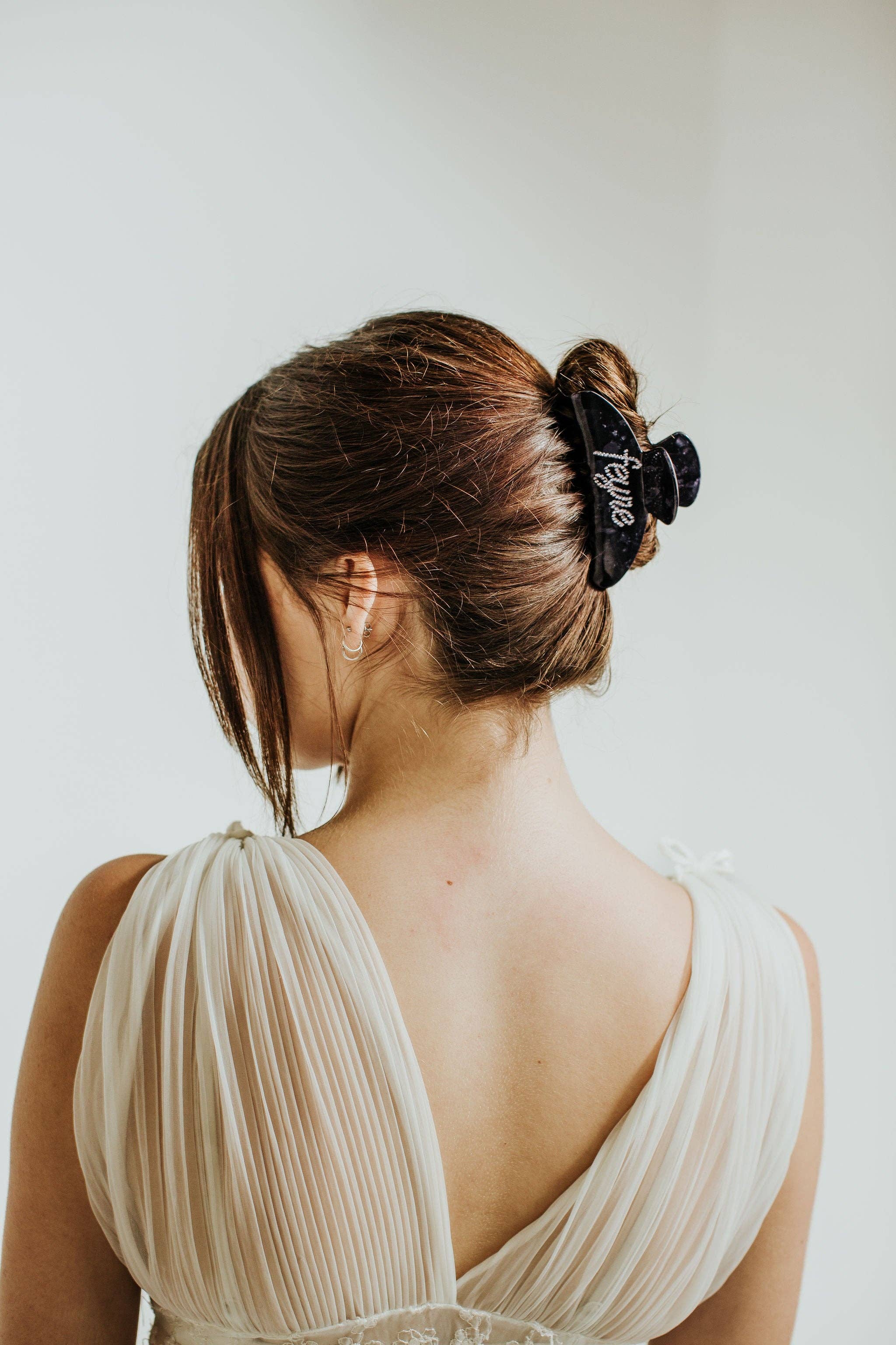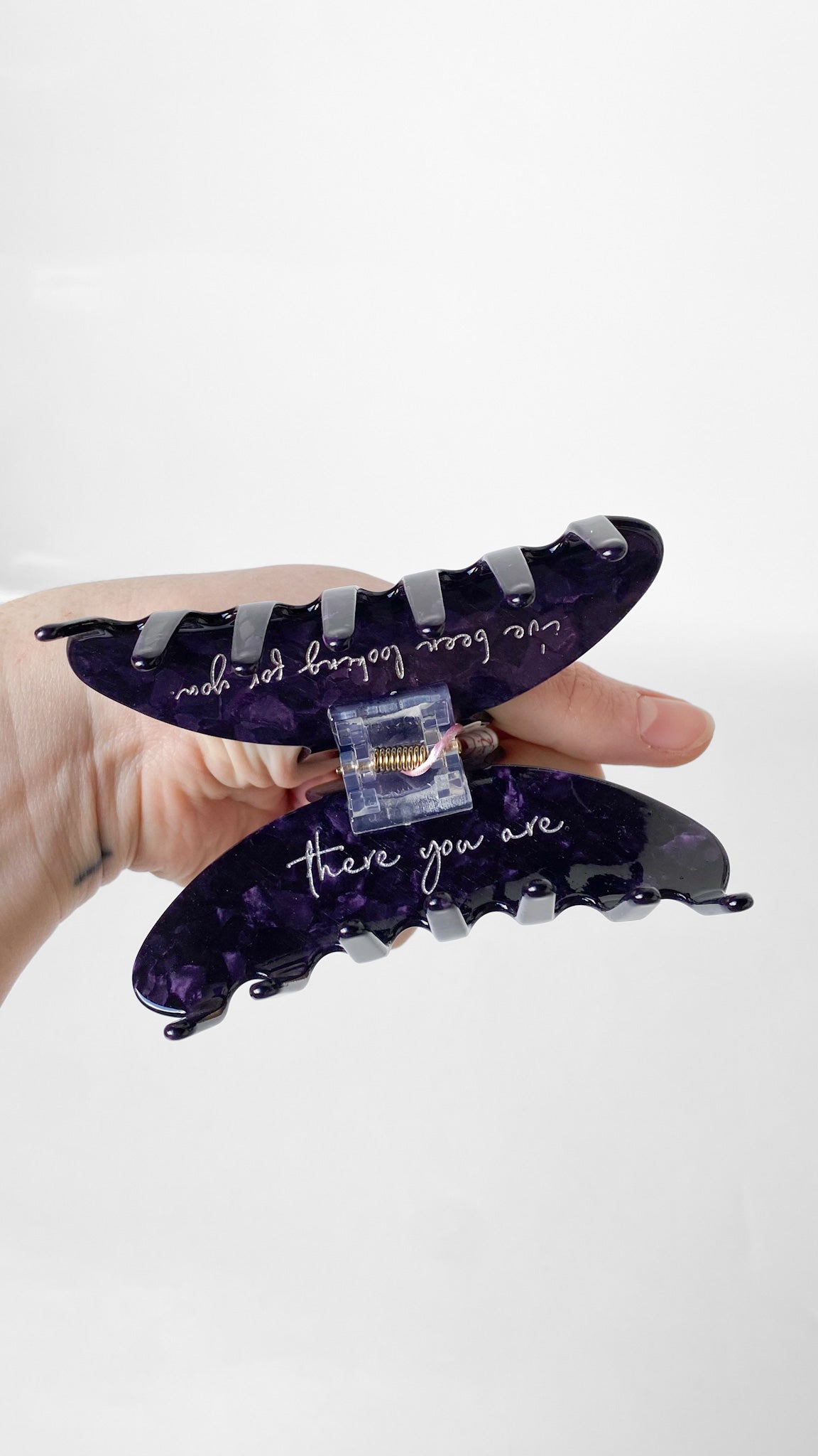Hello, Feyre Darling. For fans of romantasy dream couple Feyre and Rhysand, this classic claw clip features gem detailing on each side that reads “feyre” and “darling”. Backed on swirled dark purple acetate with light lavender gems and sure to make other readers swoon.