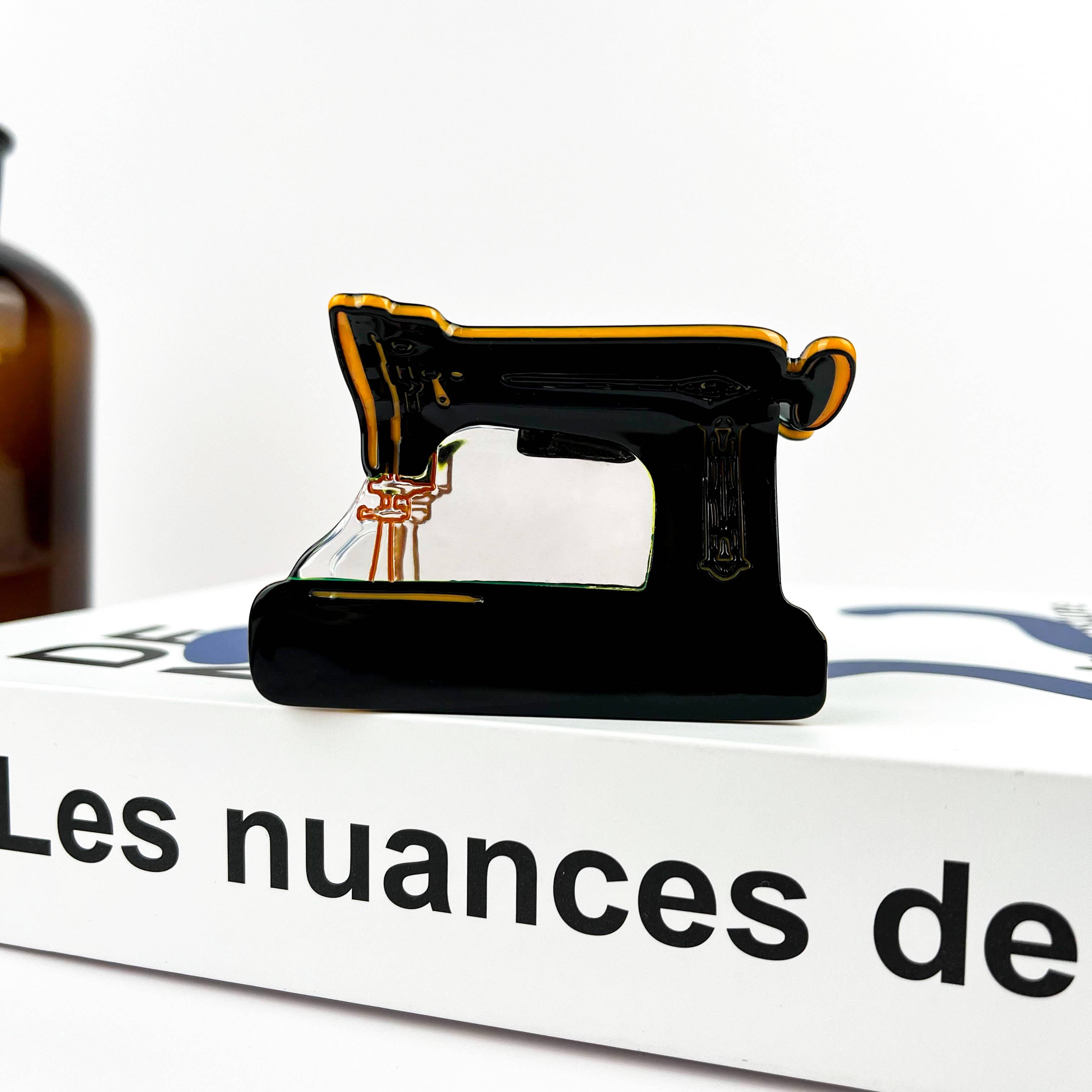Designed in the charming shape of a sewing machine, this unique accessory is crafted from high-quality acetate, offering a durable and stylish finish. Perfect for sewing enthusiasts or anyone who loves quirky fashion, this clip adds a whimsical touch to your hairstyle. Lightweight and secure, it’s suitable for daily wear or as a thoughtful gift for a creative soul.