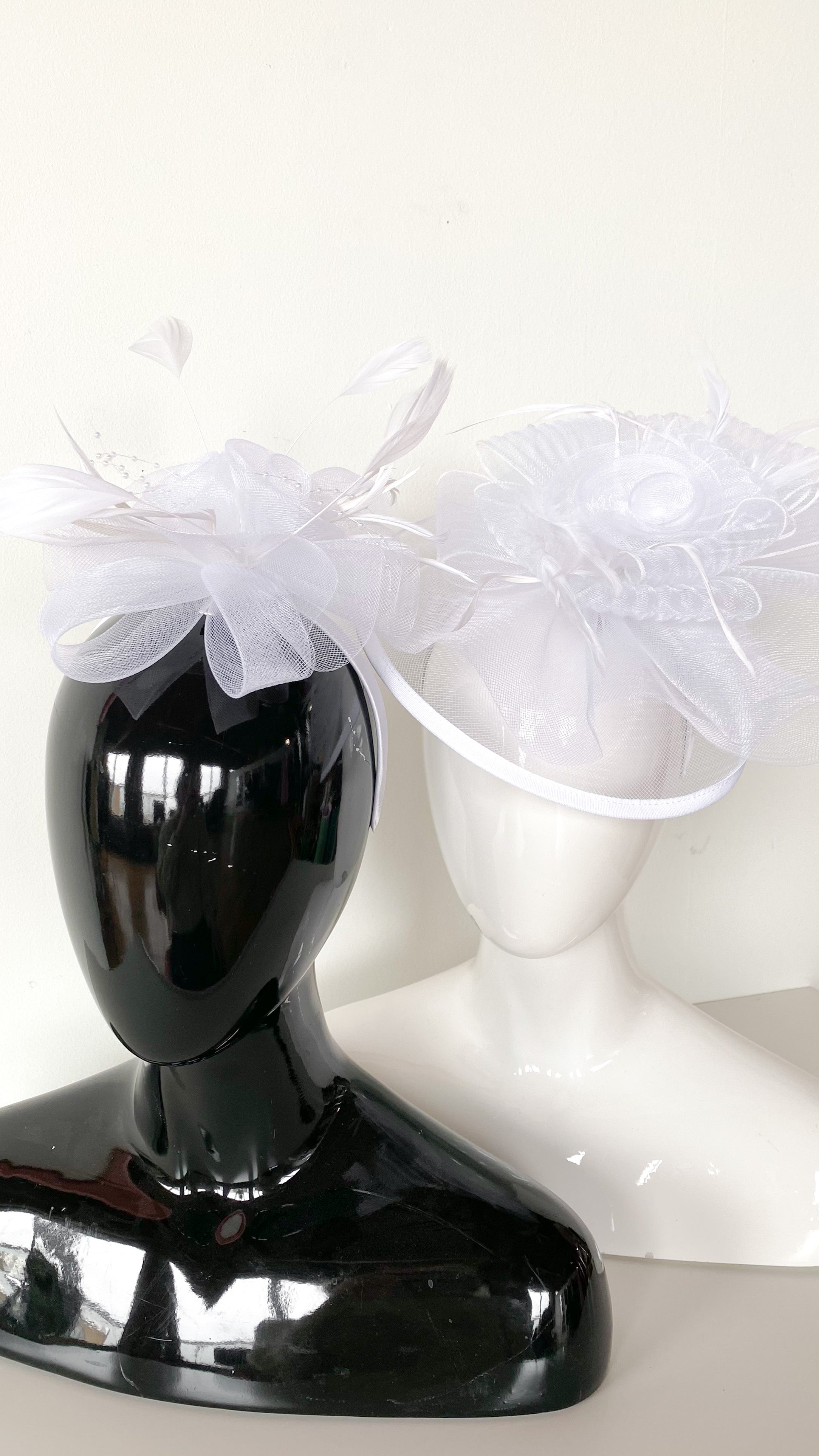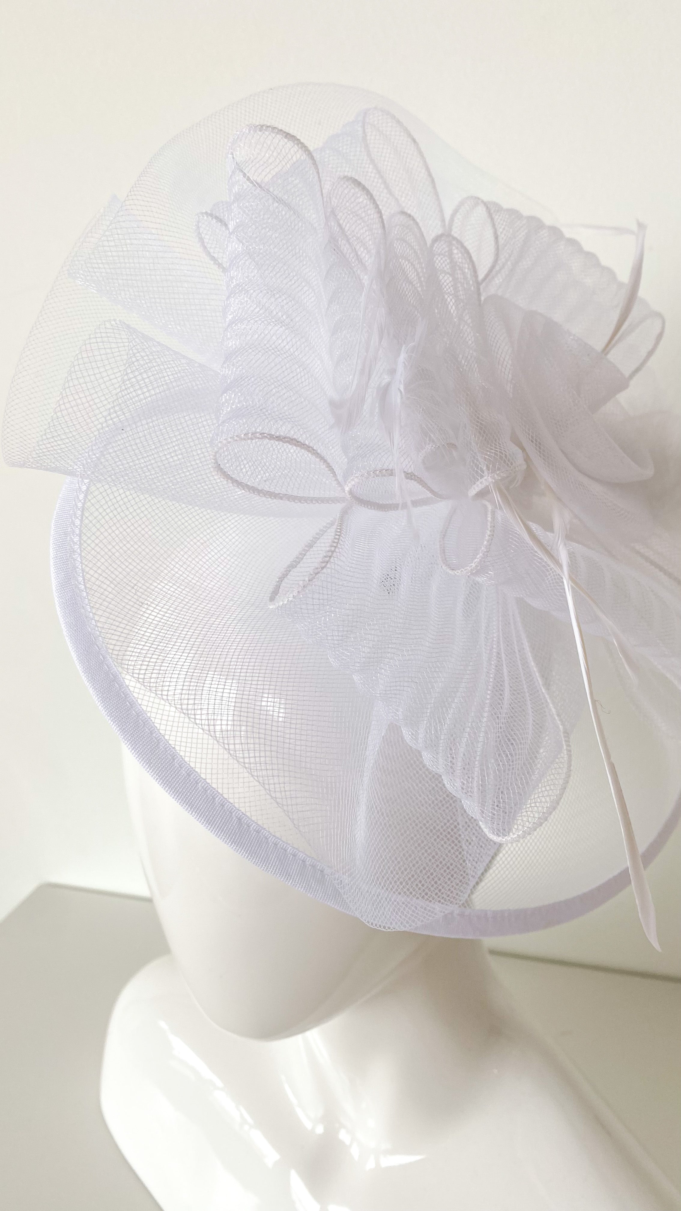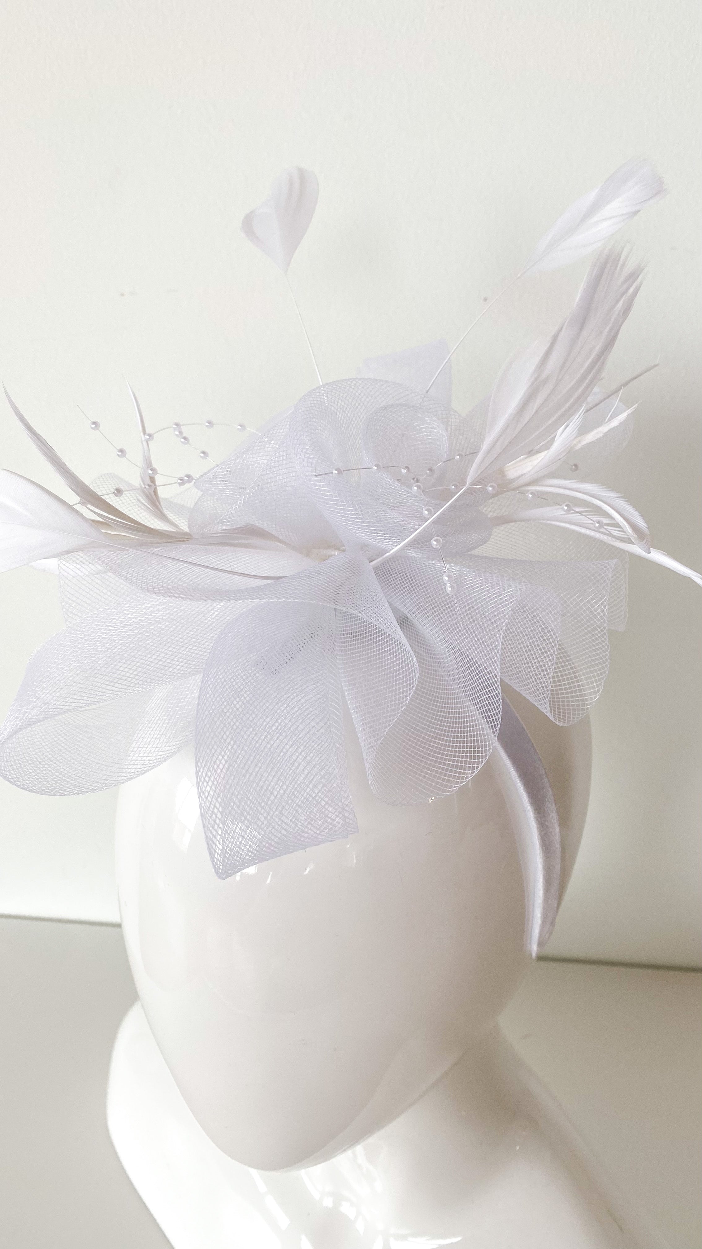 Headband with removable white flower made of netting. Flower and veil can be clipped to hair without headband. Available in a large or small size.