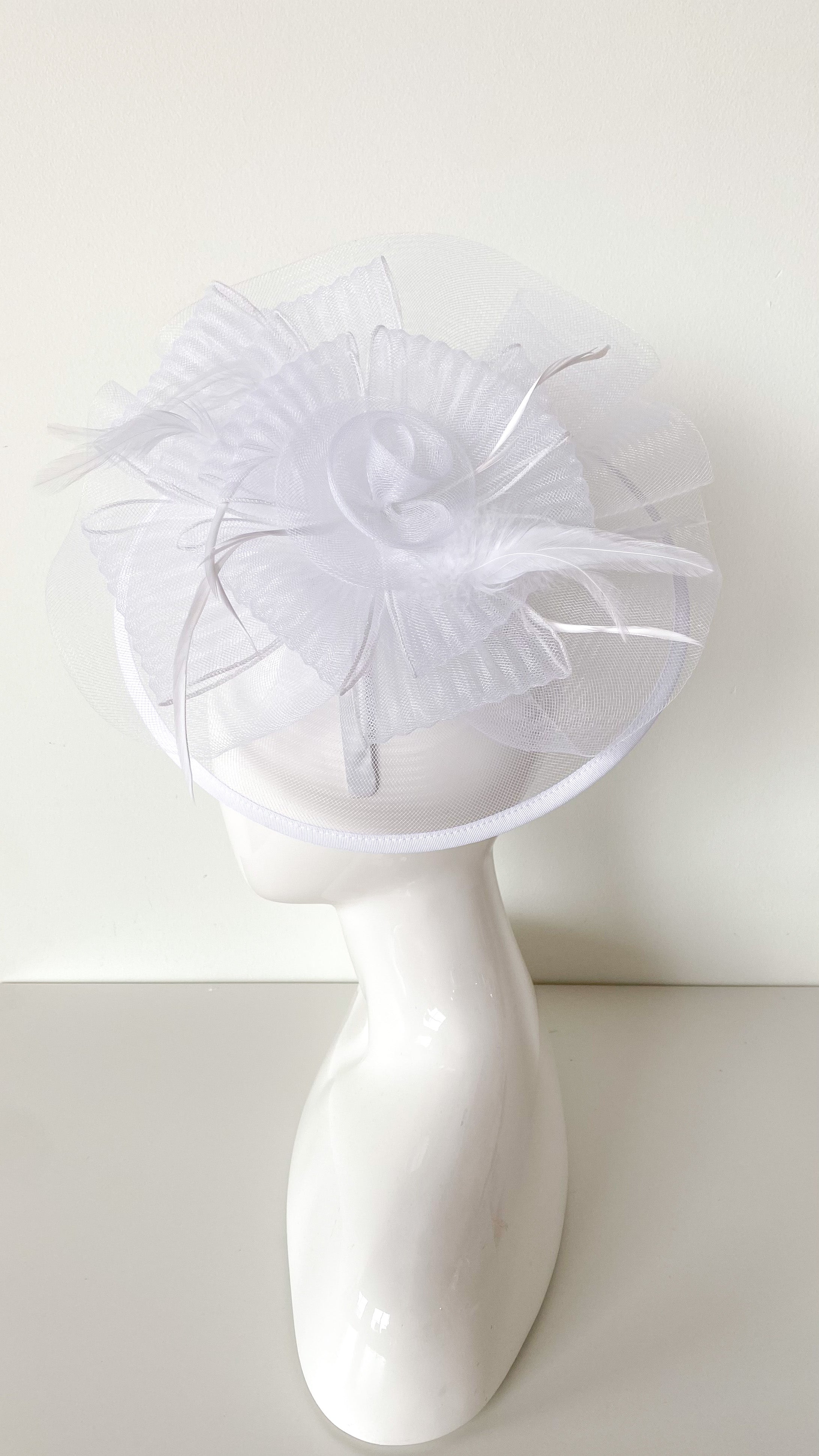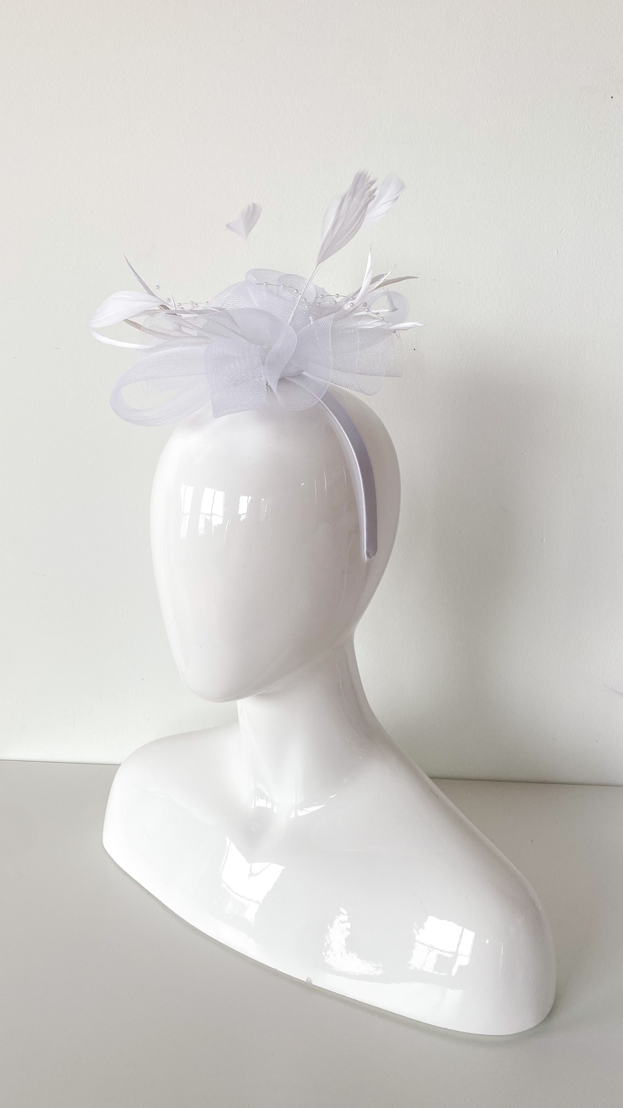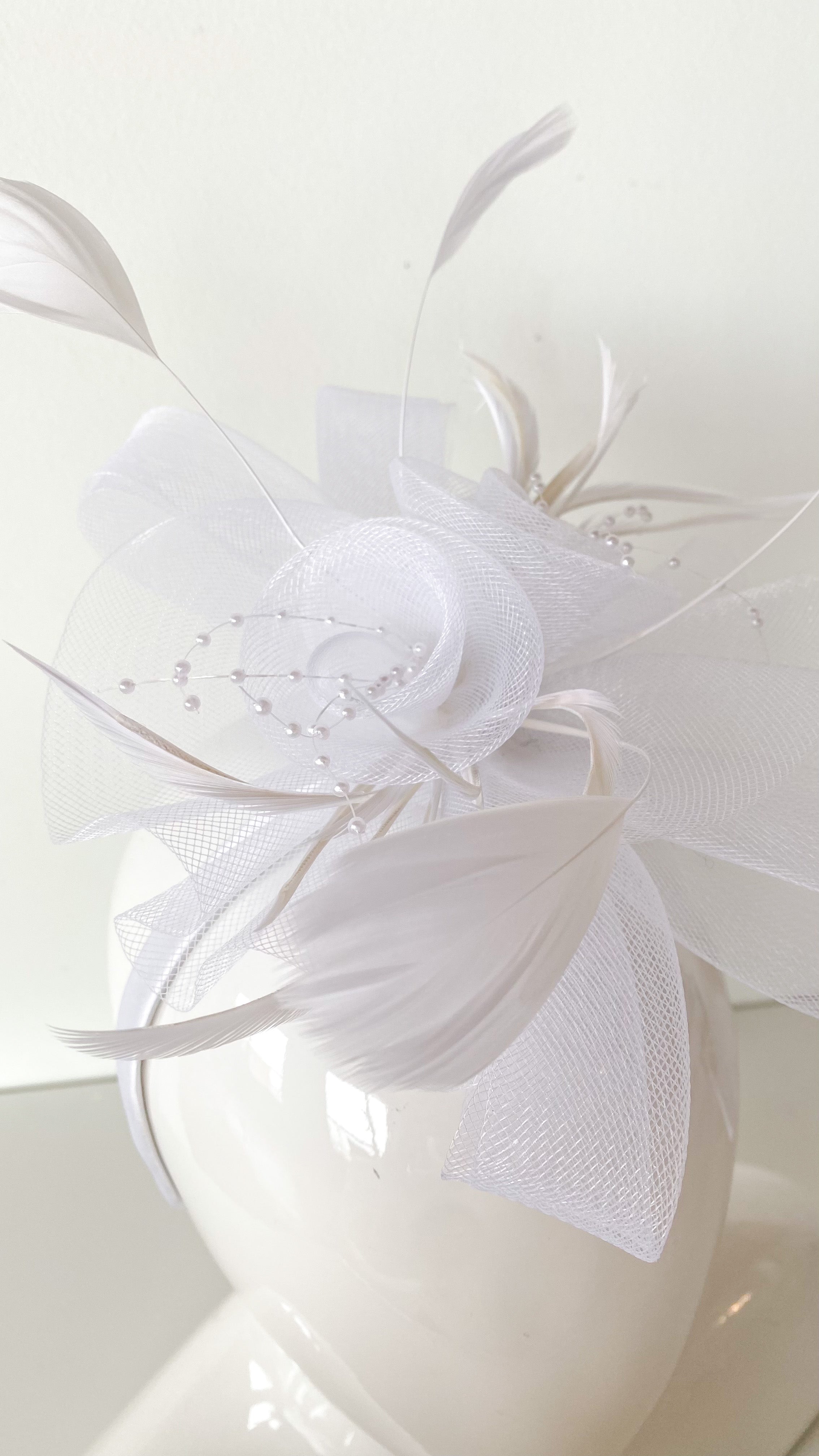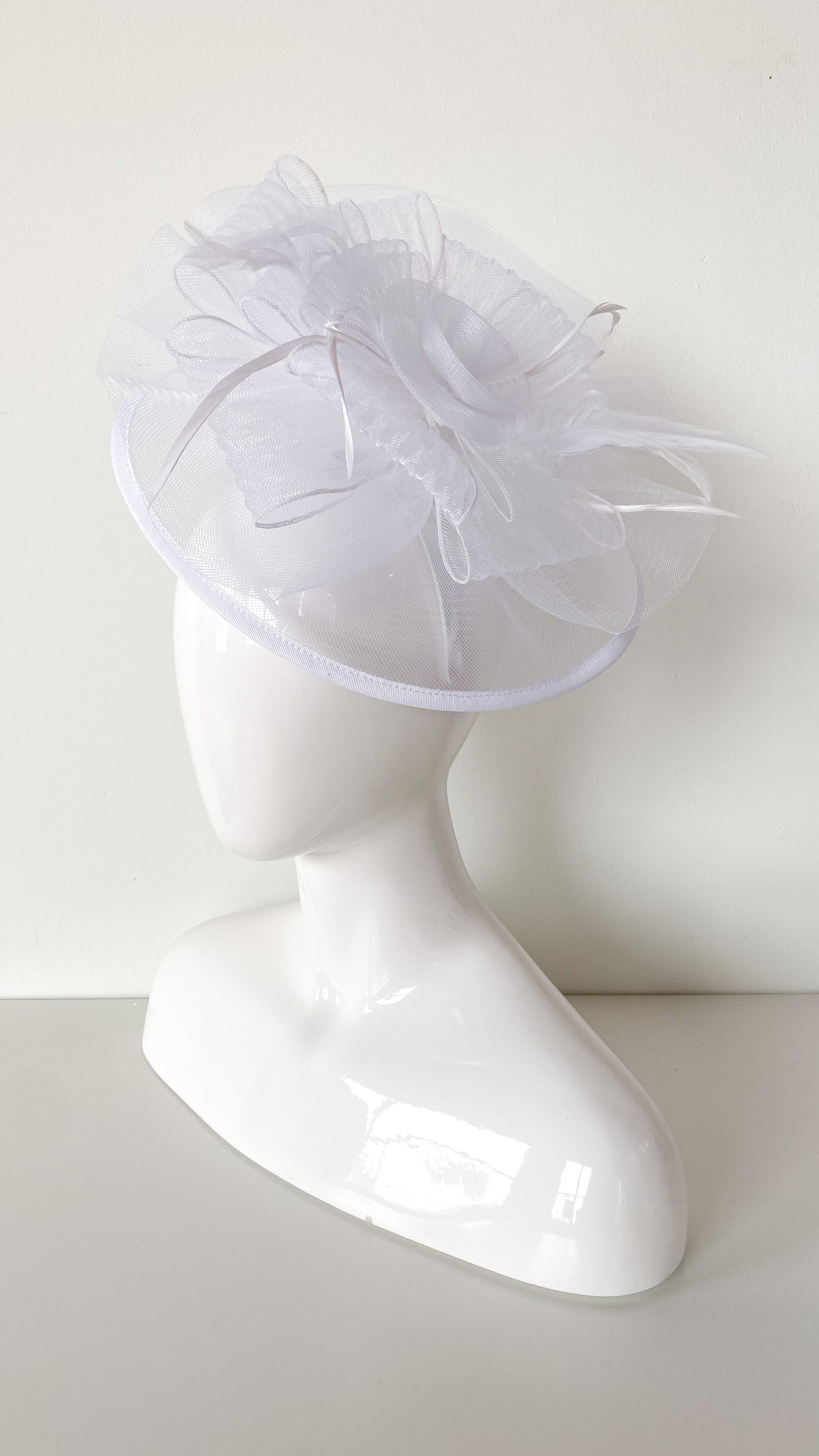 Headband with removable white flower made of netting. Flower and veil can be clipped to hair without headband. Available in a large or small size.